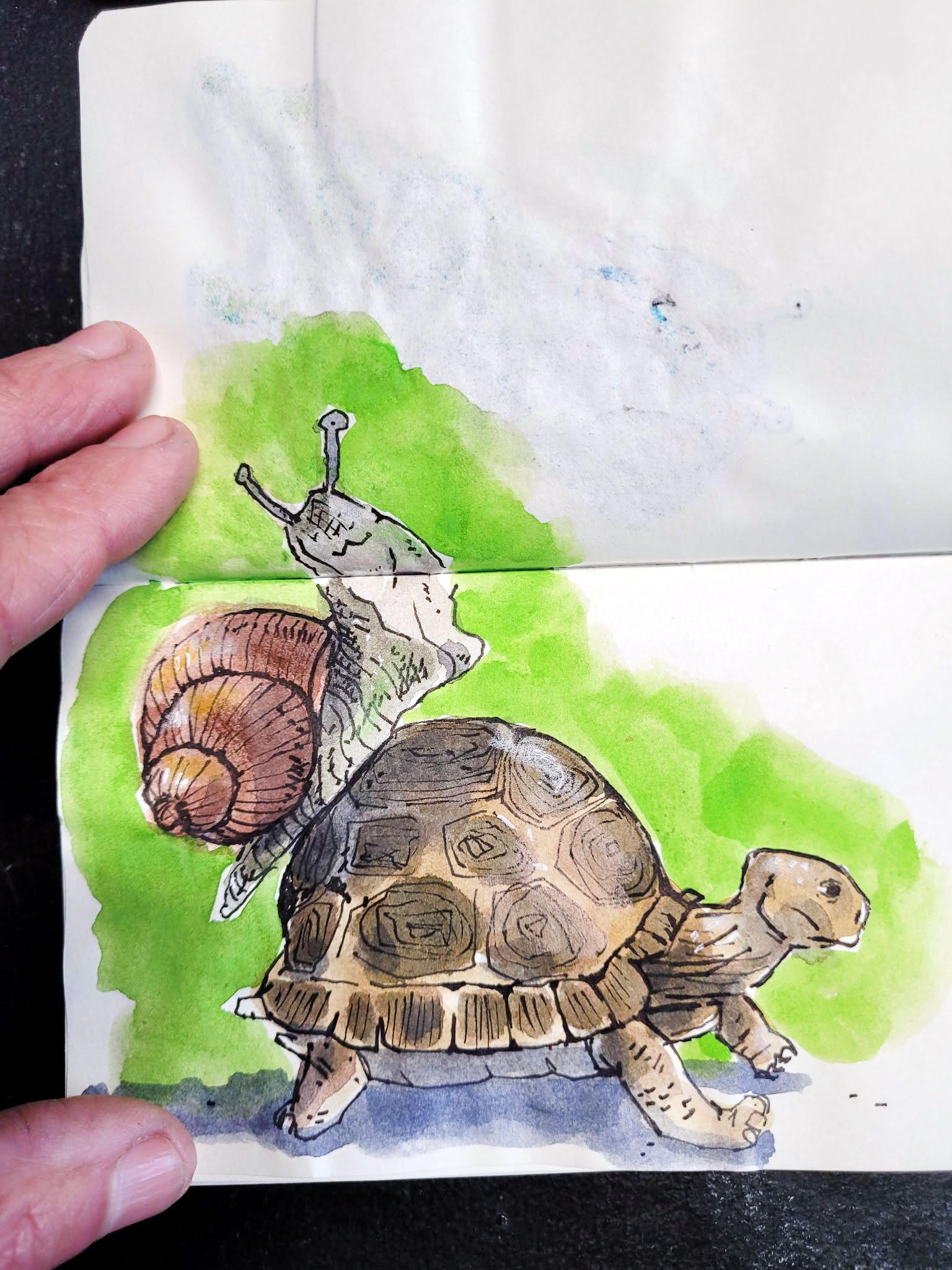 La tortue galope le plus vite qu’elle est capable. L’escargot a une belle frousse tellement ça va vite. Où vont-ils, seule la tortue le sait pour l’instant !