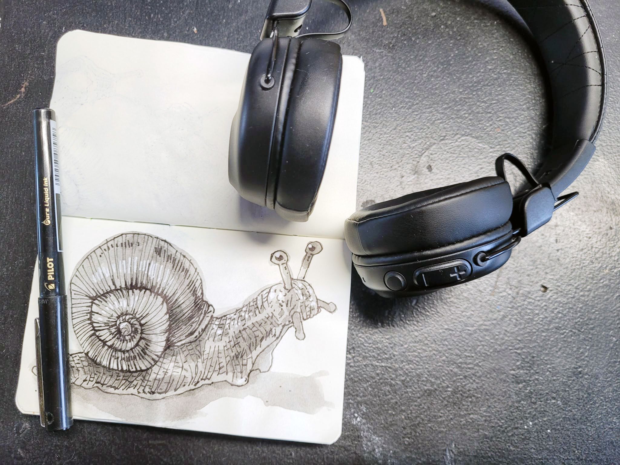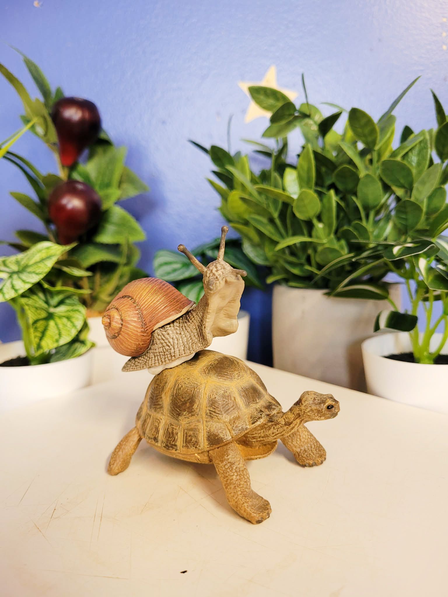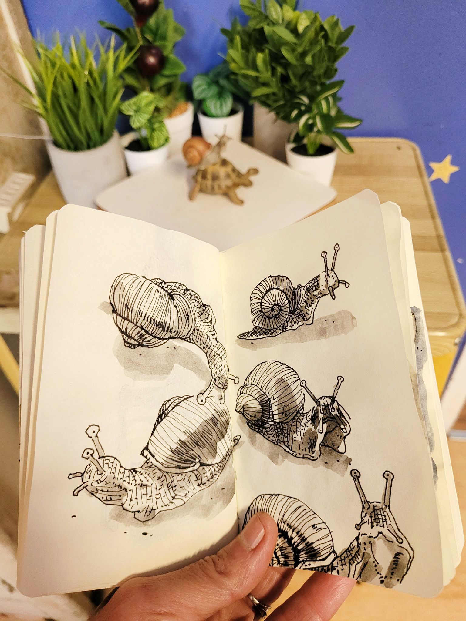 Les figurines de style Schleich et Papo sont des incontournables pour moi. Je me monte toujours de petites natures mortes dans mon atelier. Je me sers alors de ce prétexte pour du dessin d’observation. Ici, cette manie créatrice n’a pas fait exception. Une tortue, un escargot pour m’aider à illustrer mon propos…