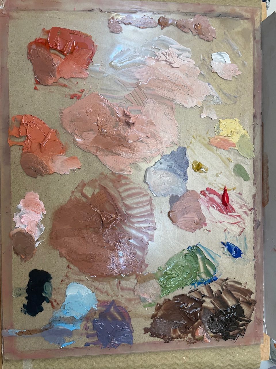 Oil paints, flat big brushes, thin brushes, iPad to follow the photo. I will use the medium recommended in future, but for now, only used the traditional linseed-oil, solvent and siccative.