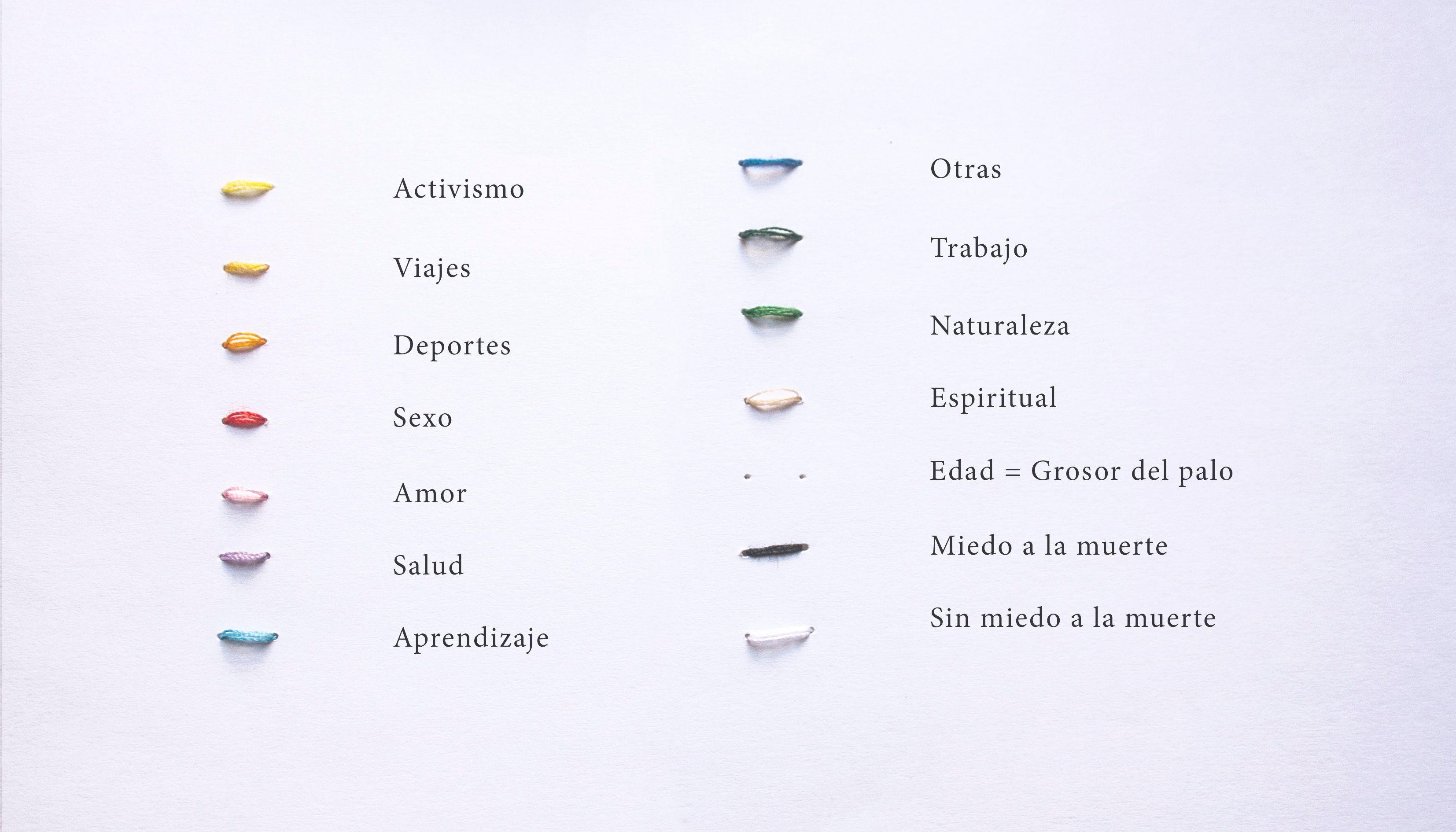 El código funciona de la siguiente manera: el diámetro del palo significa la edad y a las 11 tipologías de deseos se les ha asignado un color. Las categorías son: activismo, viajes, deporte, sexo, amor, salud, aprendizaje, acciones imposibles, trabajo, naturaleza y espiritual. Además, en uno de los extremos del palo también se representa si la persona tiene o no miedo a la muerte.
