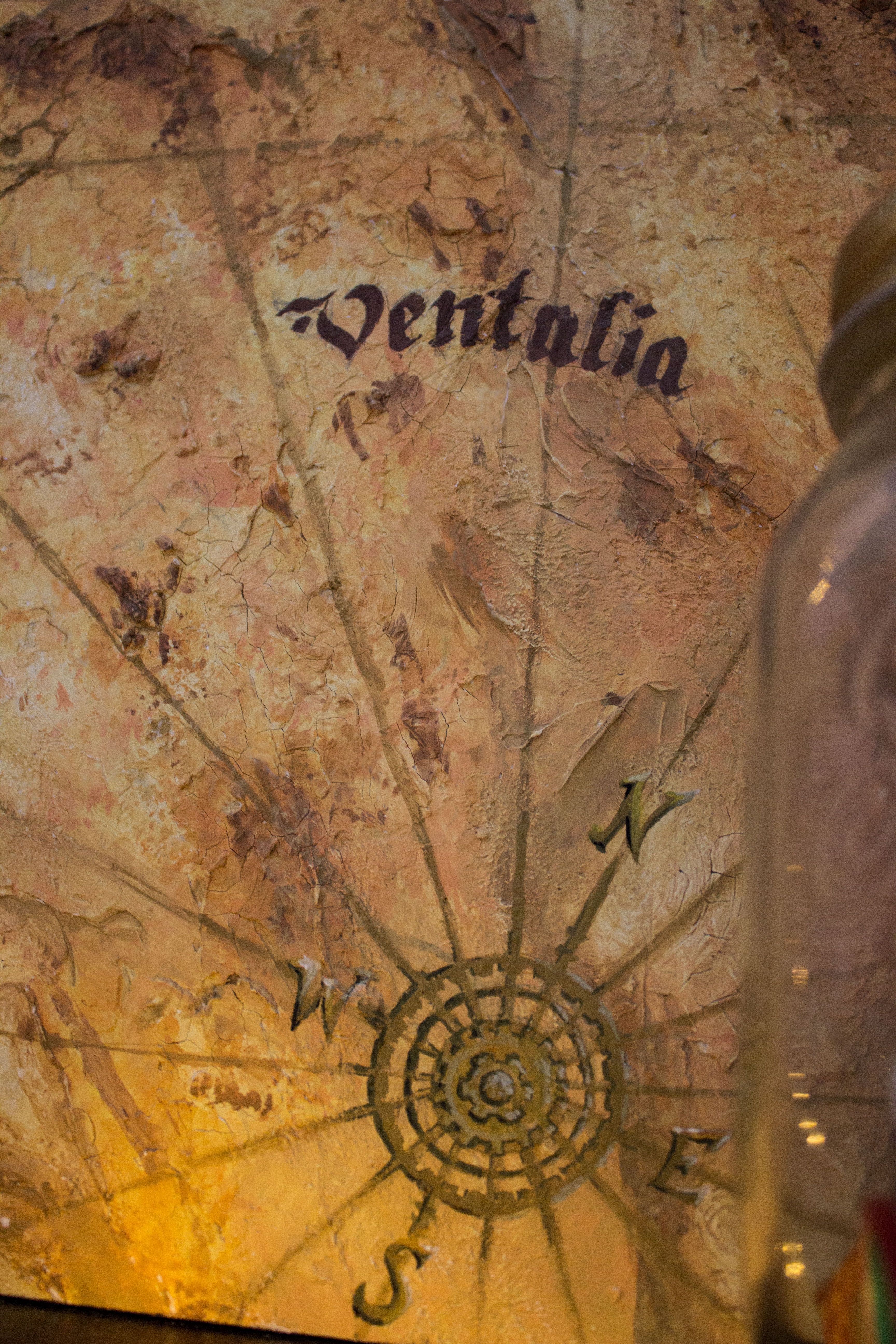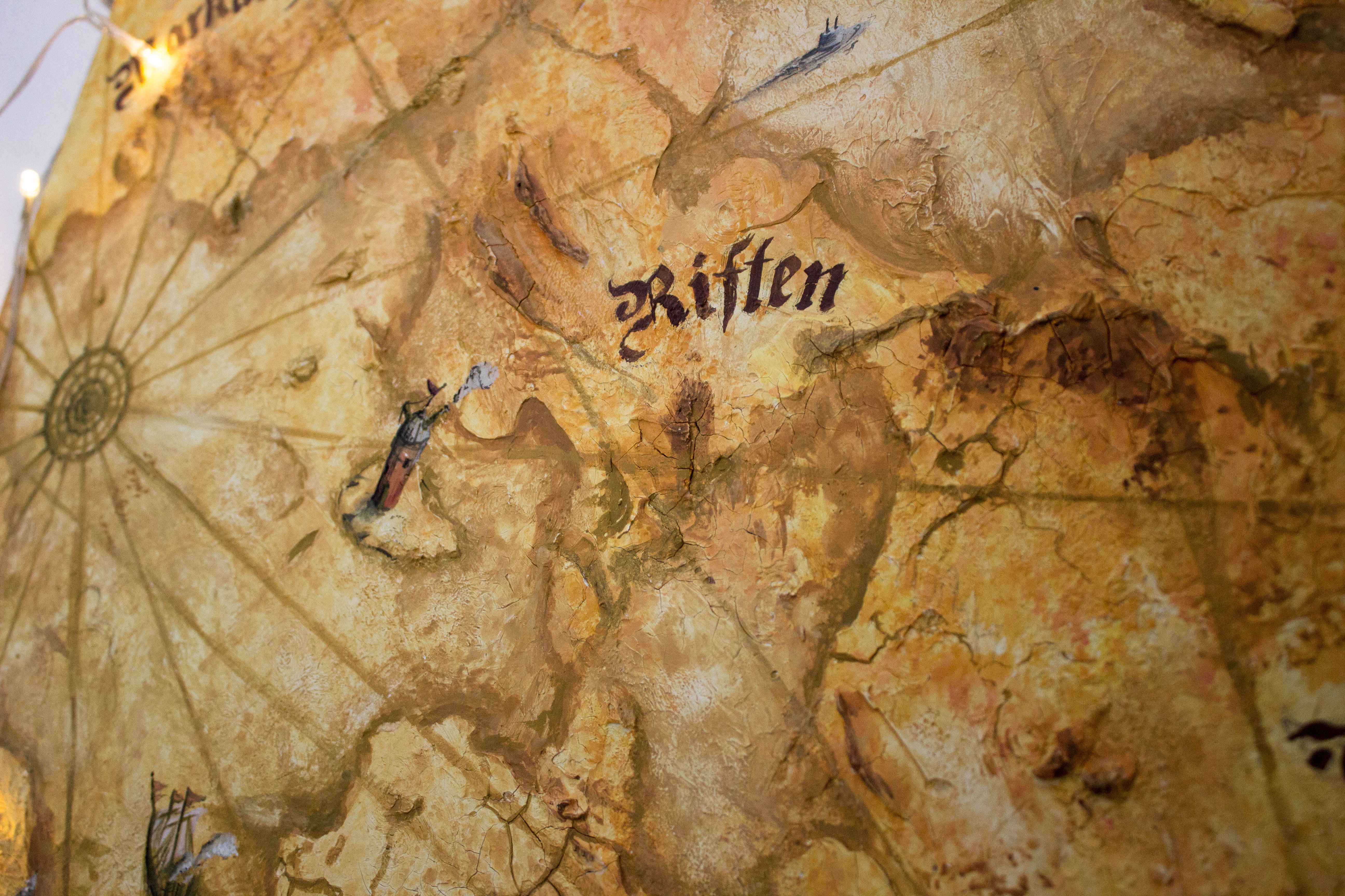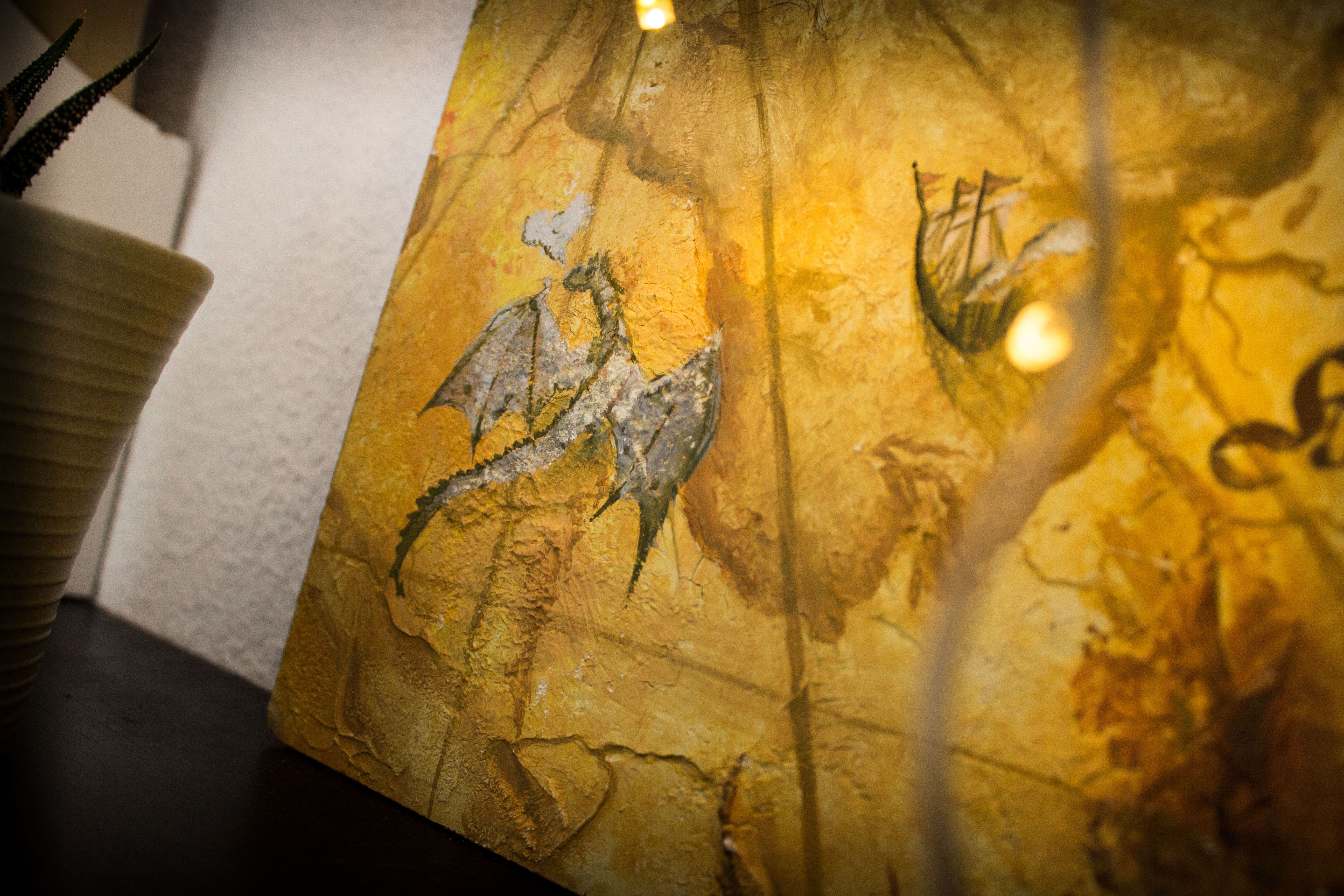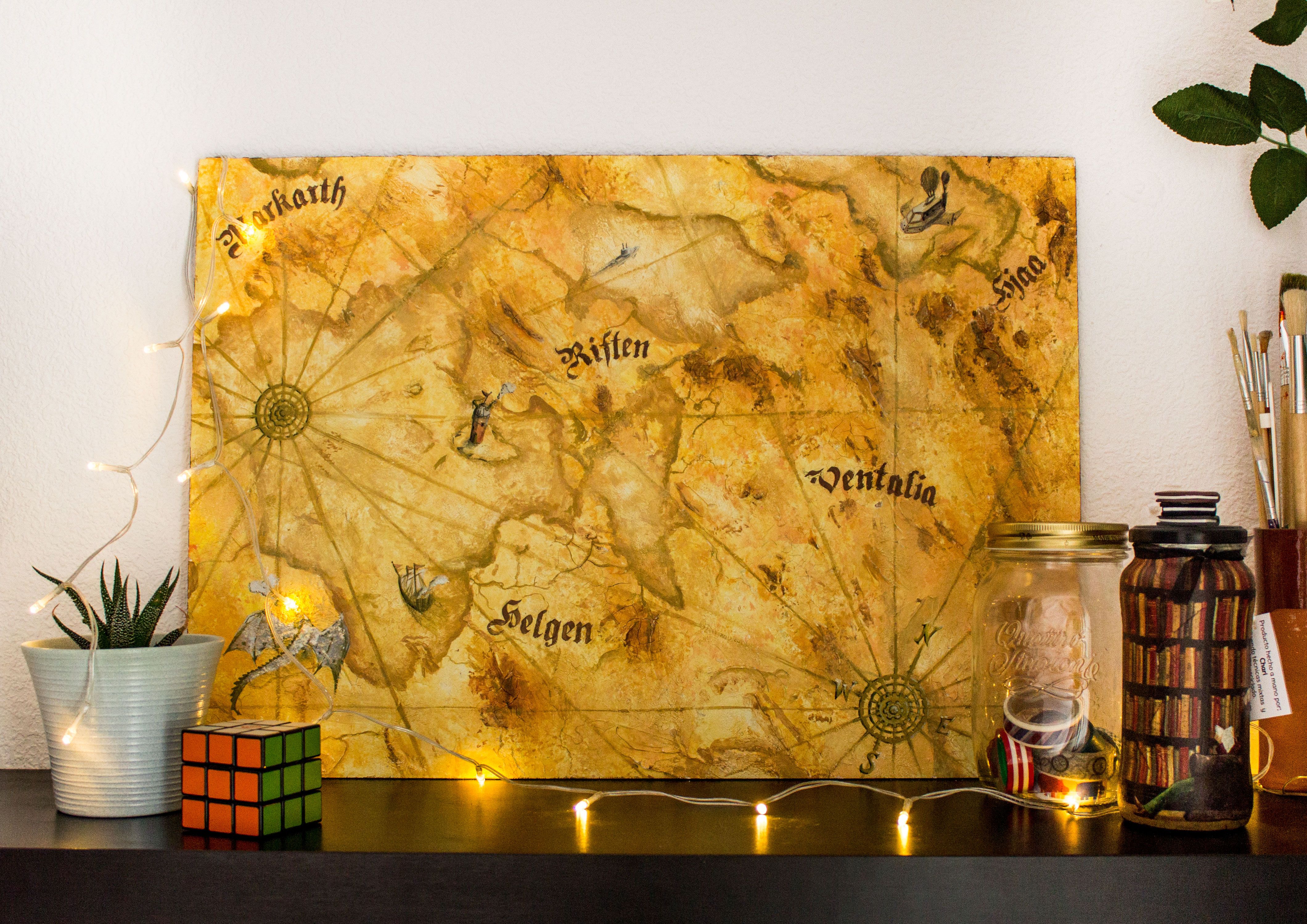 Diseño de un mapa nombres de ciudades no originales), usando una plancha de madera y aplicando de forma aleatoria masilla blanca aguada y después aplicarle el color siguiendo las formas creadas con acuarelas y temperas.