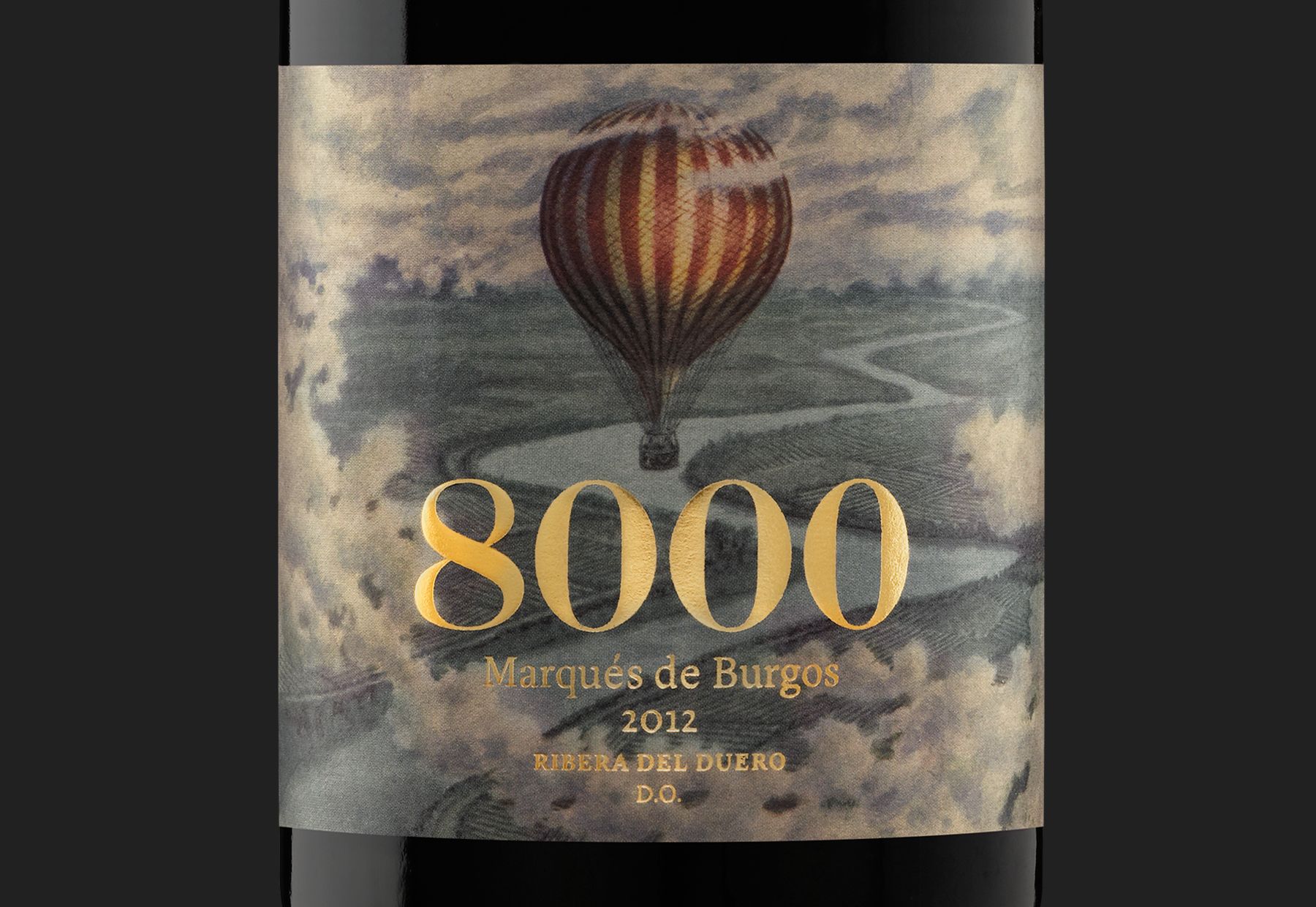 "8000" is Marqués de Burgos' most unique wine. Without sacrificing the brand's iconic globe, the Victorian-style illustration, framed by vaporous clouds, highlights the sublime and elevated character of this wine, made from 8,000 century-old vines.