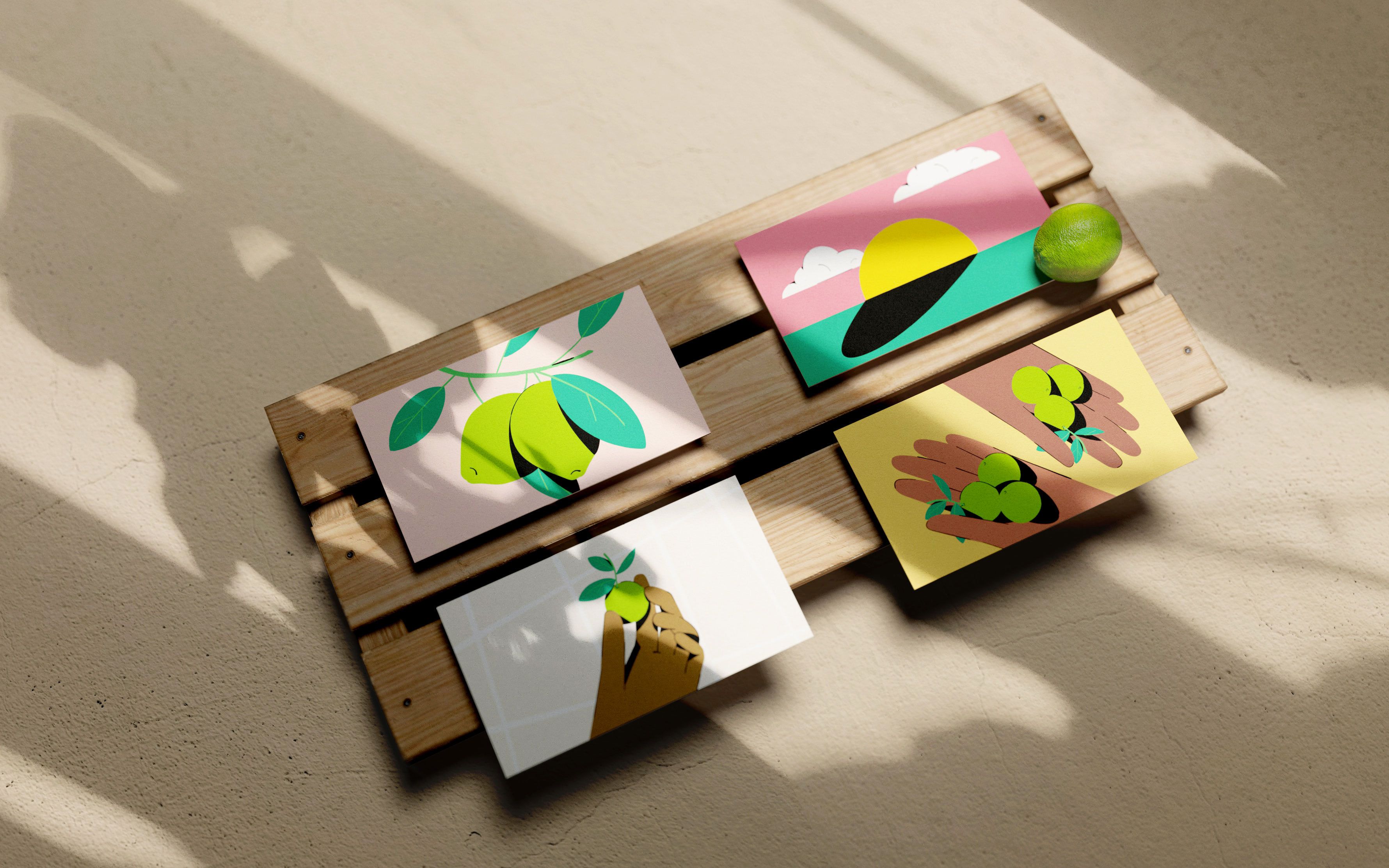 La identidad está basada en la idea de la inclusión de la comunidad de productores agrícolas, la tierra, el ambiente. Generamos una serie de ilustraciones que representan estas ideas y que a su vez pueden emplearse como patrones para otras ideas de la marca. La paleta de color es cálida y con tonos terrosos que tomamos para representar el lugar.