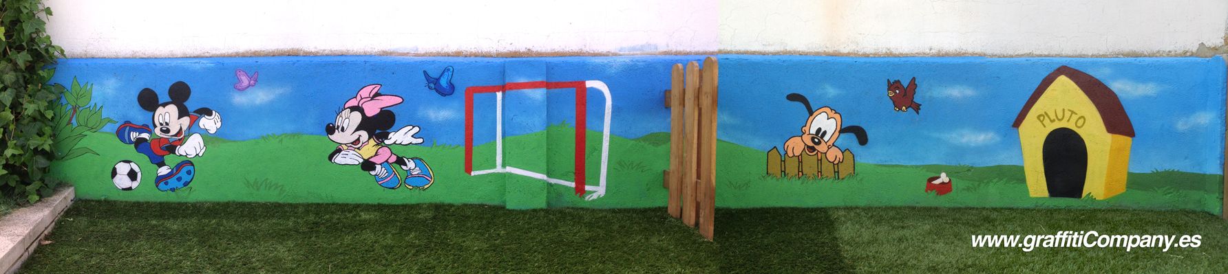 Mural infantil de Disney en exterior. Compuesto por Mickye, Minnie y Pluto, para decorar la parte del patio donde juega la pequeña de la casa.