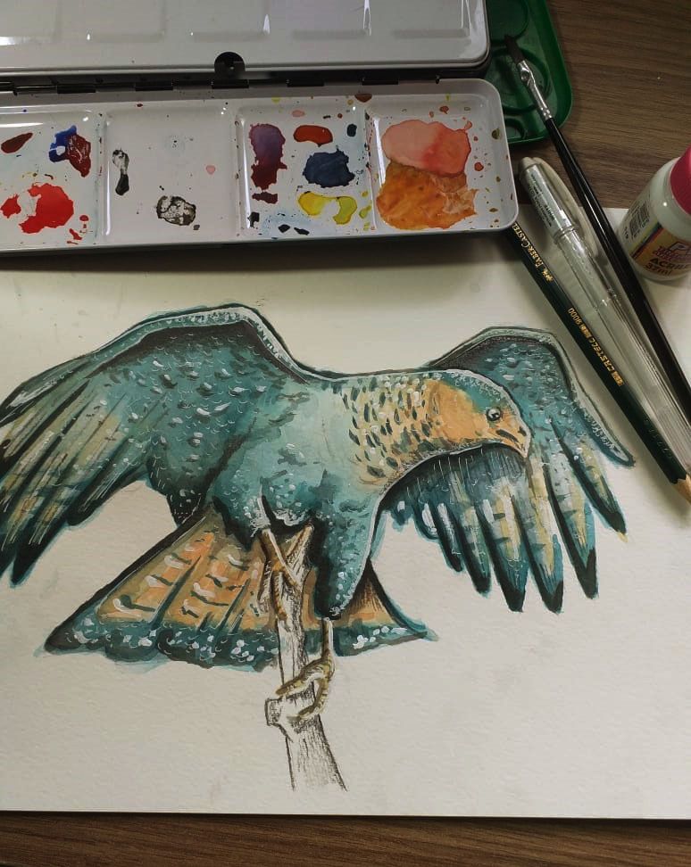 Carcará em processo: Usei Papel de 300g, tinta PVA (branca), Lápis 6B e Caneta branca.