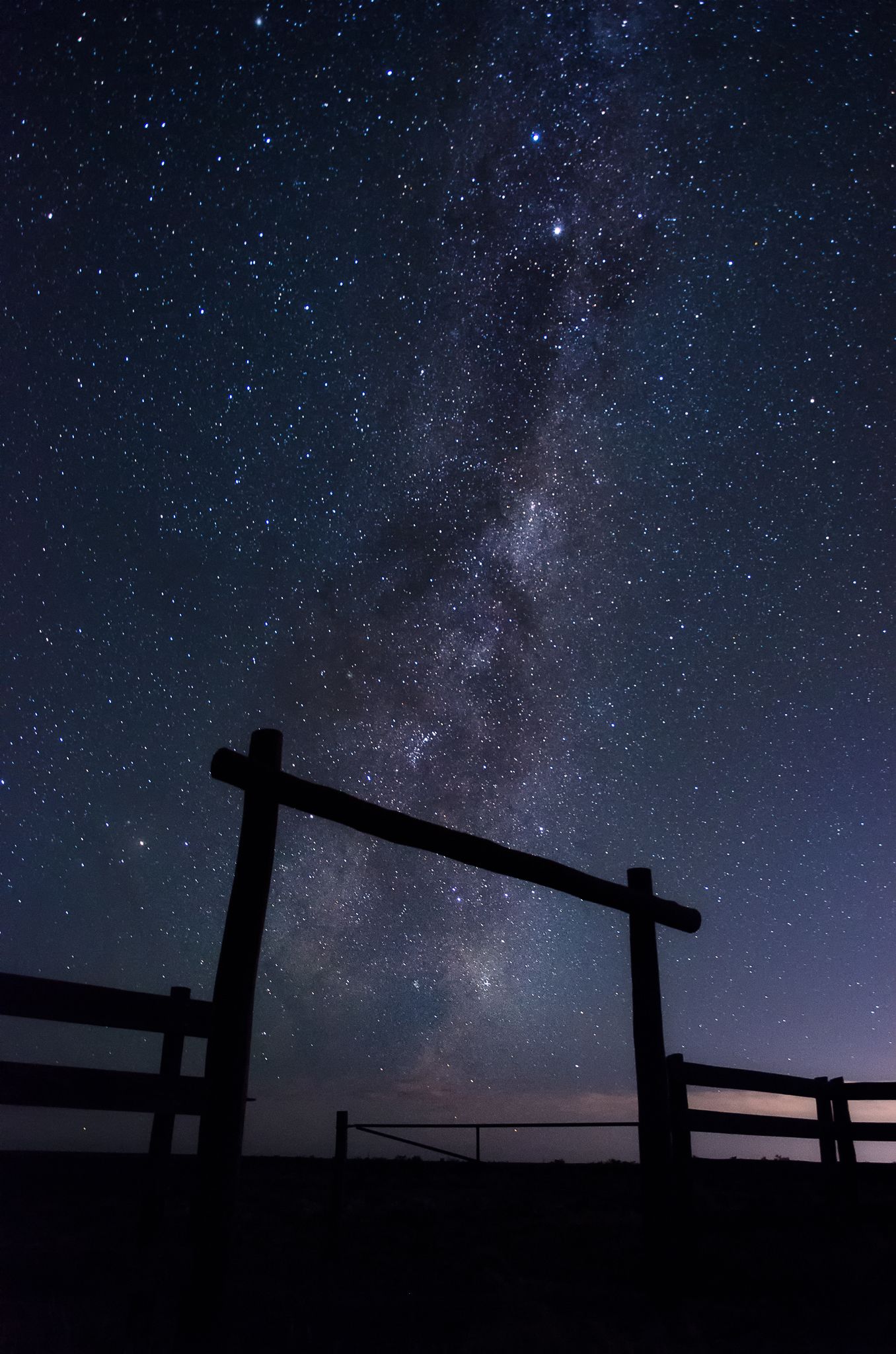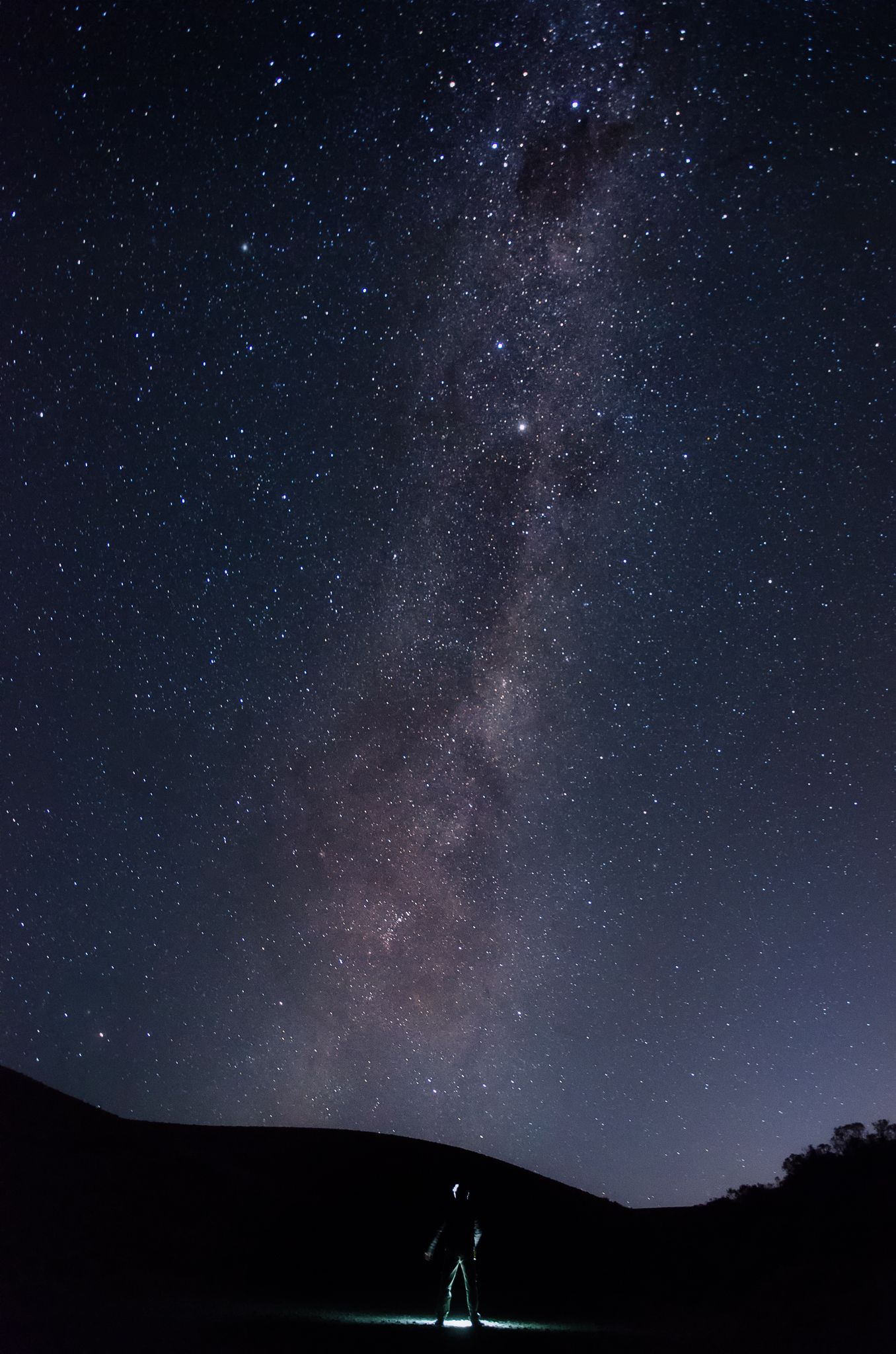 Pengamatan yang saya perhatikan di antara kedua pilihan tersebut adalah sapuan kuas magenta untuk menekankan Bima Sakti. Dalam kasus ini, pusat galaksi belum terlihat, dan memaksakan rona tersebut membuatnya sangat jelas sebagai bintik-bintik di langit. Dan berhati-hatilah agar tidak "membakar" titik cahaya di tanah dengan senter.