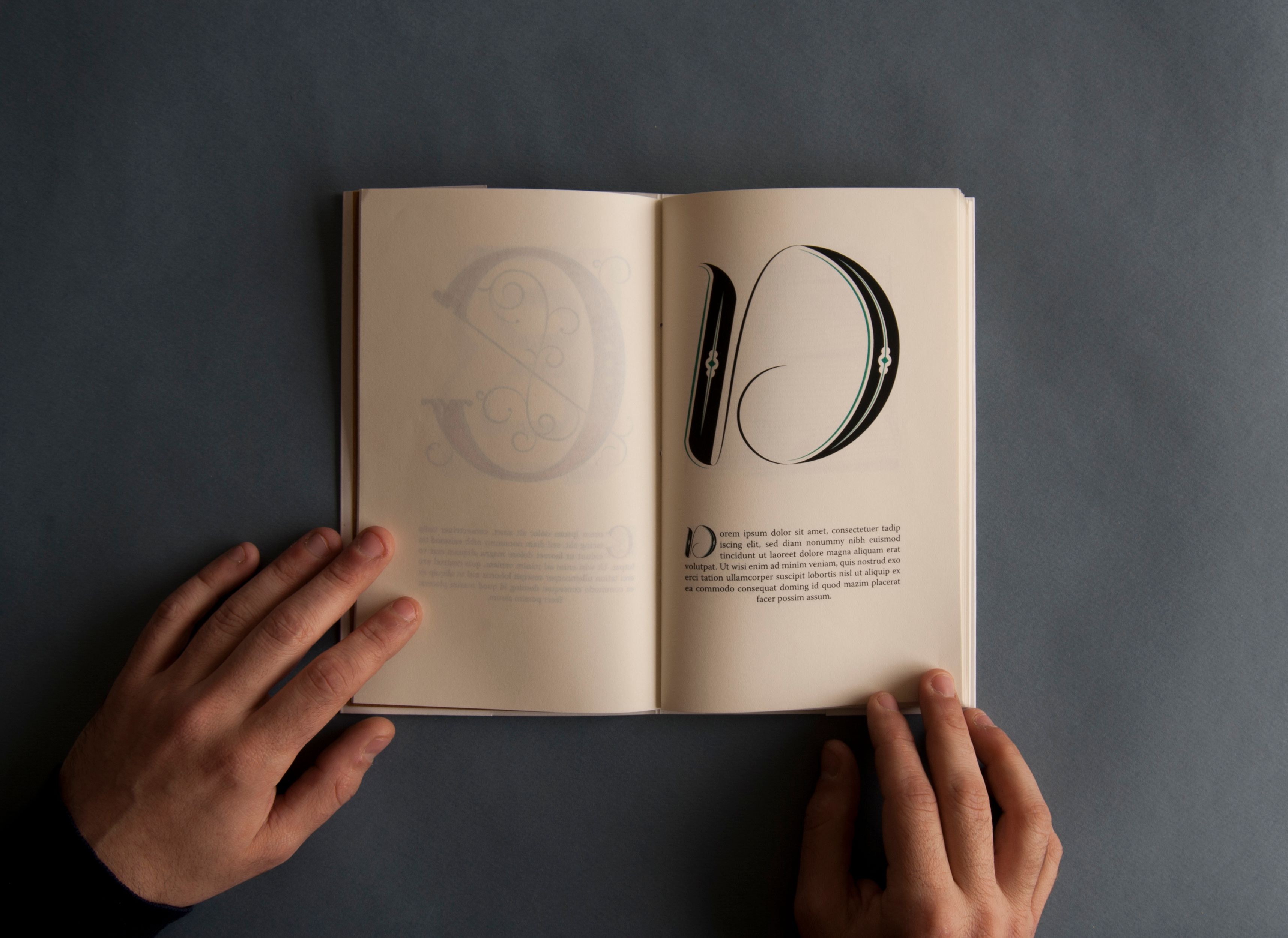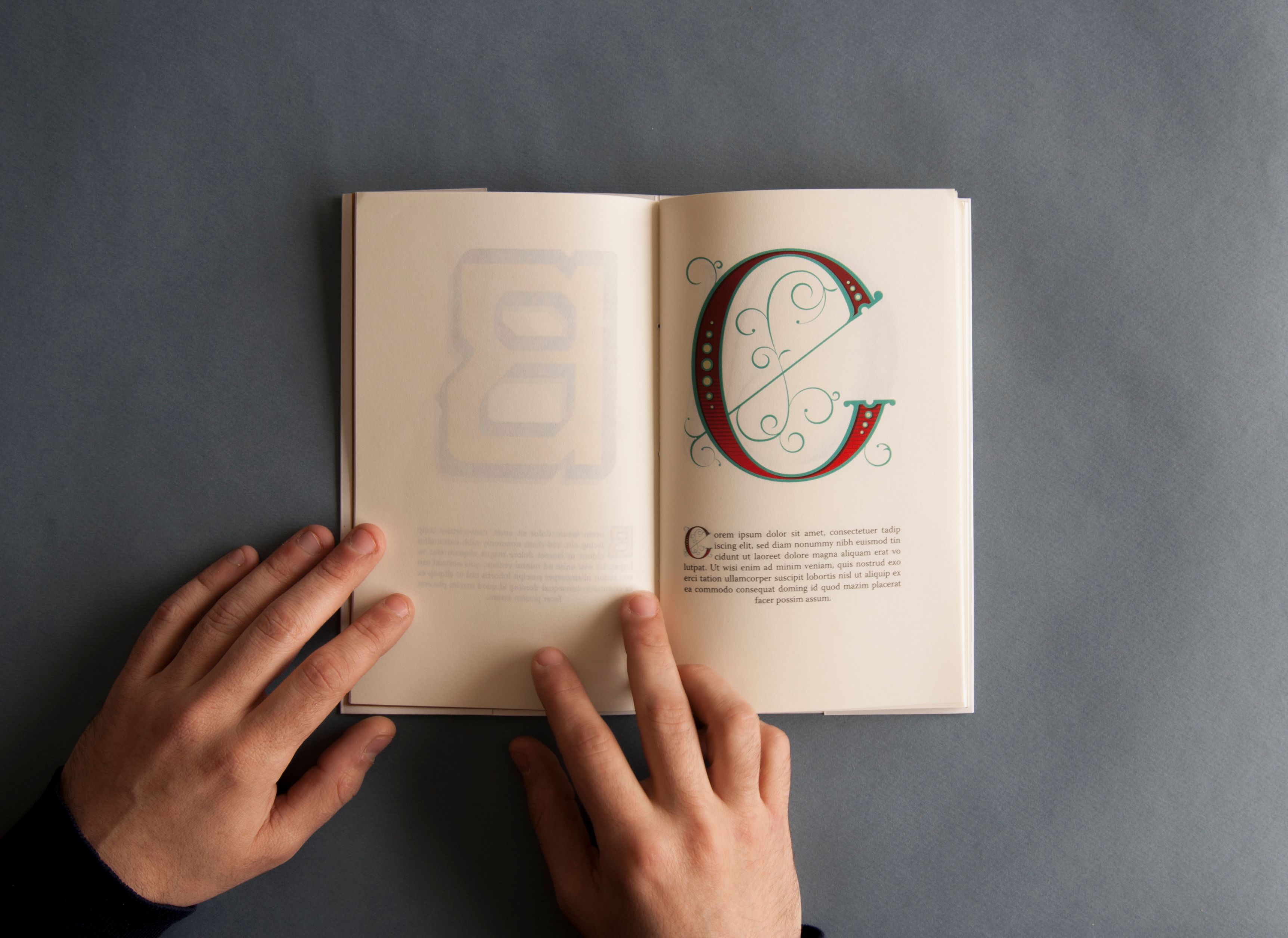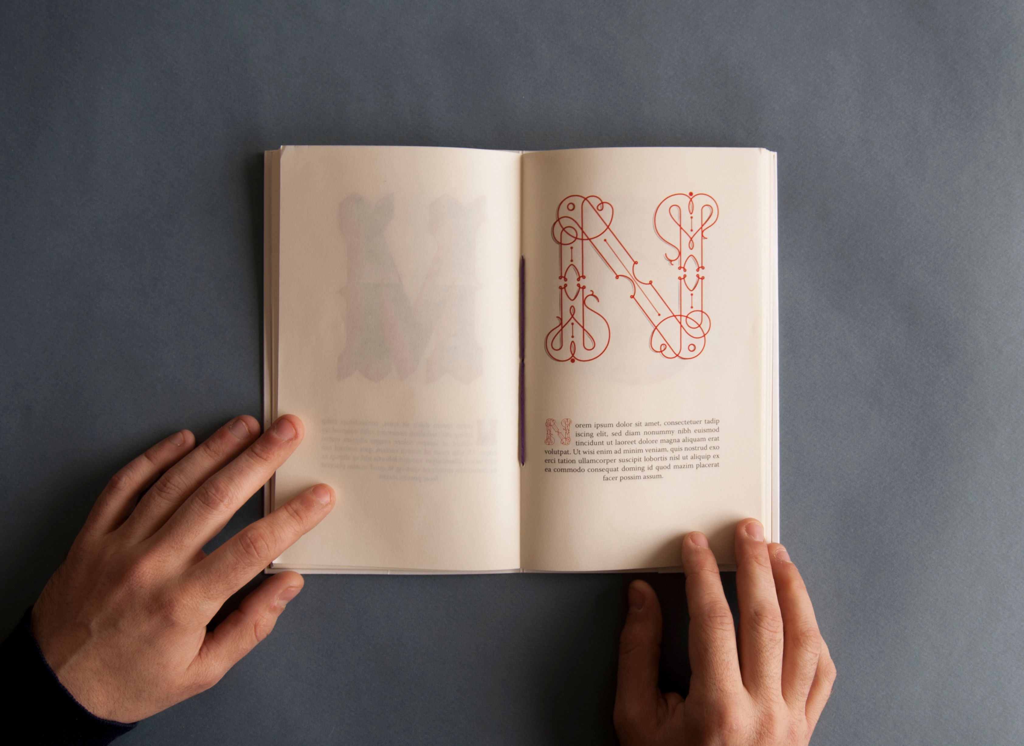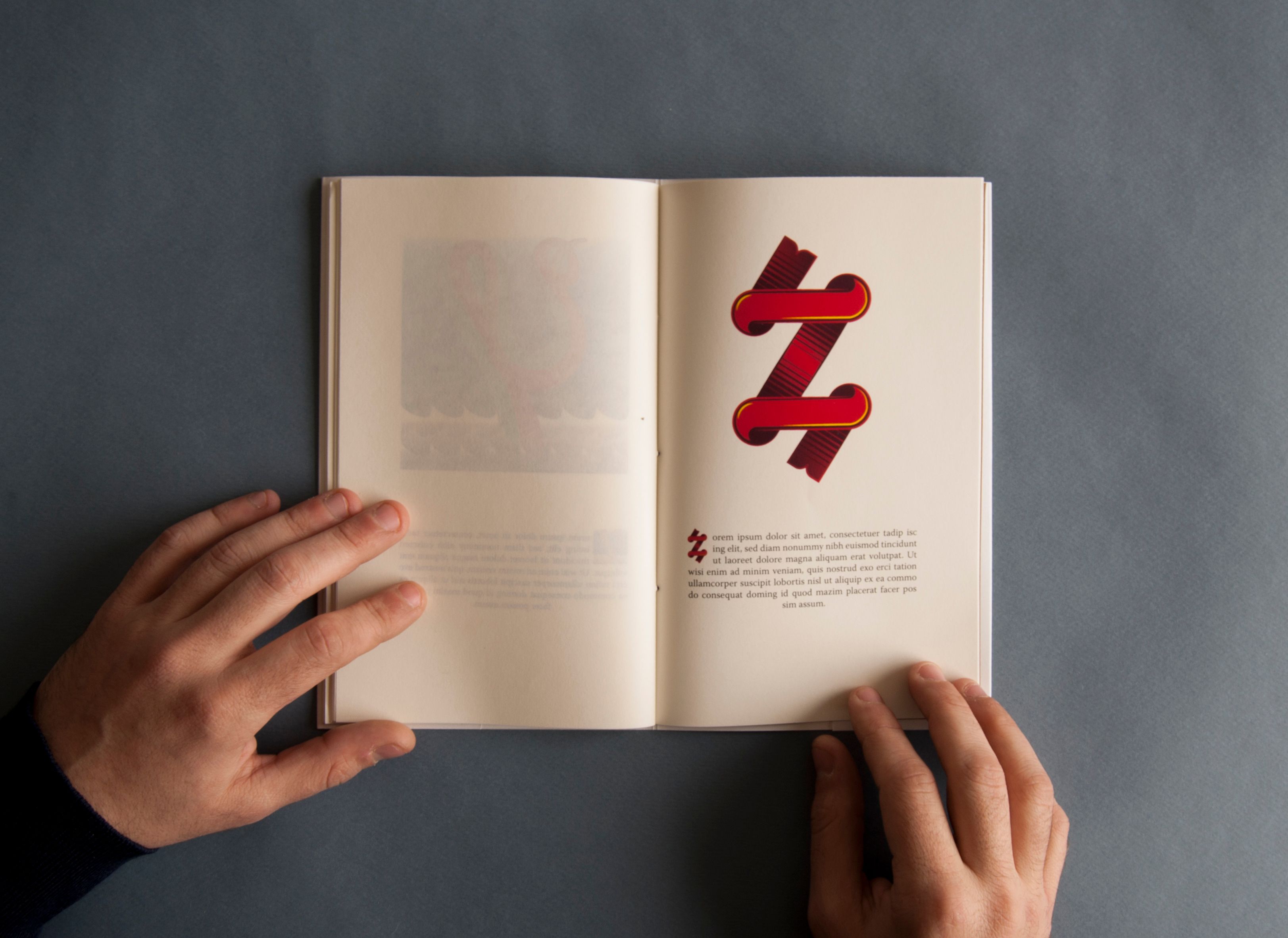 The project presents an alphabet of capital letters, hand-drawn and then digitized. The binding was done by hand, sewn with cotton thread.