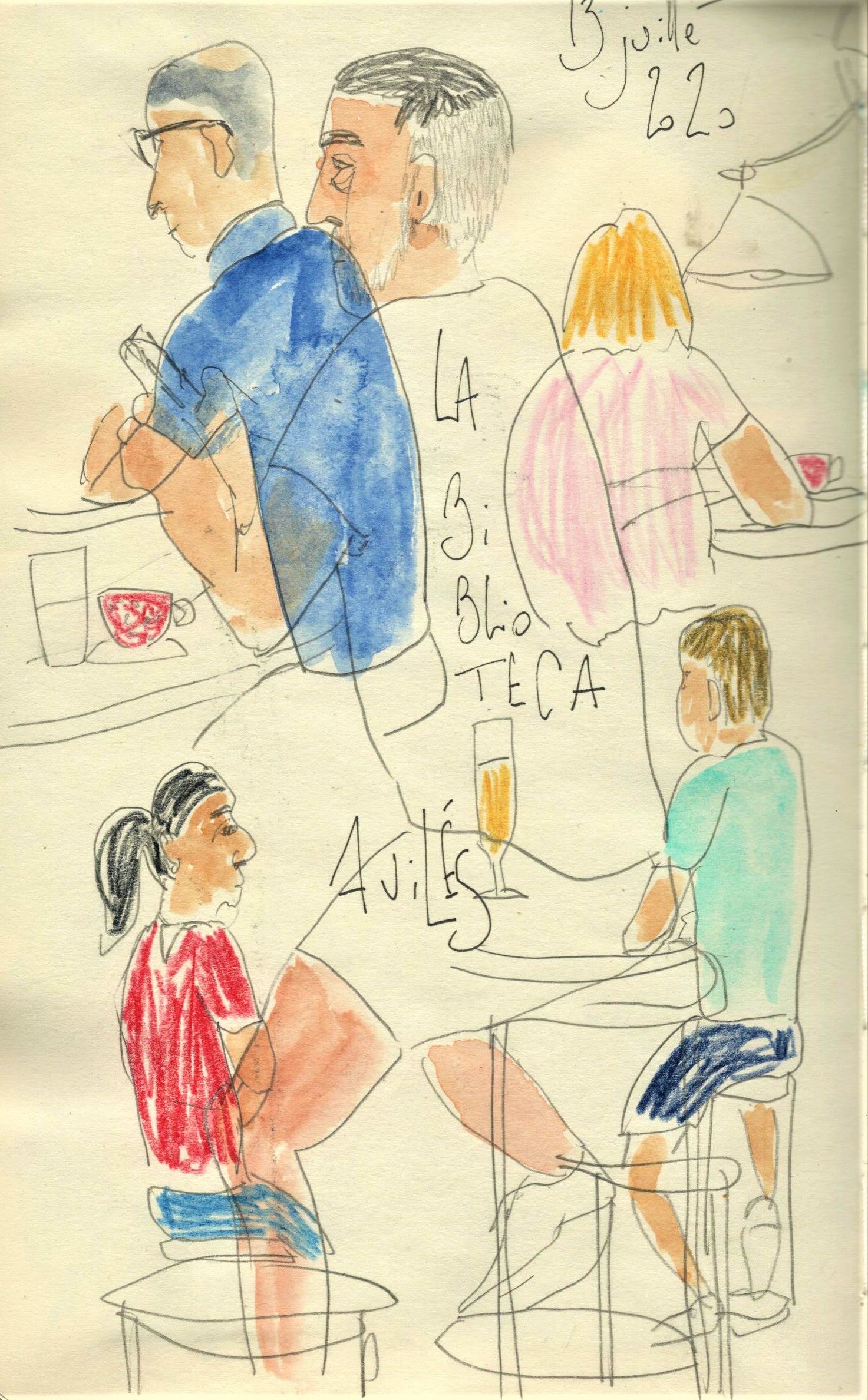 El primer cliente de la cafetería que dibujé en grande no me interesaba tanto. Seguí dibujando más gente para trabajar posturas además de traducir la afluencia en el lugar.