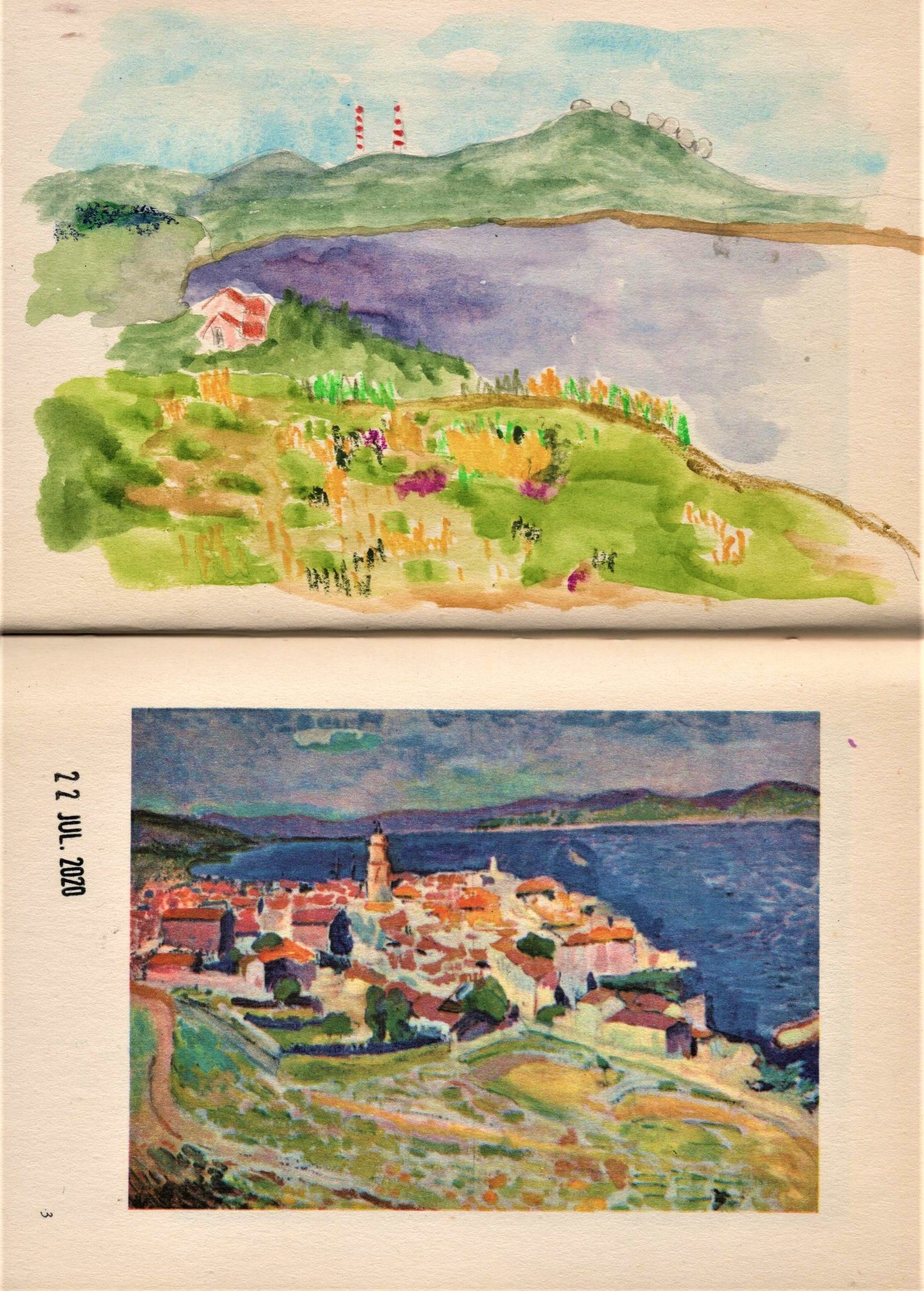 En esta página partí de un instantaneo de loto que tomé hace tiempo en Tokio. En lugar de rellenar la página de hojas, hice un ejercicio de perspectiva con un edificio verde pistacho de Gijón. También pegué un trozo de otro verde que me gustaba.