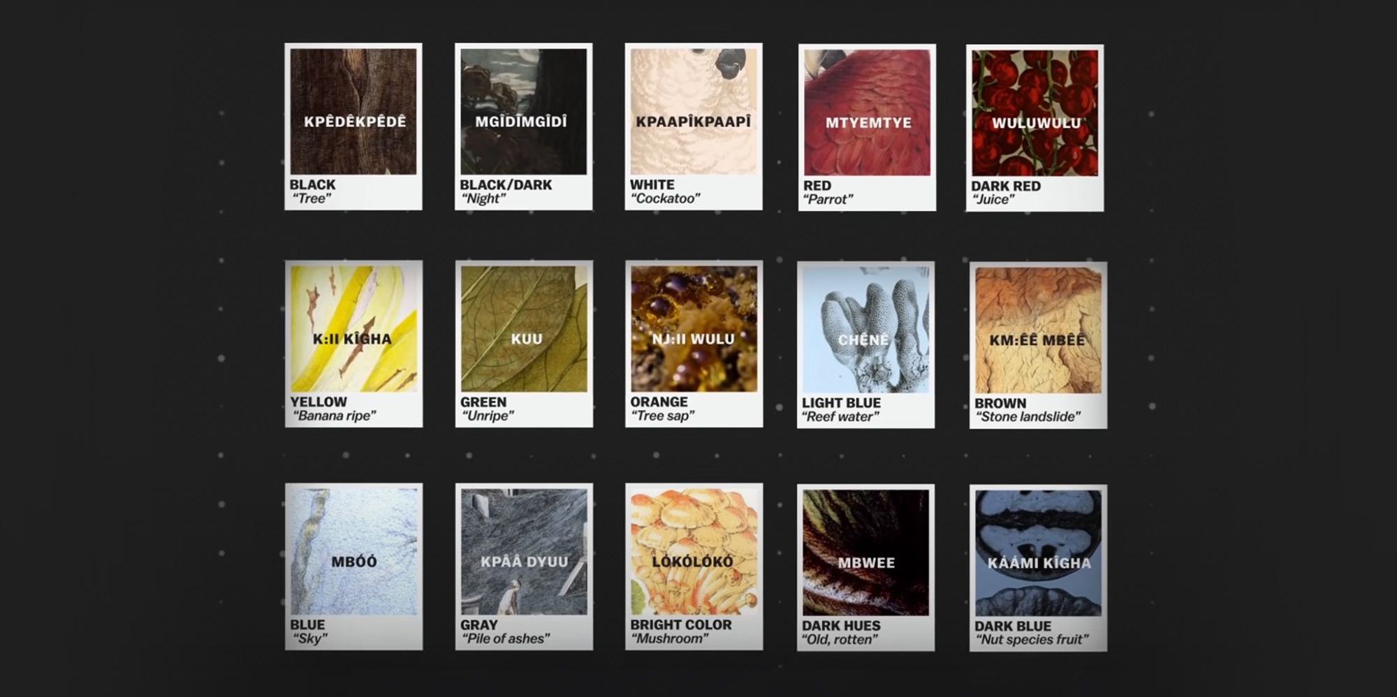 Nelle lingue che possiedono solo due termini per i colori, questi sono quasi sempre nero e bianco. Quando compare un terzo colore, solitamente è il rosso. Successivamente arrivano il verde o il giallo, mentre tra gli ultimi a essere nominati troviamo blu, marrone, rosa, arancione o grigio.