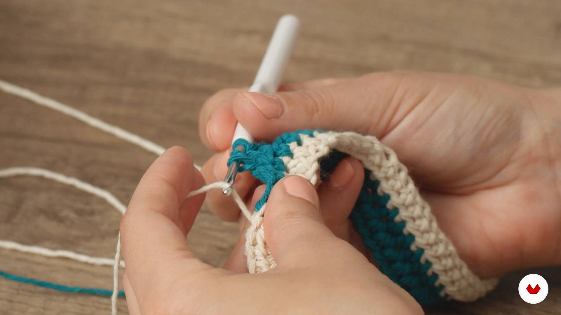 “Qui ribadisco di nuovo che è molto importante lasciare i fili sempre sul retro. E avere chiaro quale sia il retro in ogni riga. Perché se li lasciamo penzolanti dal davanti del lavoro. probabilmente ce ne accorgeremo nel giro successivo. Se riprendiamo il filo nel giro successivo. dal davanti avremo un salto di colore. dal lato dove dovremmo avere il disegno perfetto quindi si vedrà e apparirà strano. Quindi questo è qualcosa di molto importante da tenere a tenere sempre i fili penzolanti sul retro. Lo dirò fino allo sfinimento. Adesso cambiamo il colore a blu petrolio. Quindi chiudiamo l’u...”
