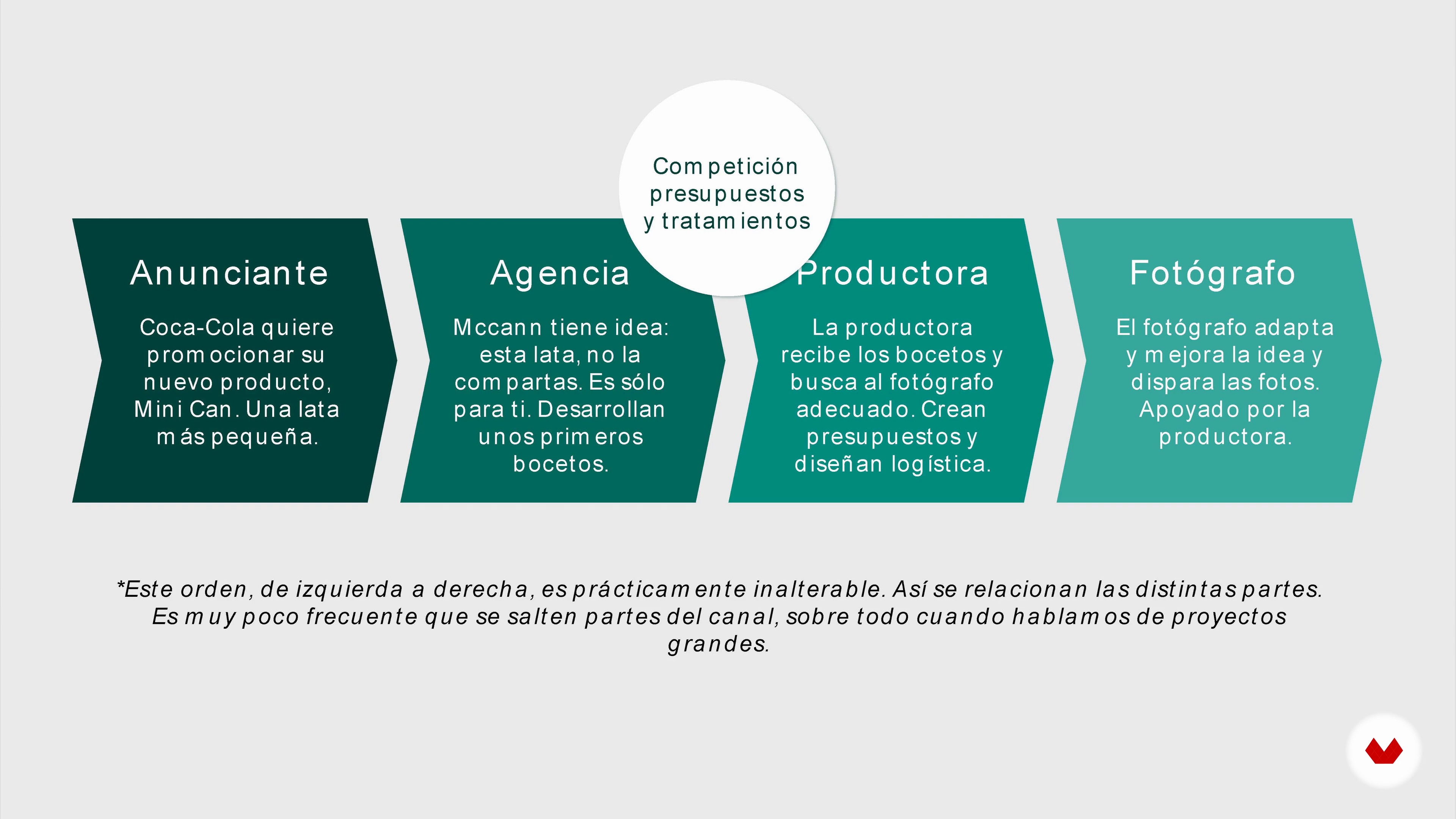 “Regole del gioco, trattamenti e budget Adesso vi spiegherò le regole del gioco. Qual è il meccanismo attraverso il quale è possibile arrivare a vincere un progetto? Perché non è così facile come ti ho spiegato, ok? È vero che il la relazione avviene sempre, come ti ho detto, inserzionista, agenzia, produttore e fotografo, ma c'è un piccolo dettaglio, perché qui in mezzo, tra l'agenzia e la società di produzione, C'è una competizione feroce in cui tre società di produzione e tre fotografi si sfidano. per vincere il progetto, Va bene? Si tratta di una competizione in cui dovranno presentare u...”