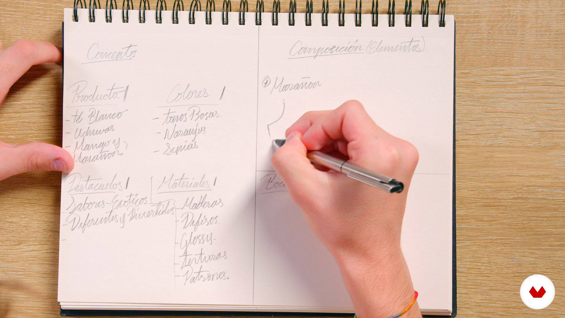 “Ora che abbiamo il nostro mood board di direzione artistica creato. proseguiamo con gli schizzi. Amo sottolineare alcune parole e aspetti importanti. tra queste. qualità del prodotto. colori. elementi evidenziati nel brief e materiali che pensiamo di includere nel nostro set. Nelle caratteristiche del prodotto. voglio sottolineare che contiene tè bianco. uchuas. mango e anacardo. Nei colori. si evidenziano toni rosa il Brief indicava che potevamo usare toni rosa. ma penso che potremmo includere arancioni e toni seppia. Questo. per i colori che il mango e l'anacardo ci possono offrire. Vorre...”