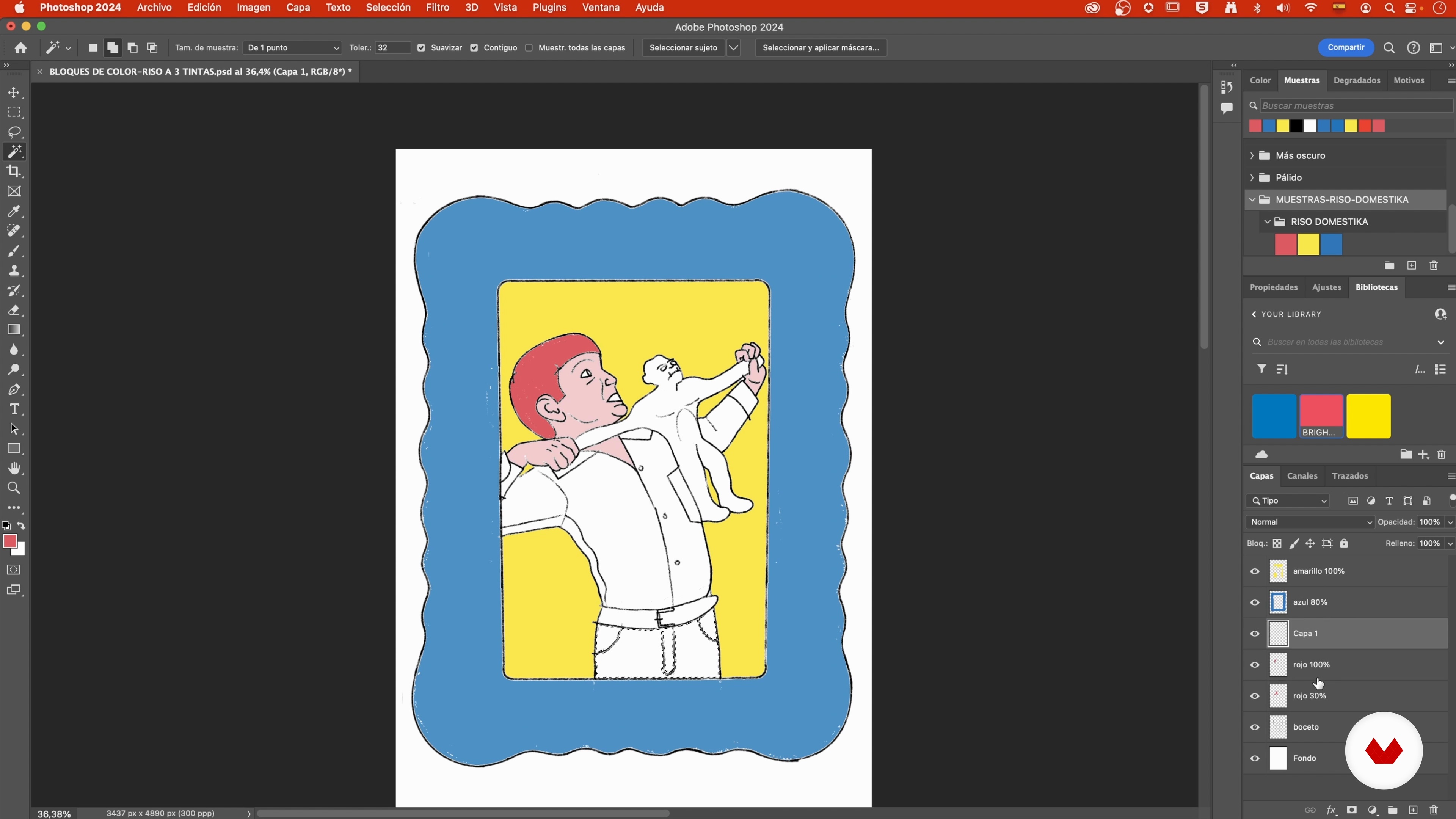 “Vi mostrerò come lavorare in Photoshop con una palette di colori ridotta e come organizzare la nostra illustrazione in livelli, applicando diverse opacità e sovrapposizioni. Vedrete come creare una simulazione risografica del risultato finale. ”
