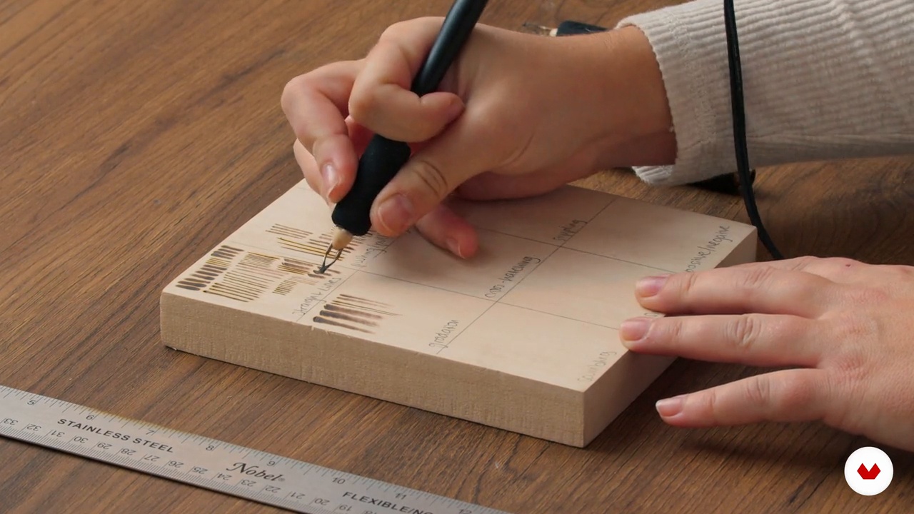 “È il momento di esplorare le diverse punte per la pirografia, tra cui punte piene e punte a filo metallico per ombreggiature, dettagli e puntinismo. Imparerai tecniche come linee dritte e curve, gradazioni e puntinatura su un pezzo di prova, concentrandoti sul controllo del calore e sulla versatilità della punta.”