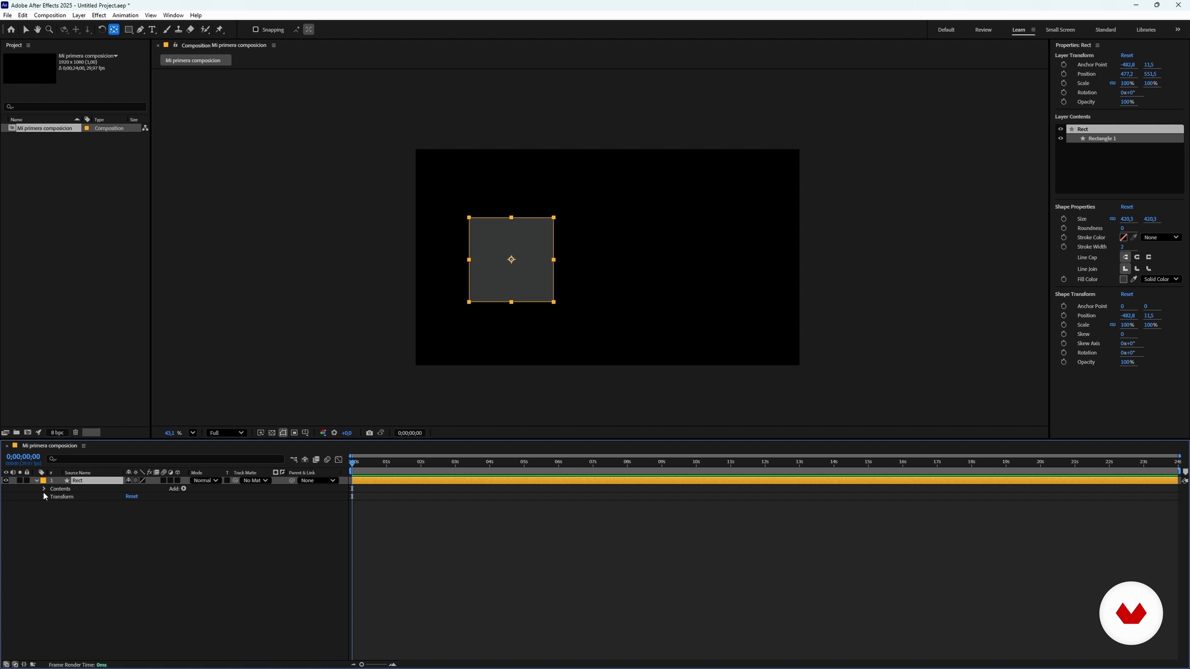 “Percorrerai l’interfaccia base di After Effects: pannello Progetto per importare asset, Composizione per la preview e Timeline per lavorare a livelli. Creerai una composizione, disegnerai forme semplici e animerai posizione, scala, rotazione e opacità usando i keyframe.”