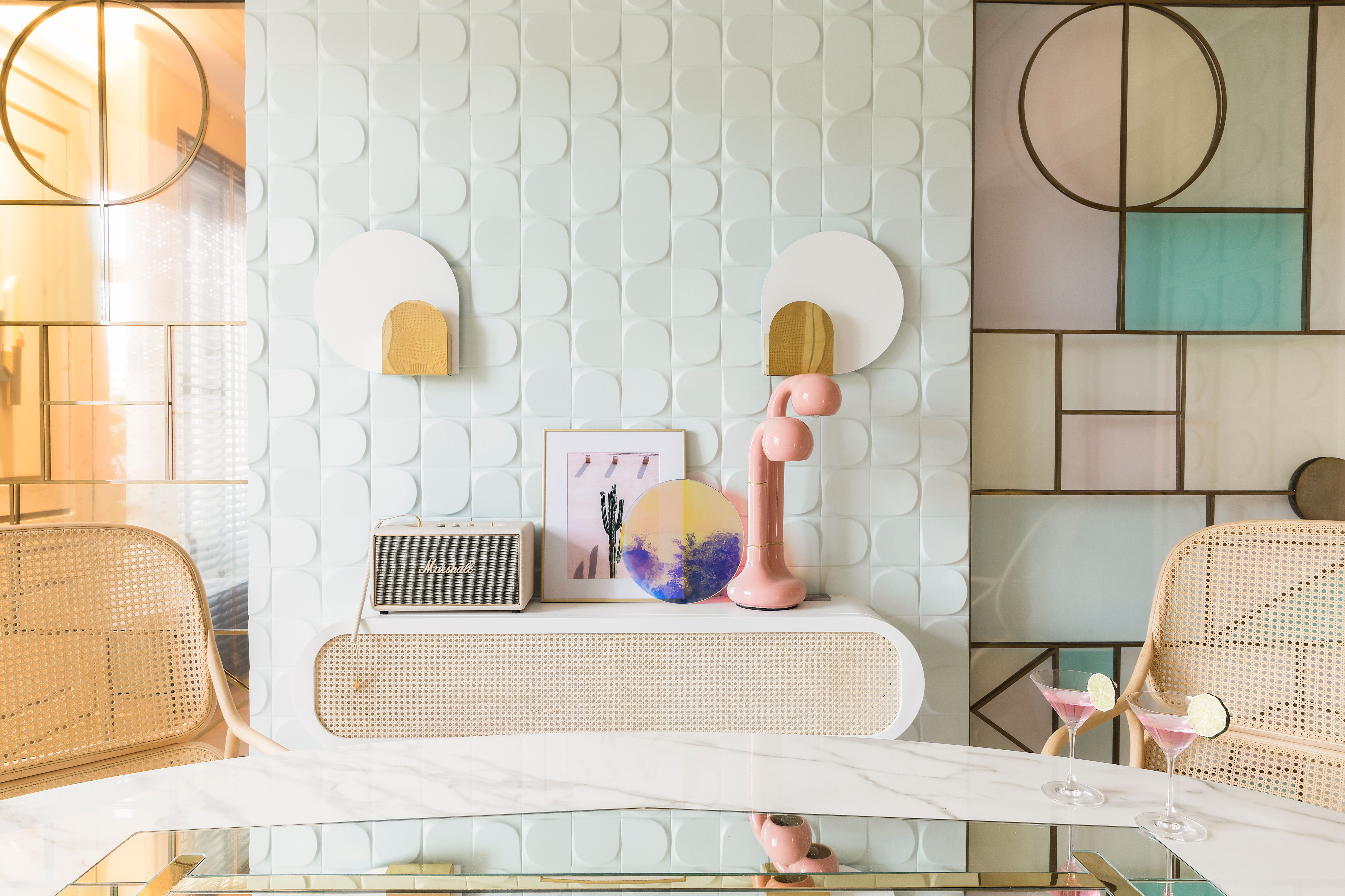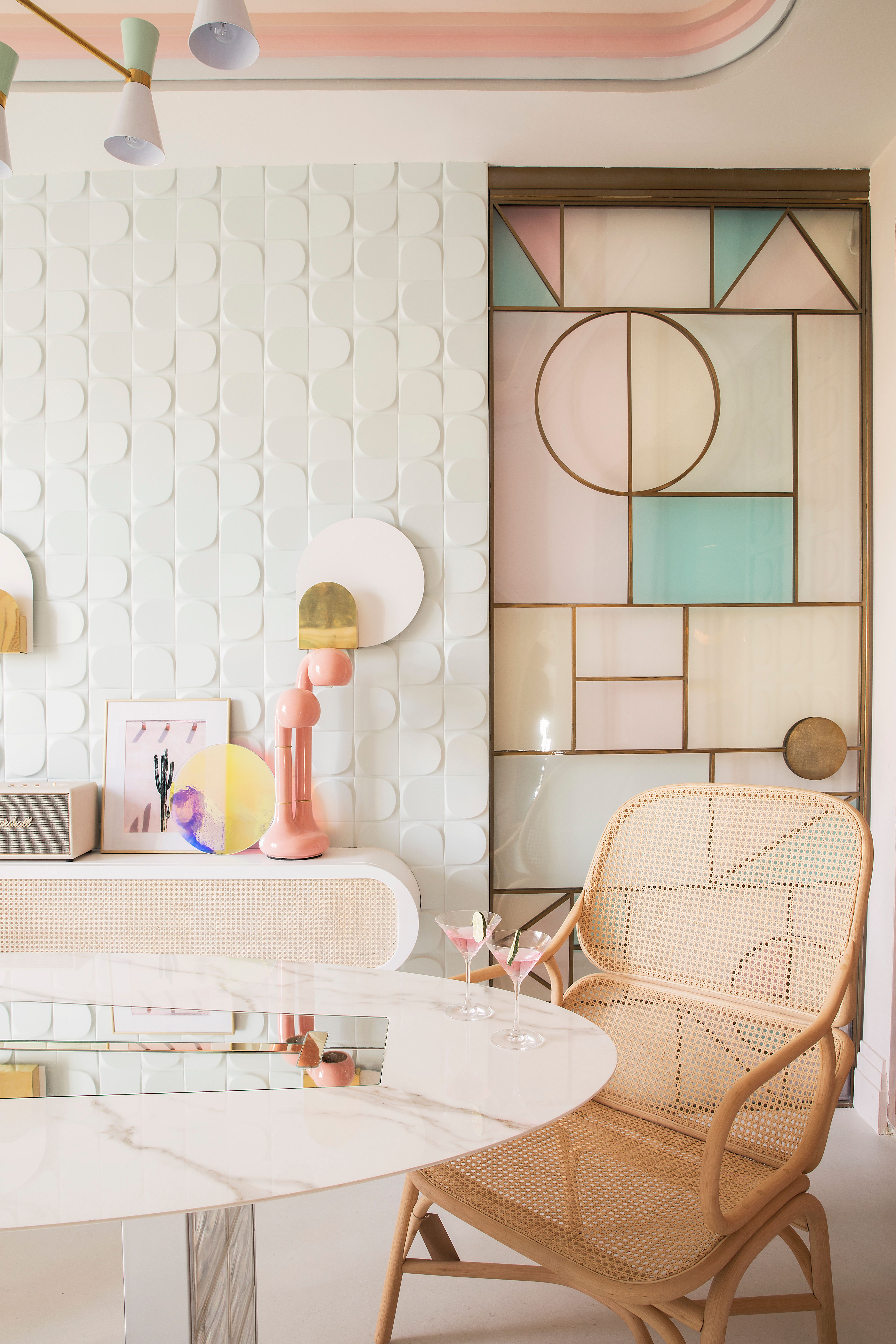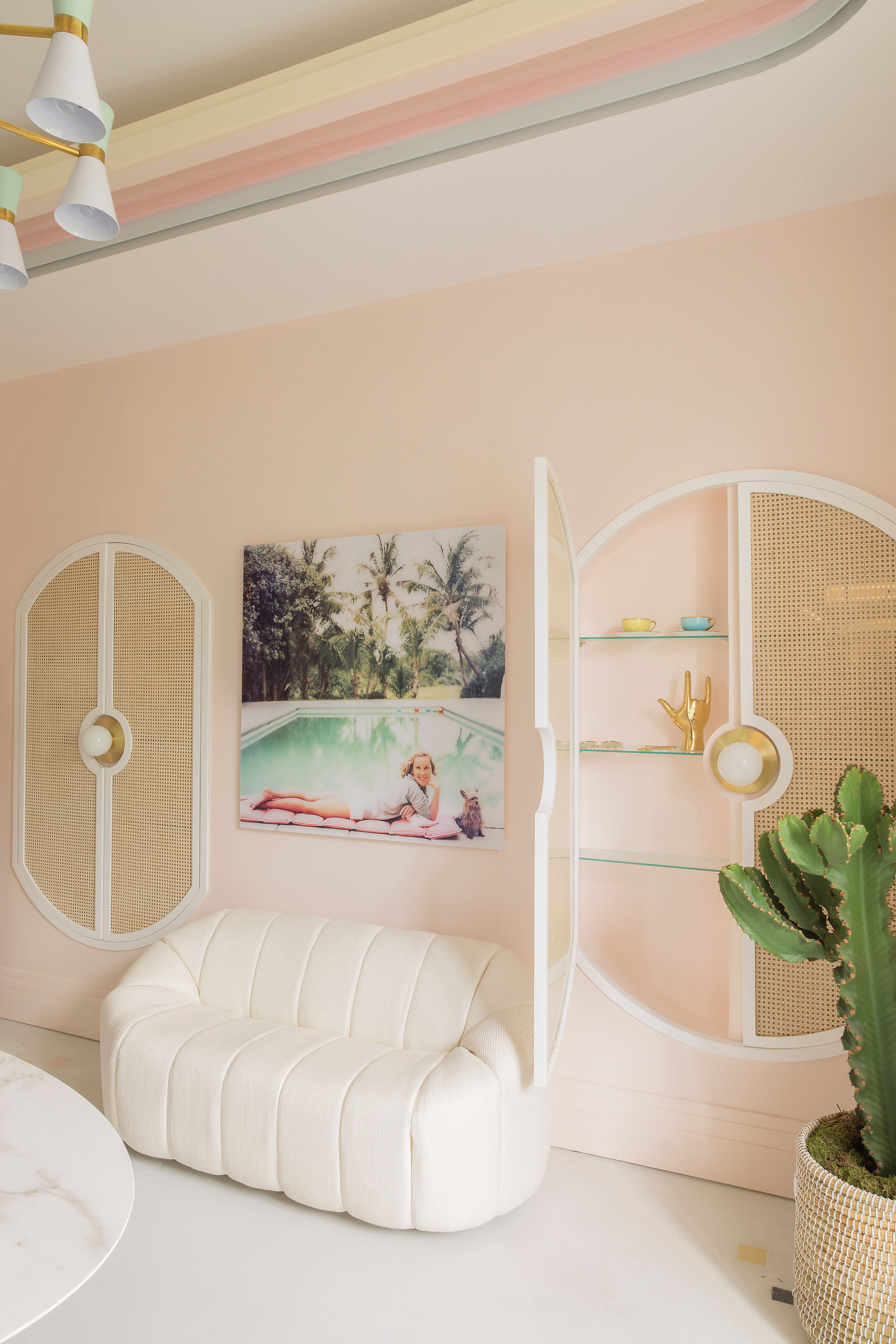 La estancia se sirve de la vegetación tropical y de las formas orgánicas, además de los colores pastel para crear un ambiente veraniego. Esta habitación emana buenas vibraciones y energía positiva, claro objetivo del estudio Patricia Bustos. El espacio huye de lo convencional para así impactar y emocionar, sin olvidarse del bienestar y la comodidad.