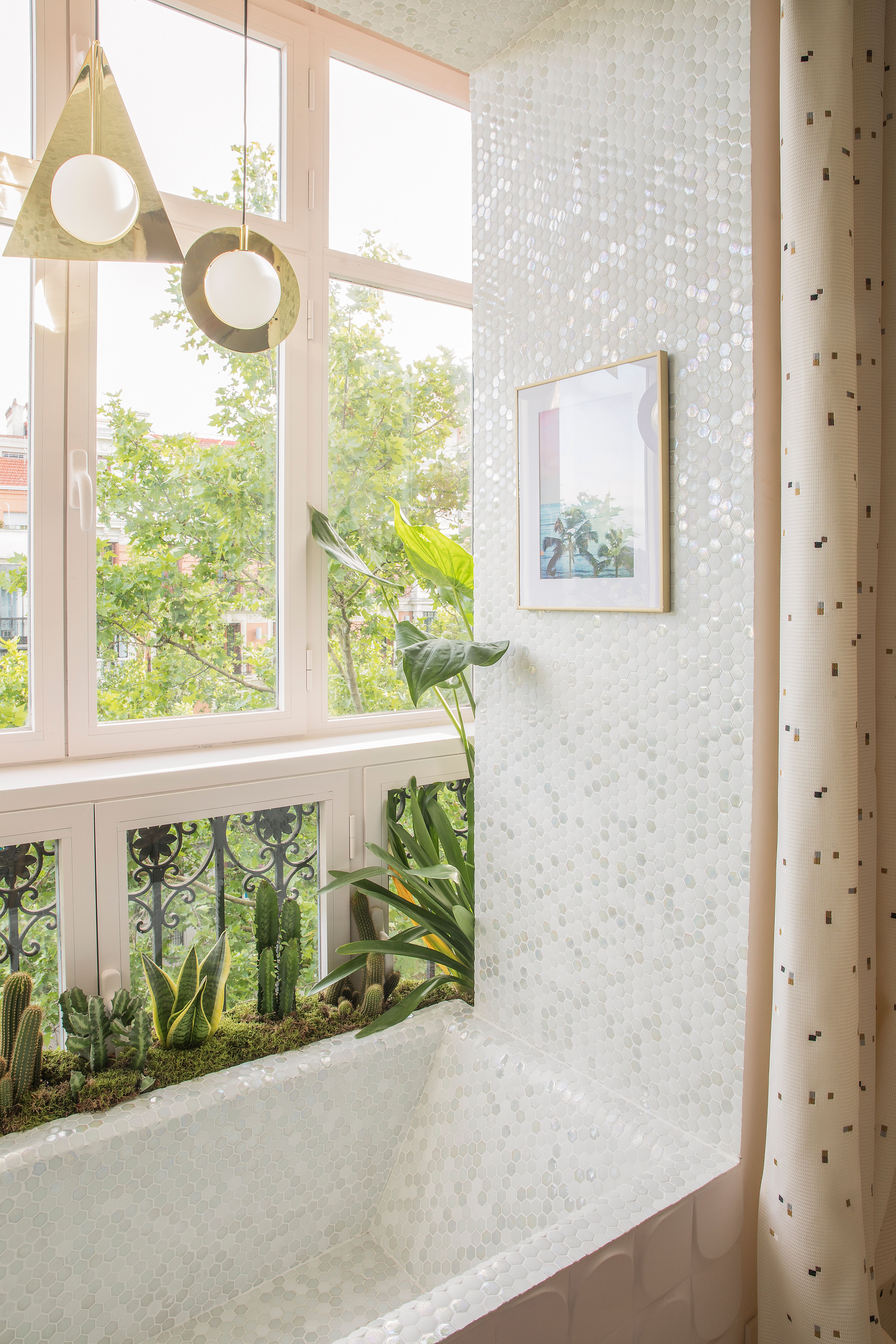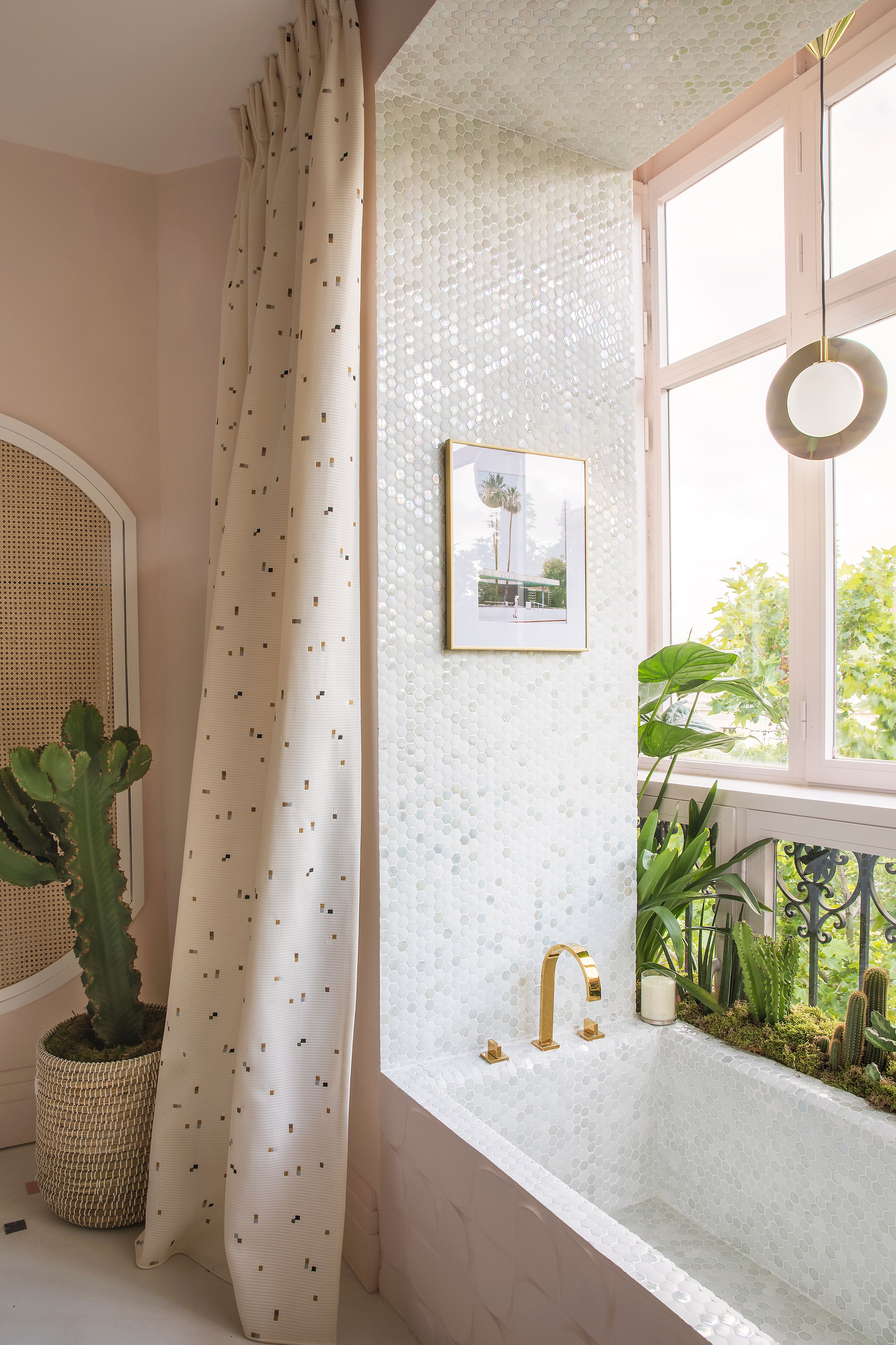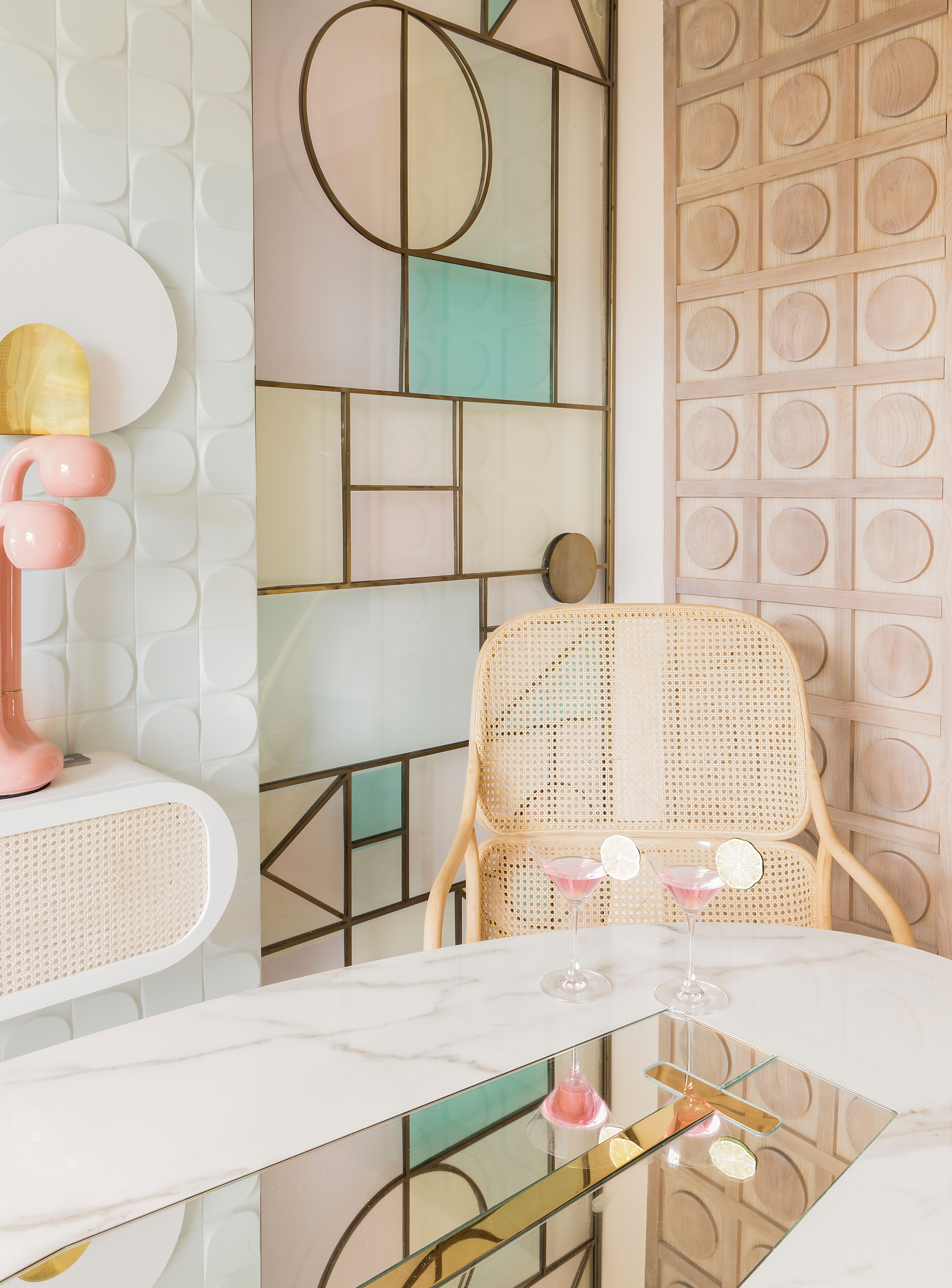La estancia se sirve de la vegetación tropical y de las formas orgánicas, además de los colores pastel para crear un ambiente veraniego. Esta habitación emana buenas vibraciones y energía positiva, claro objetivo del estudio Patricia Bustos. El espacio huye de lo convencional para así impactar y emocionar, sin olvidarse del bienestar y la comodidad.