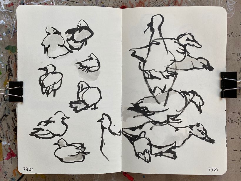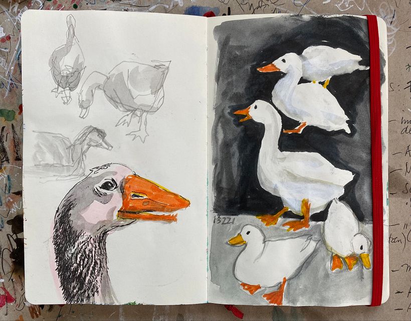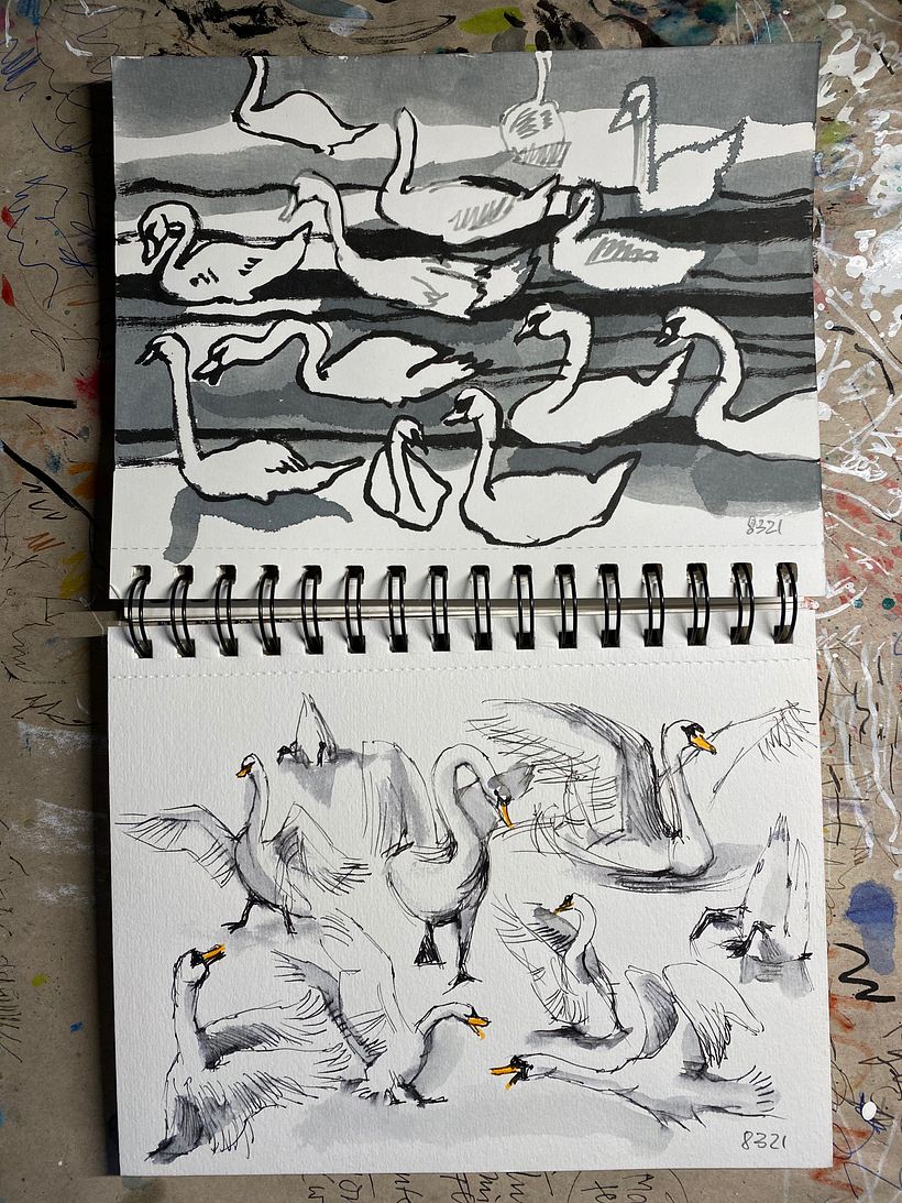 For my practical exercises I first turned to fruit / vegetables (the classics), for the open-air sketches to ducks, geese and swans in our local pond. I then followed up the swan theme with videos and photos.