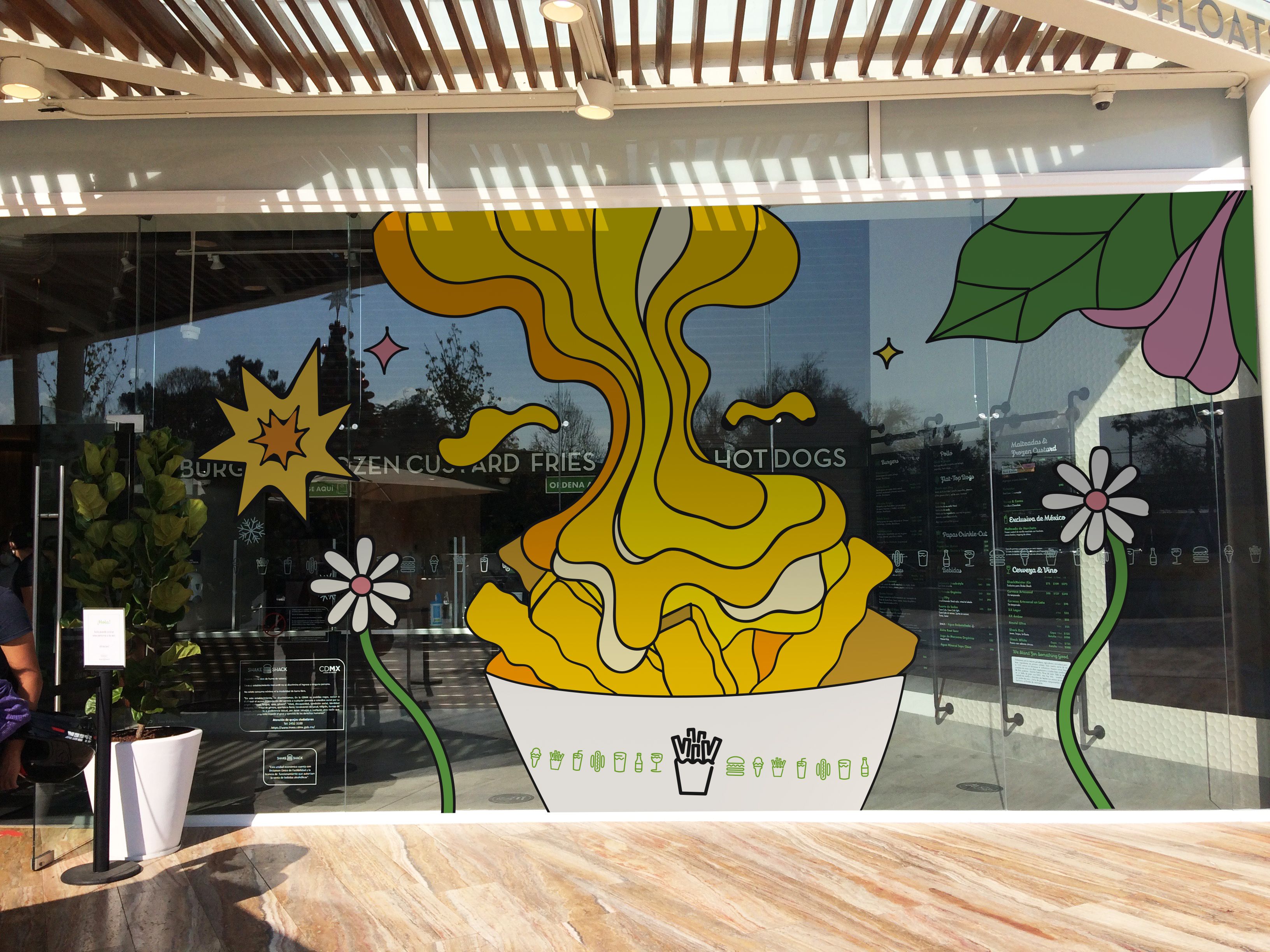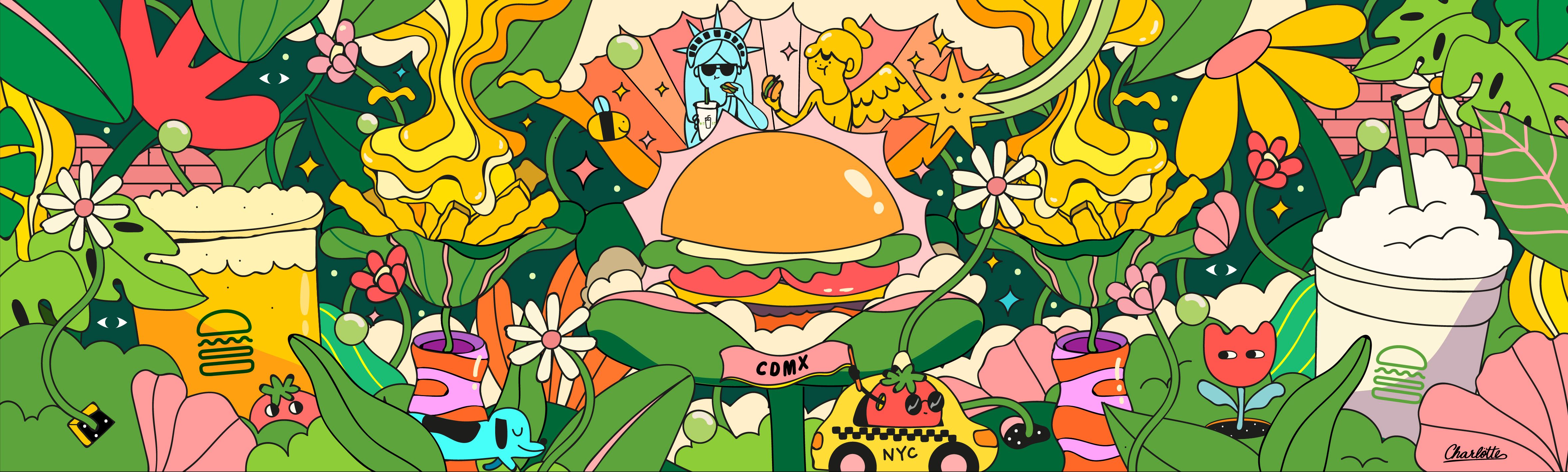 Esta es una ilustración inspirada en la explosión de sabores que cada uno de los ingredientes y productos de Shake Shack ofrece, envueltos en un entorno natural que representa las partes más verdes y florales de la Ciudad de México, que lo convierten en un espacio ideal para disfrutar y compartir con quien más quieras