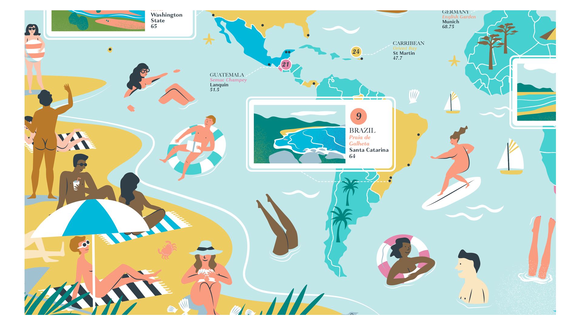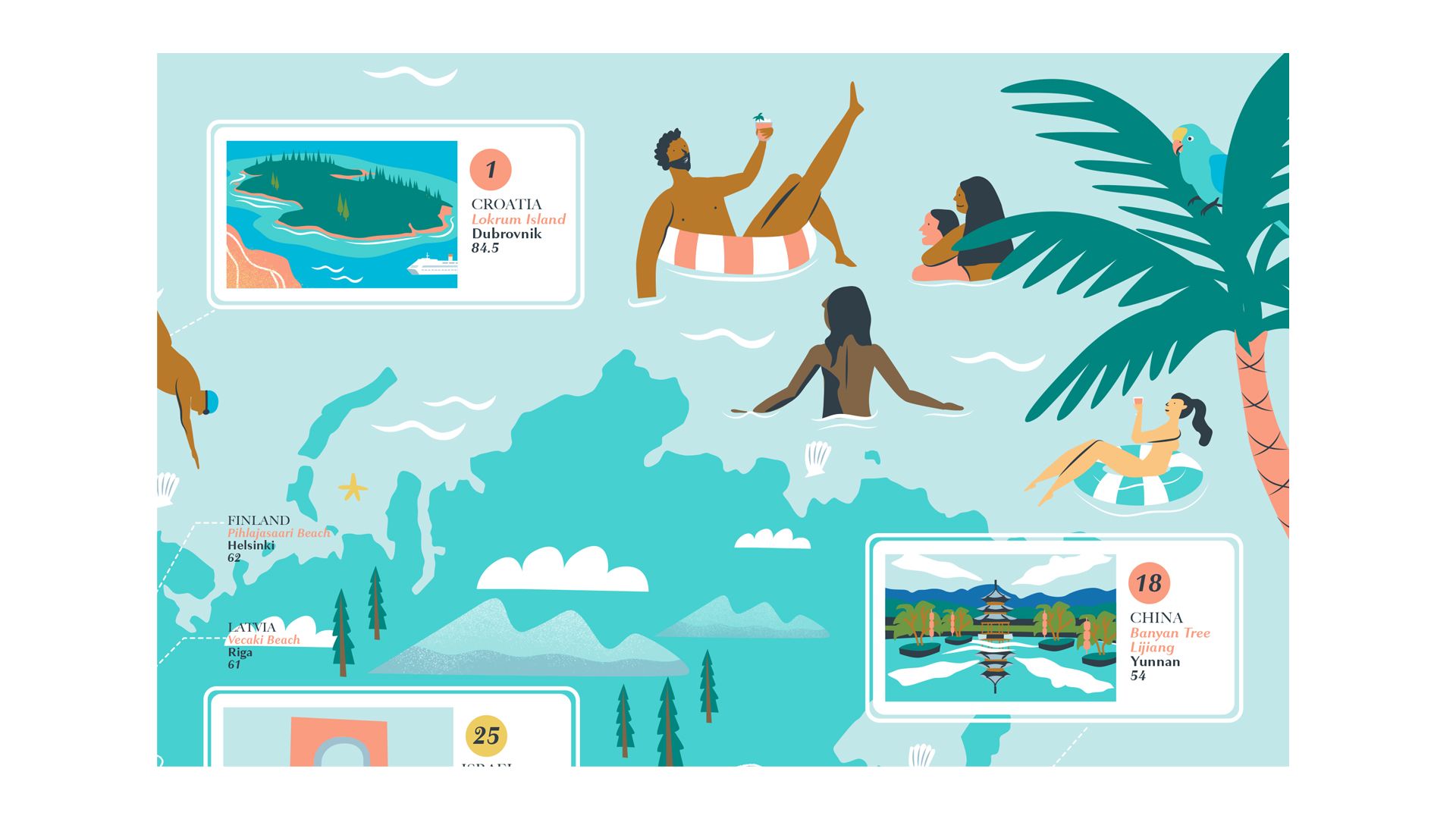 Brief: To create a fun map depicting the top skinny dipping sites in the world, with focus on the top 25. Client requested a mix of environmental, geographical and human interest elements to create this fun and friendly holiday themed map.