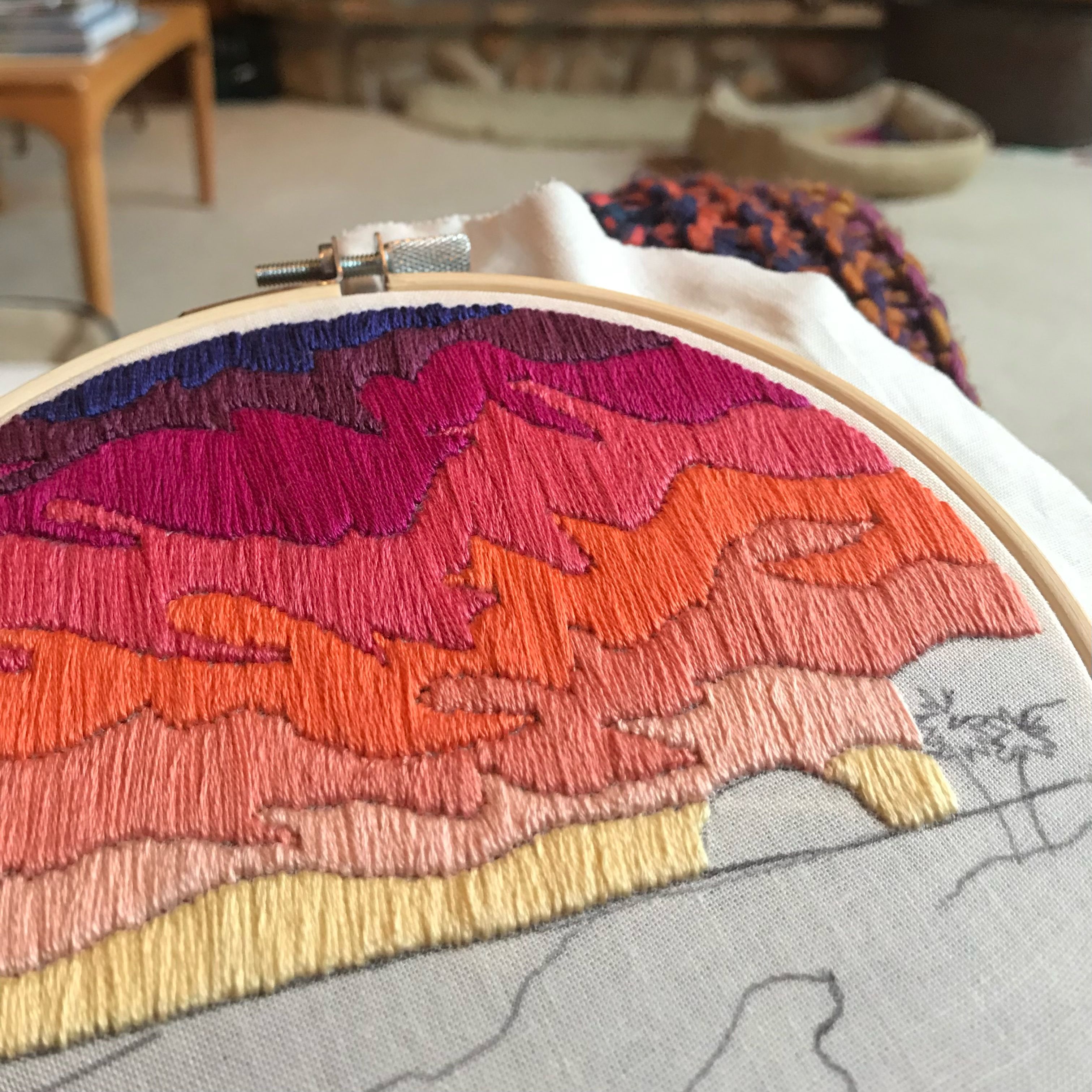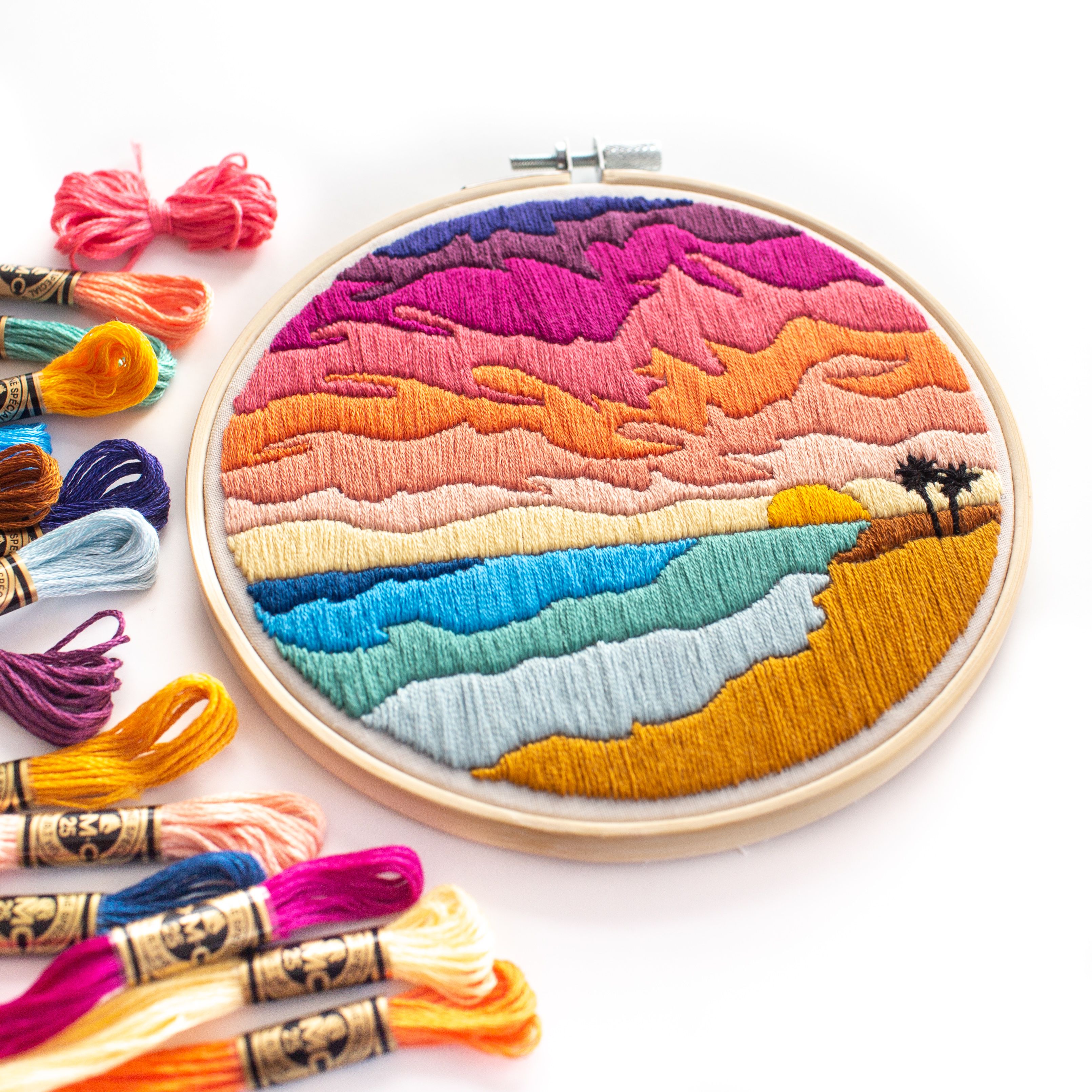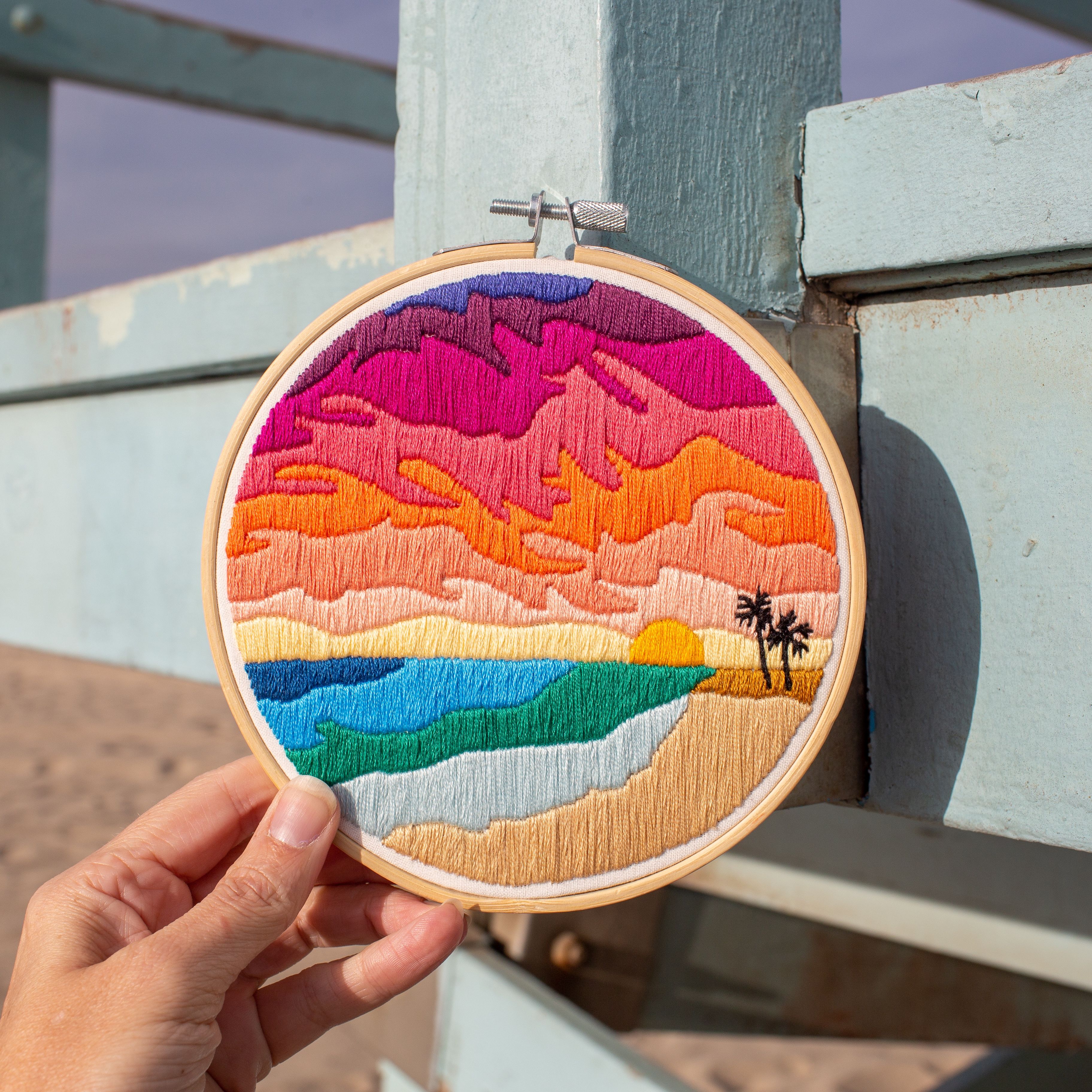 Ho ricamato questo disegno per la prima volta durante una fredda vacanza natalizia in Wisconsin. I colori del tramonto sull'oceano mi hanno scaldata e il disegno mi ha permesso di usare molti colori, che è una delle mie cose preferite.