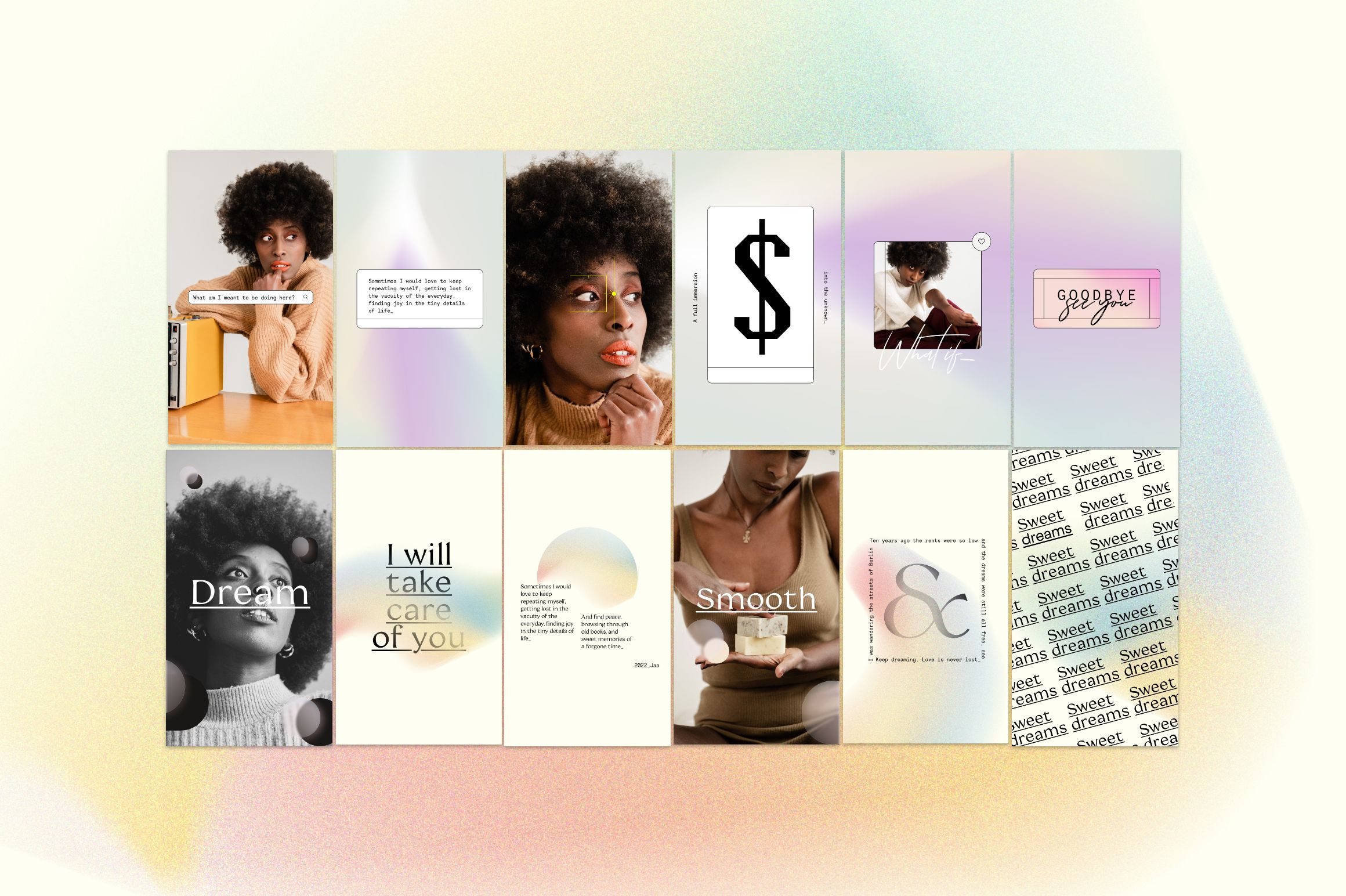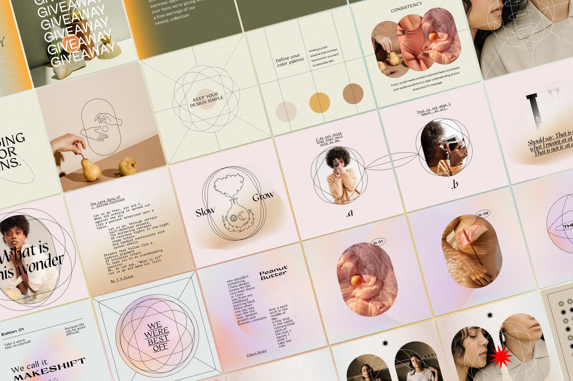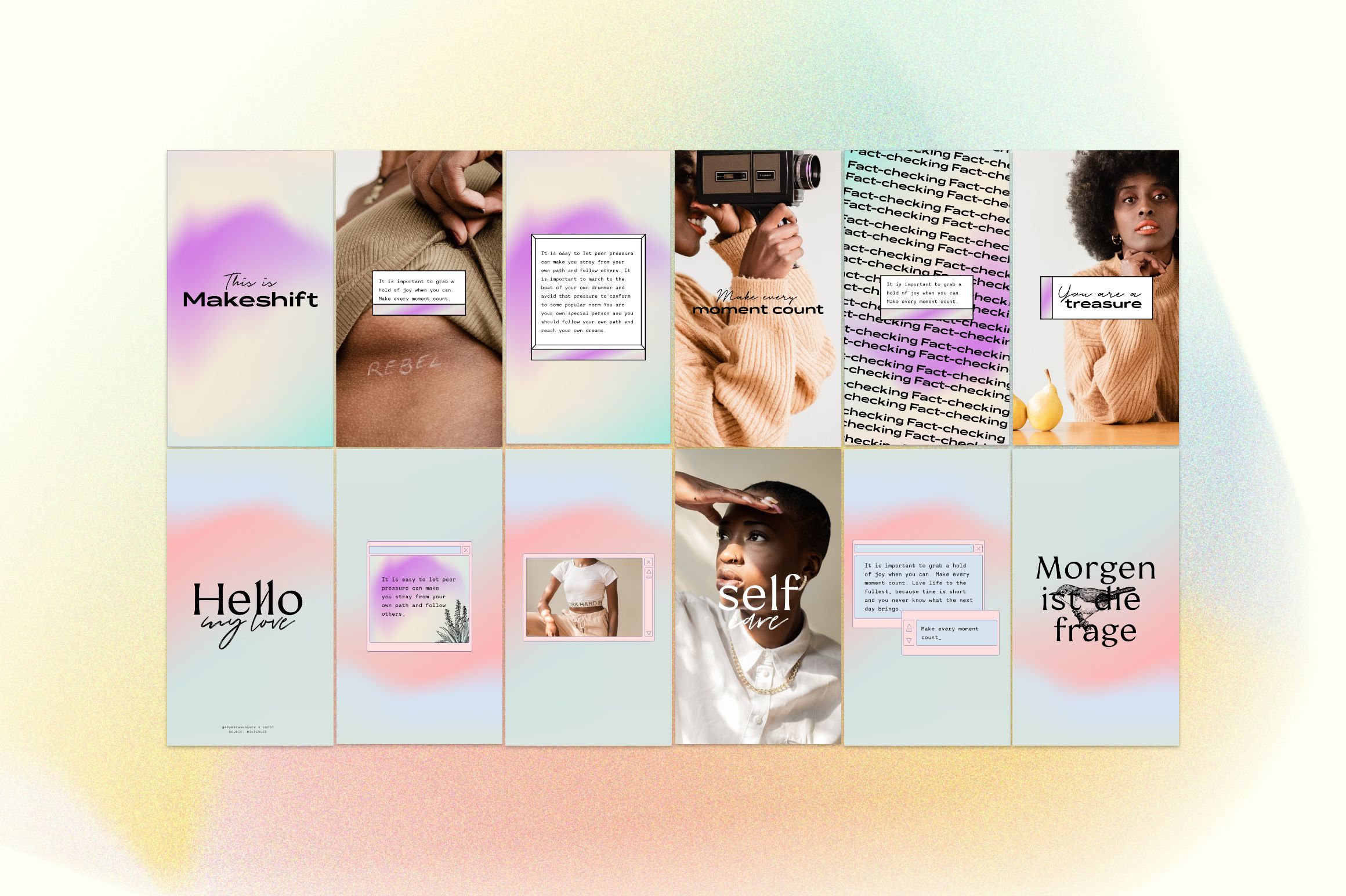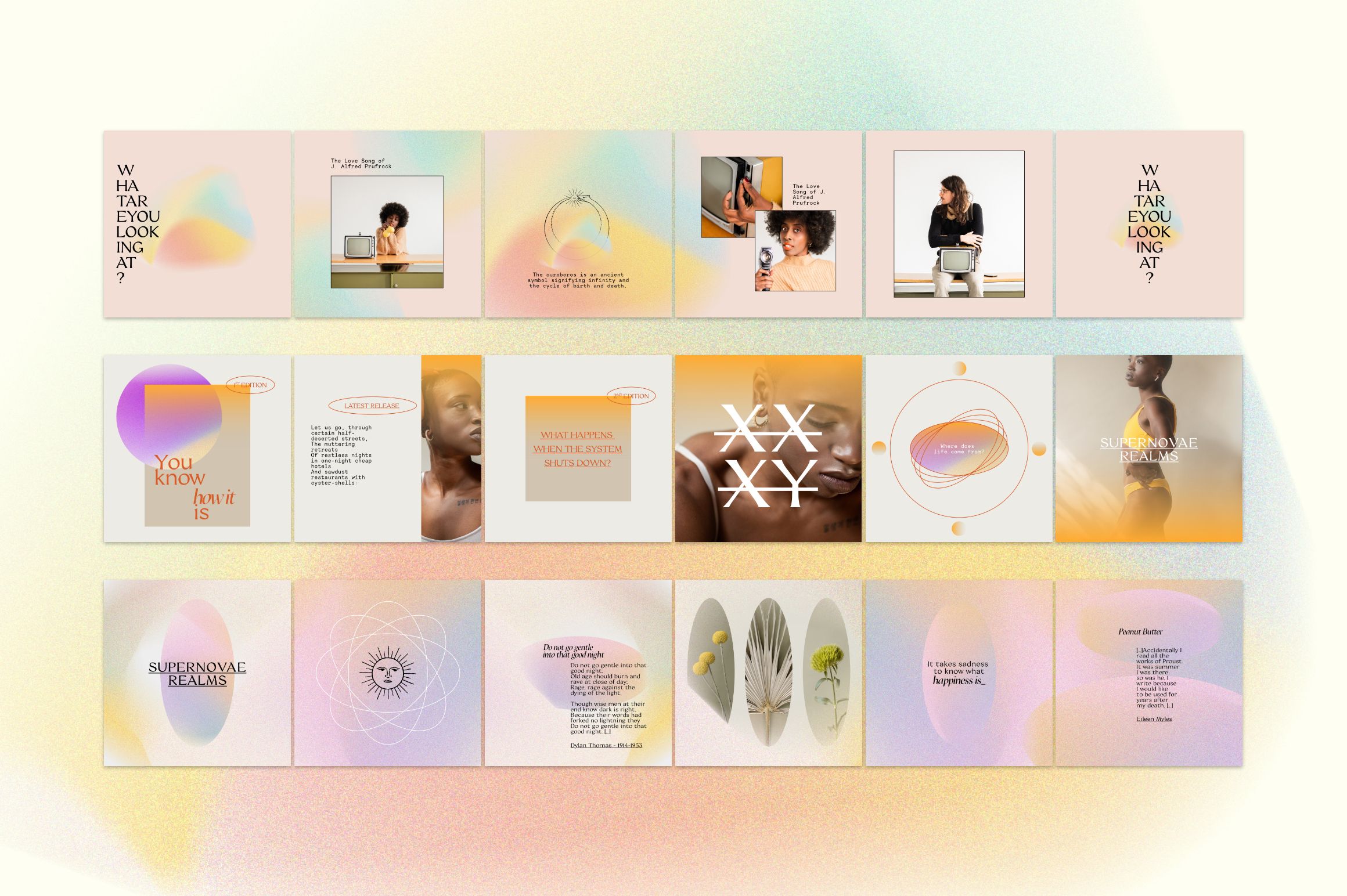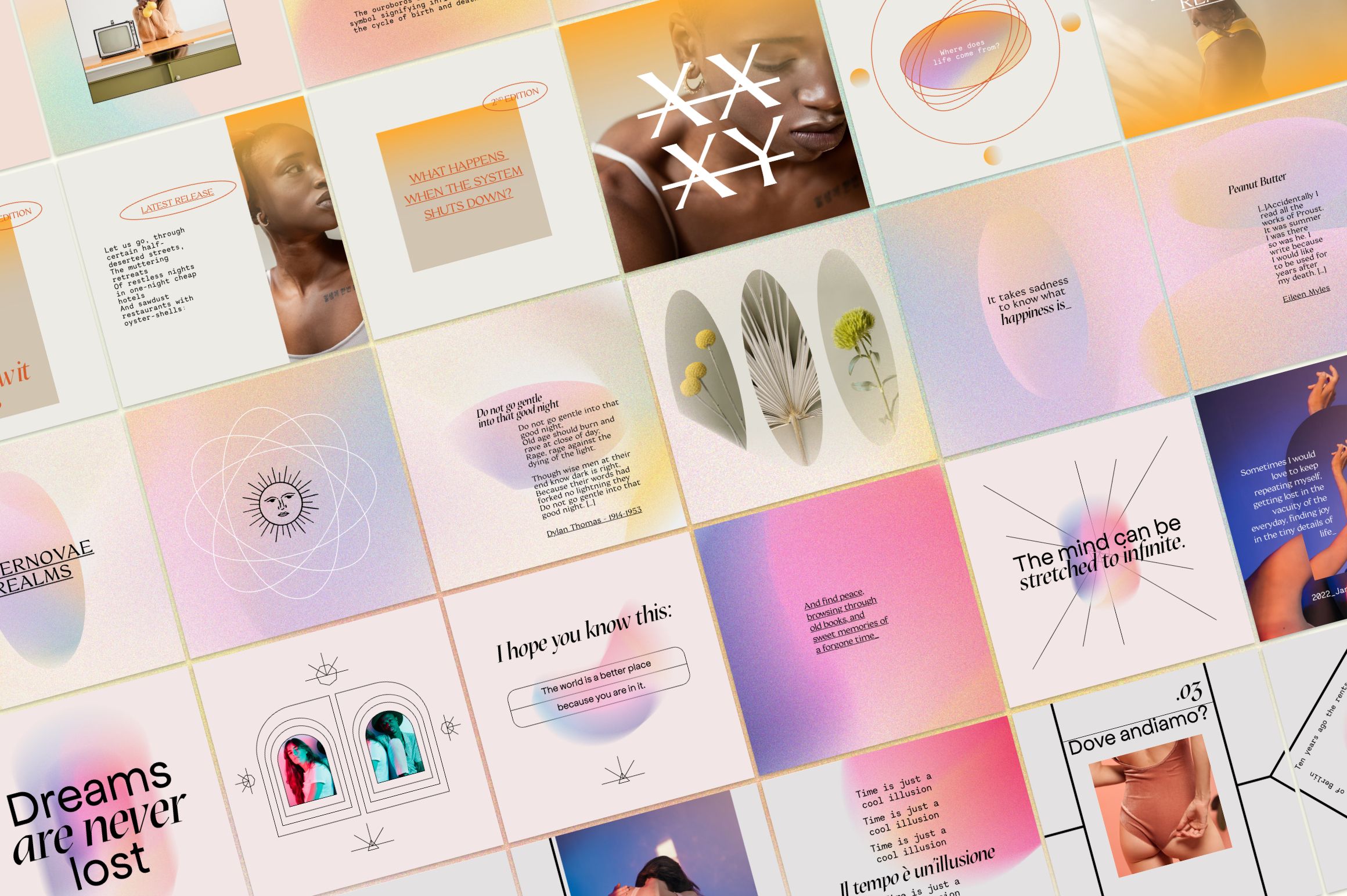The collection comprises 90 posts combined in 15 carousels + 26 Quotes in the format of Instagram Stories and Post showcasing cool gradients and quirky fonts aesthetic.