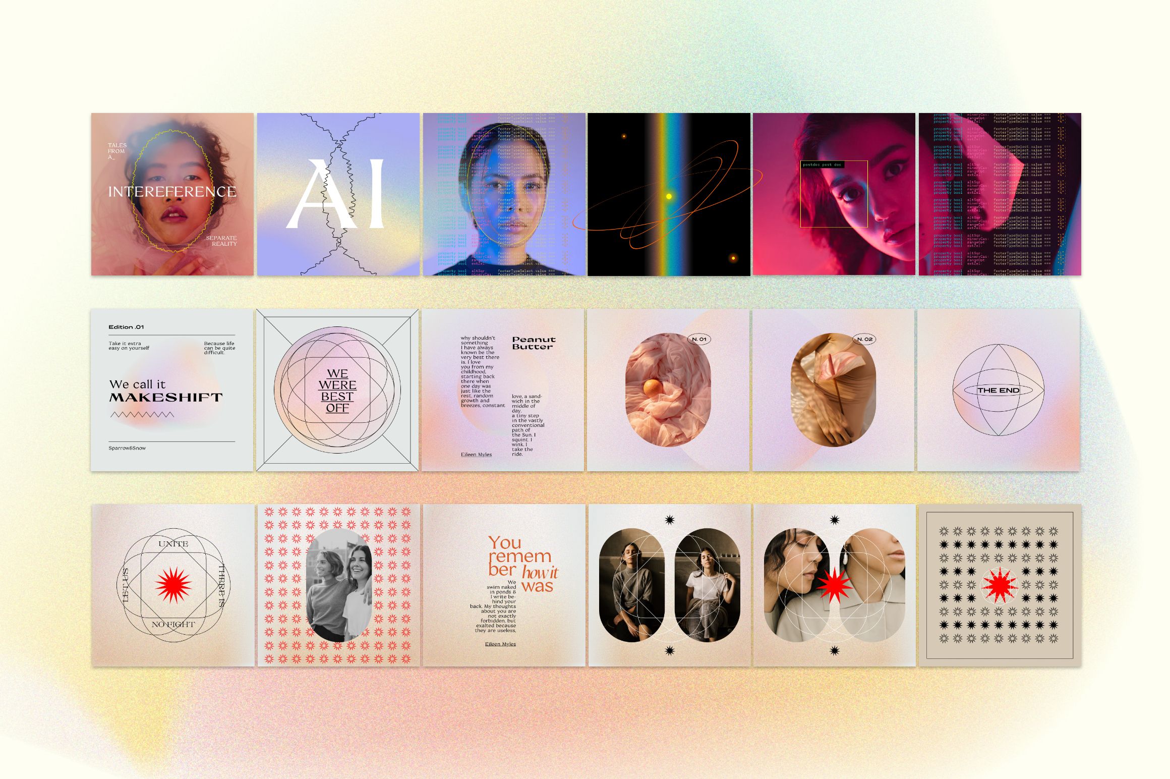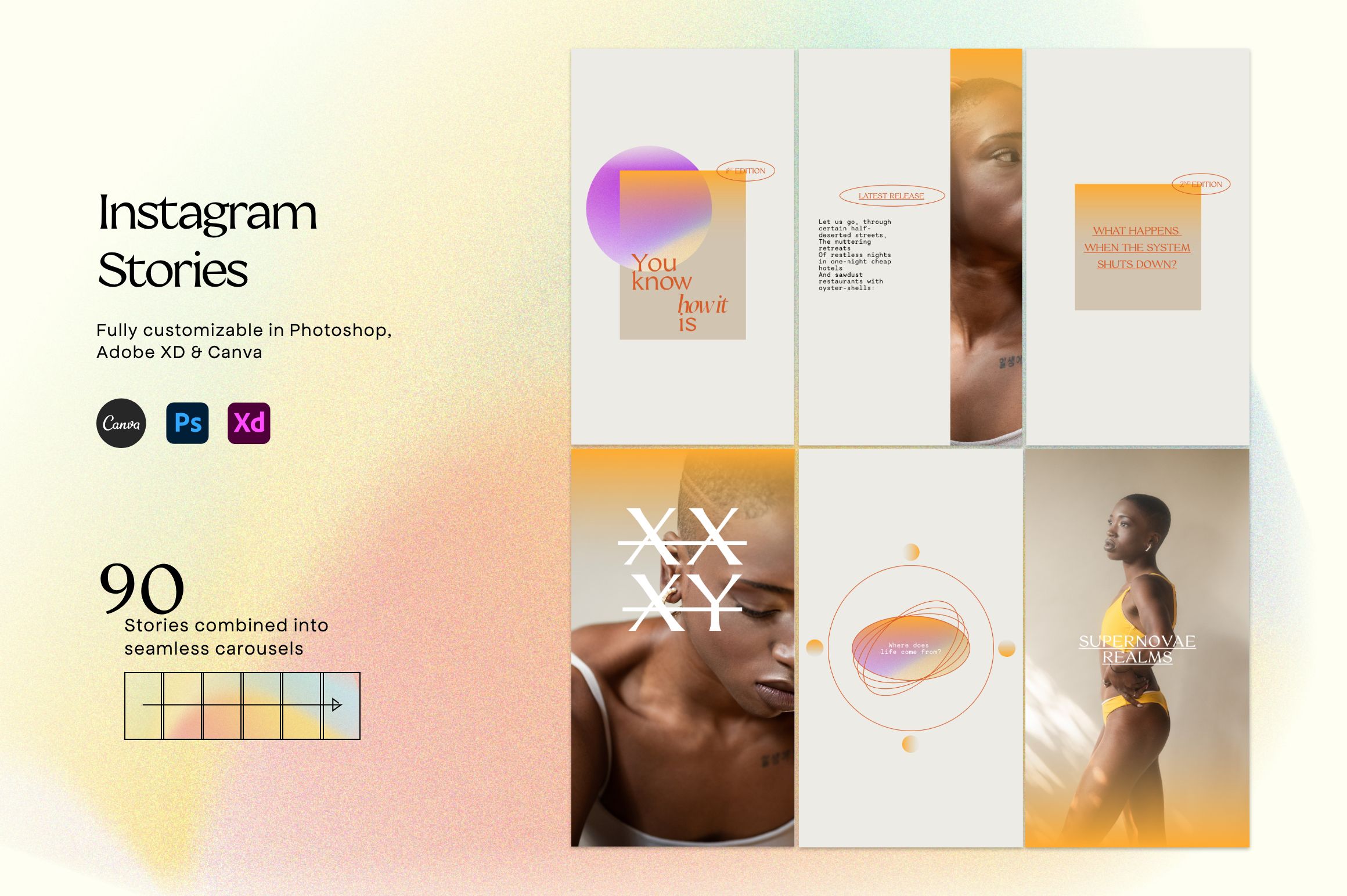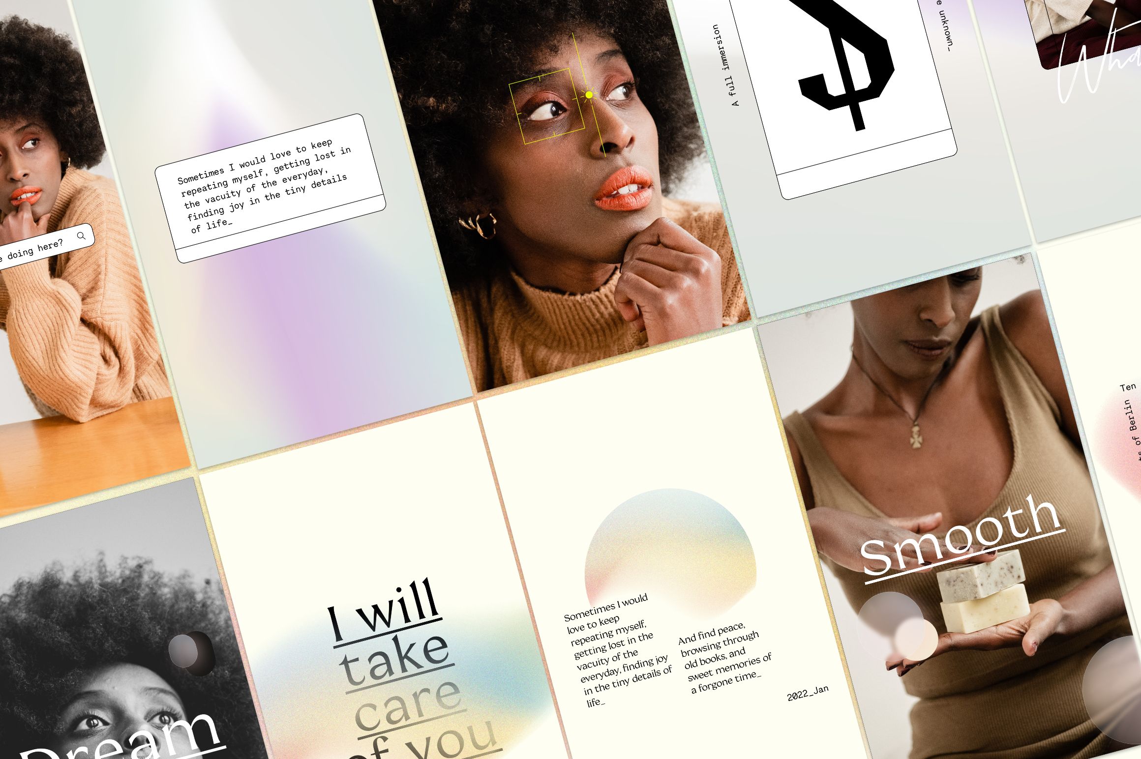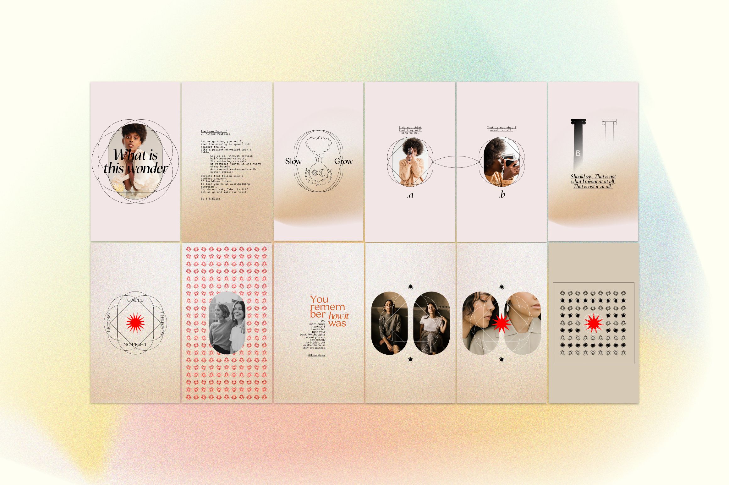 The collection comprises 90 posts combined in 15 carousels + 26 Quotes in the format of Instagram Stories and Post showcasing cool gradients and quirky fonts aesthetic.