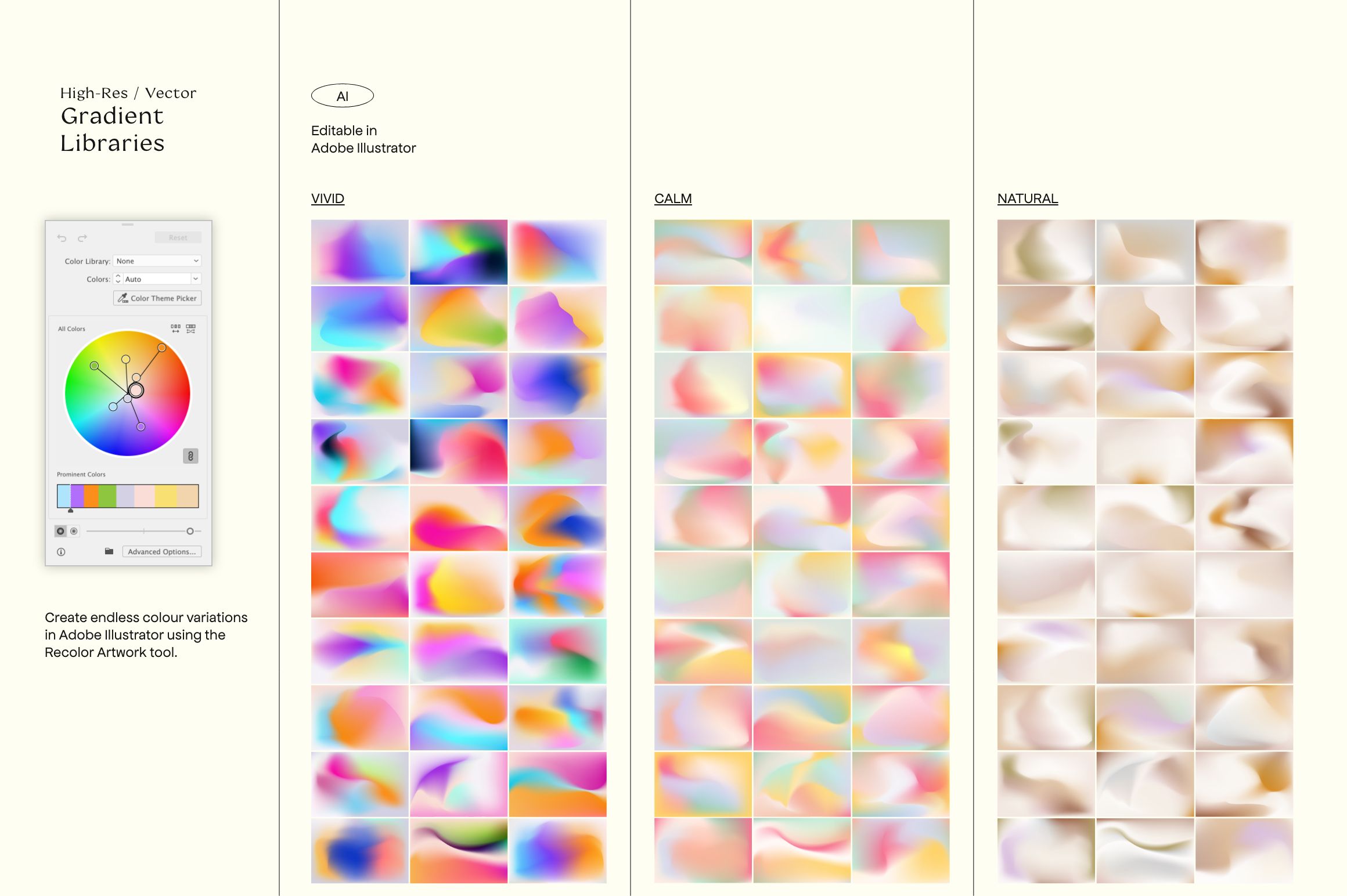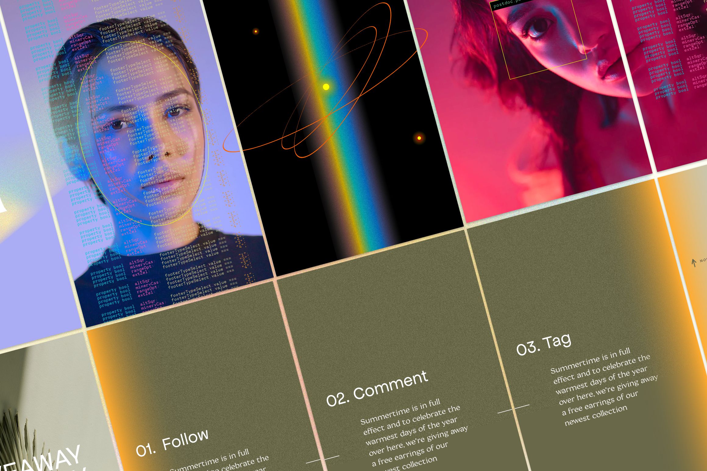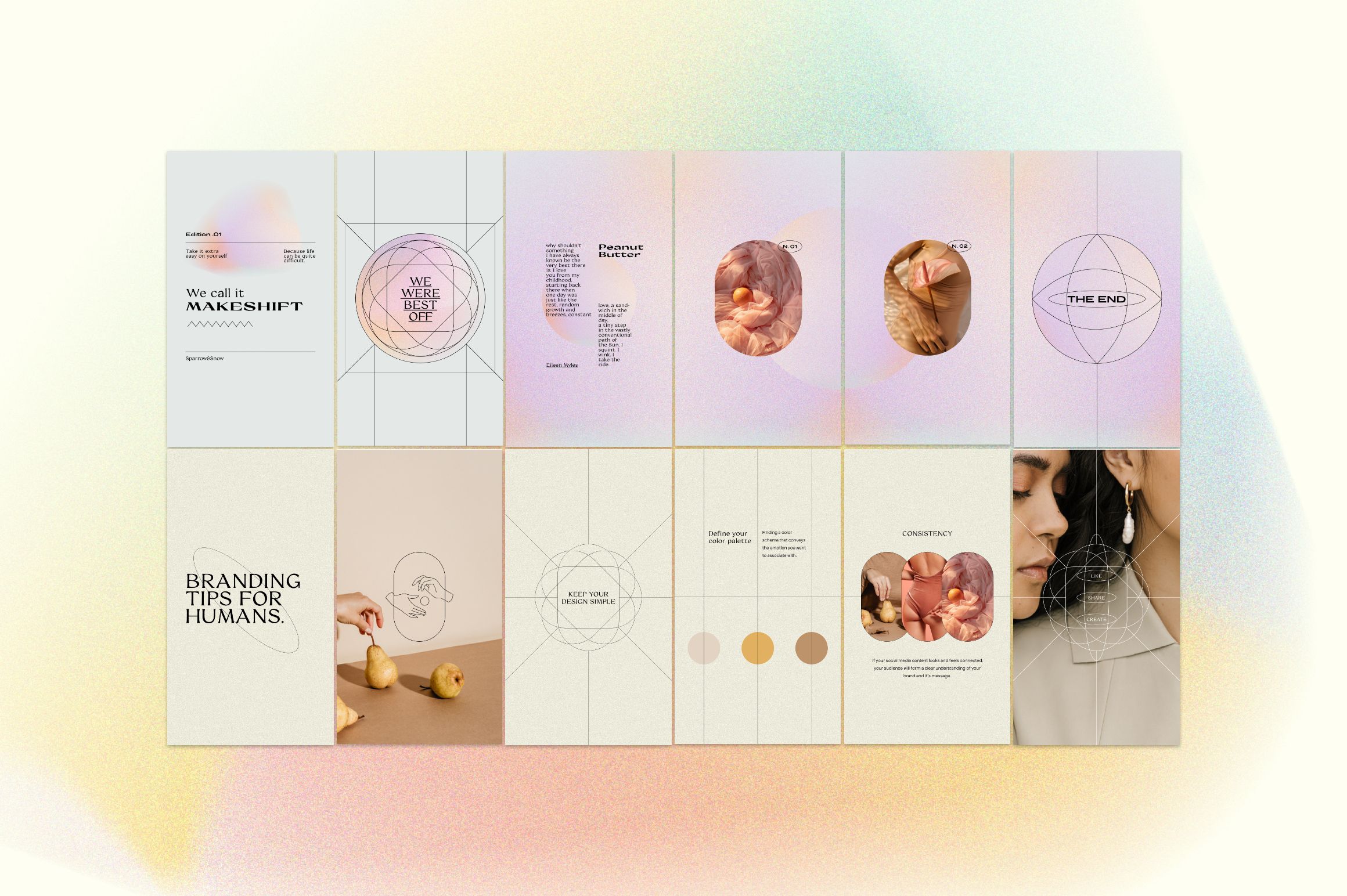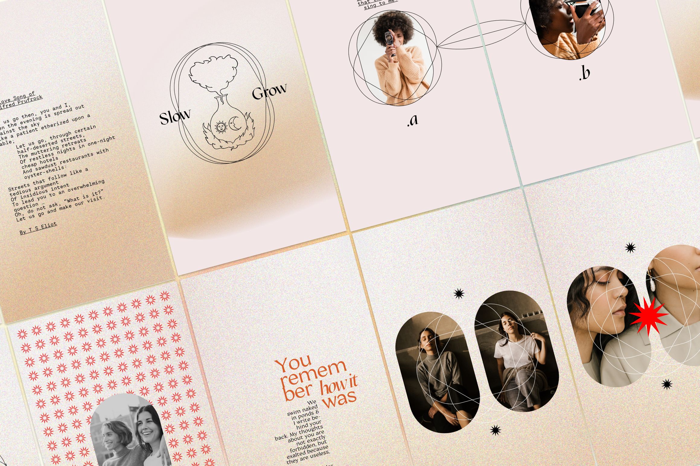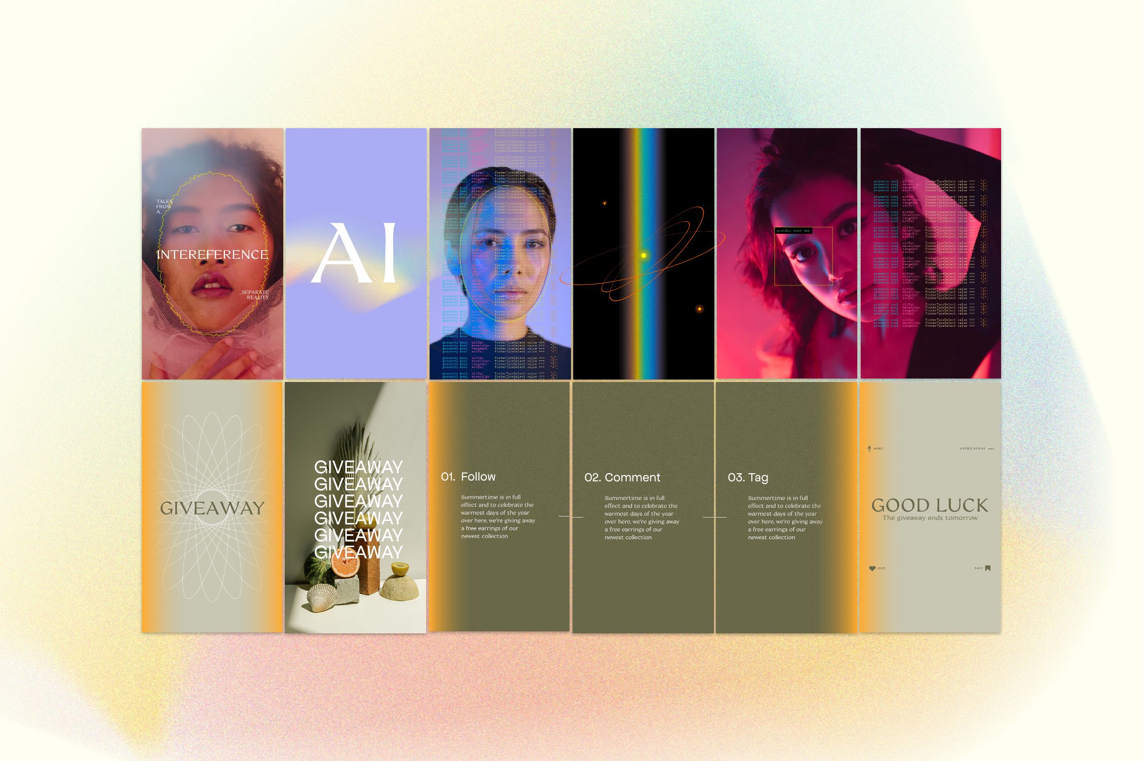 The collection comprises 90 posts combined in 15 carousels + 26 Quotes in the format of Instagram Stories and Post showcasing cool gradients and quirky fonts aesthetic.