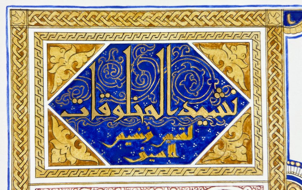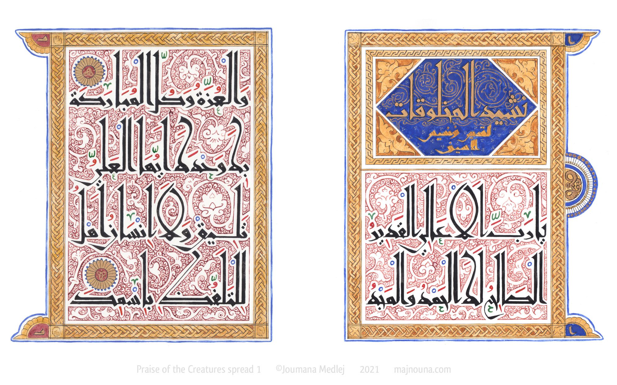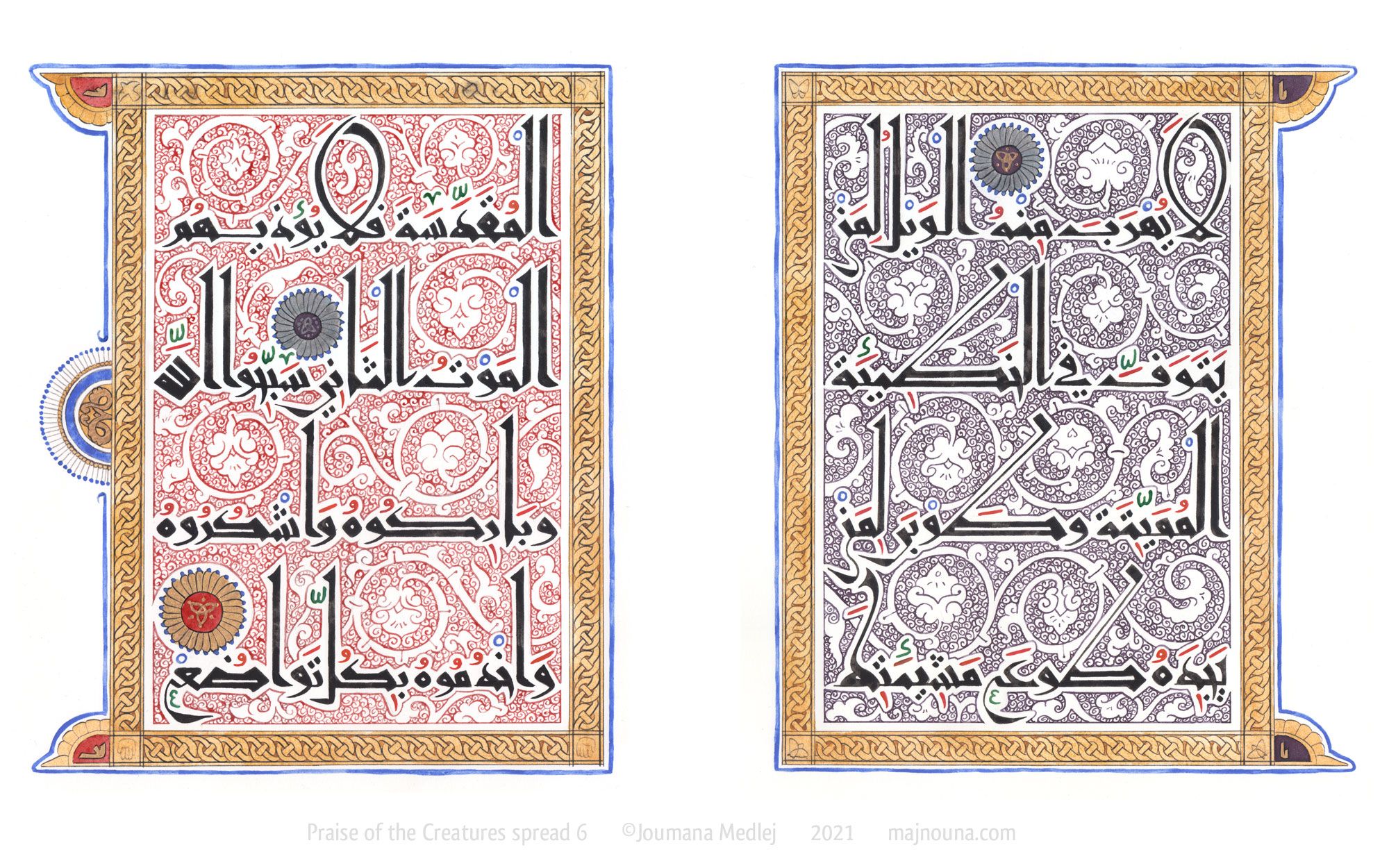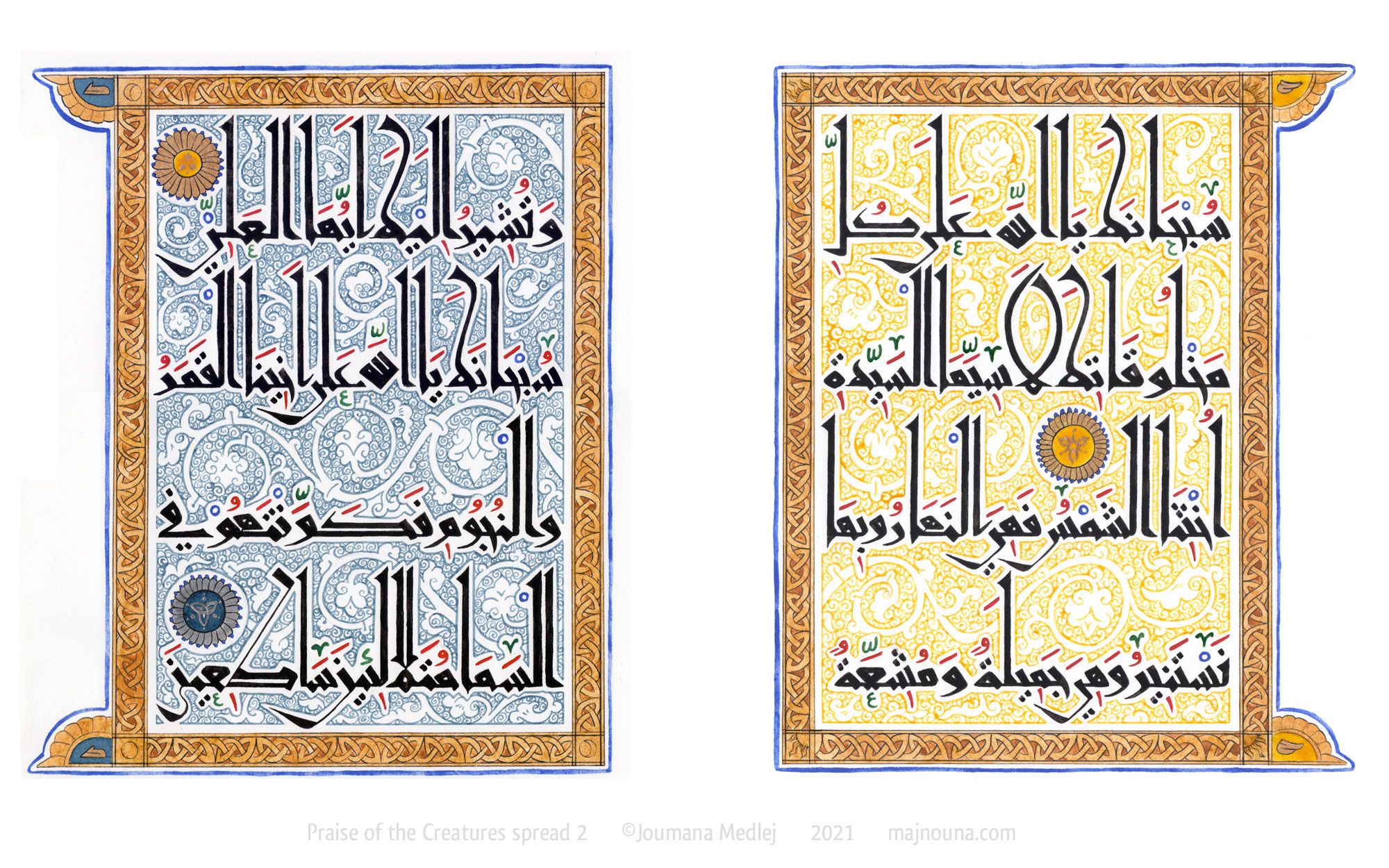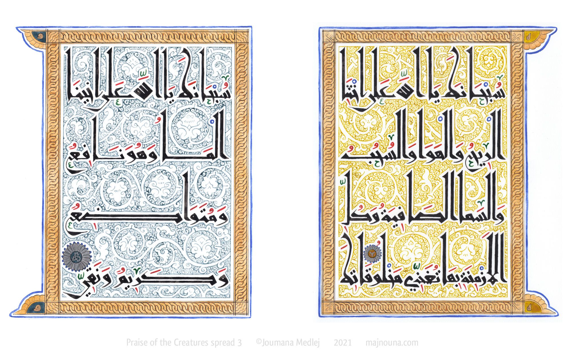 A rendering of St Francis of Assisi’s Canticle of Creatures in Arabic, in the style and materials of the Qarmatian Qur’an, complemented with foraged earth and plant pigments.