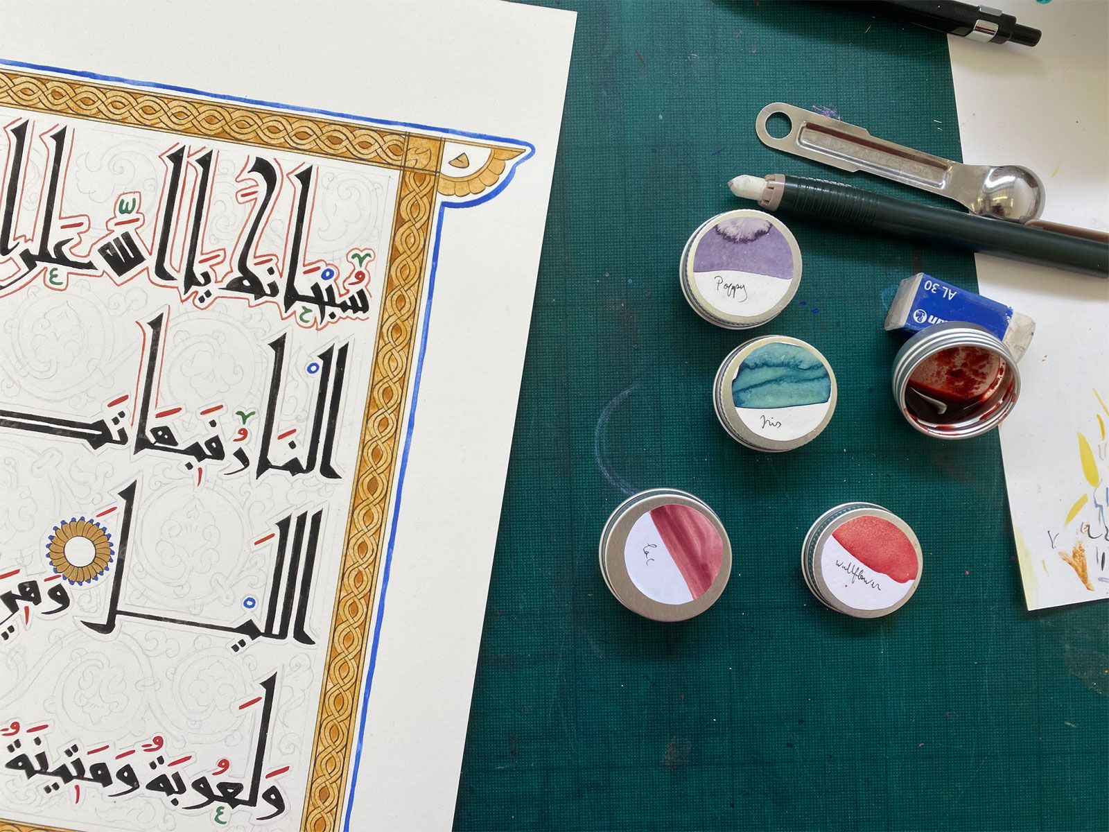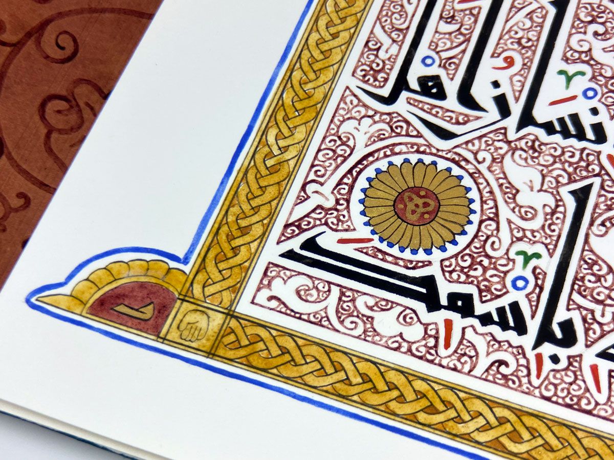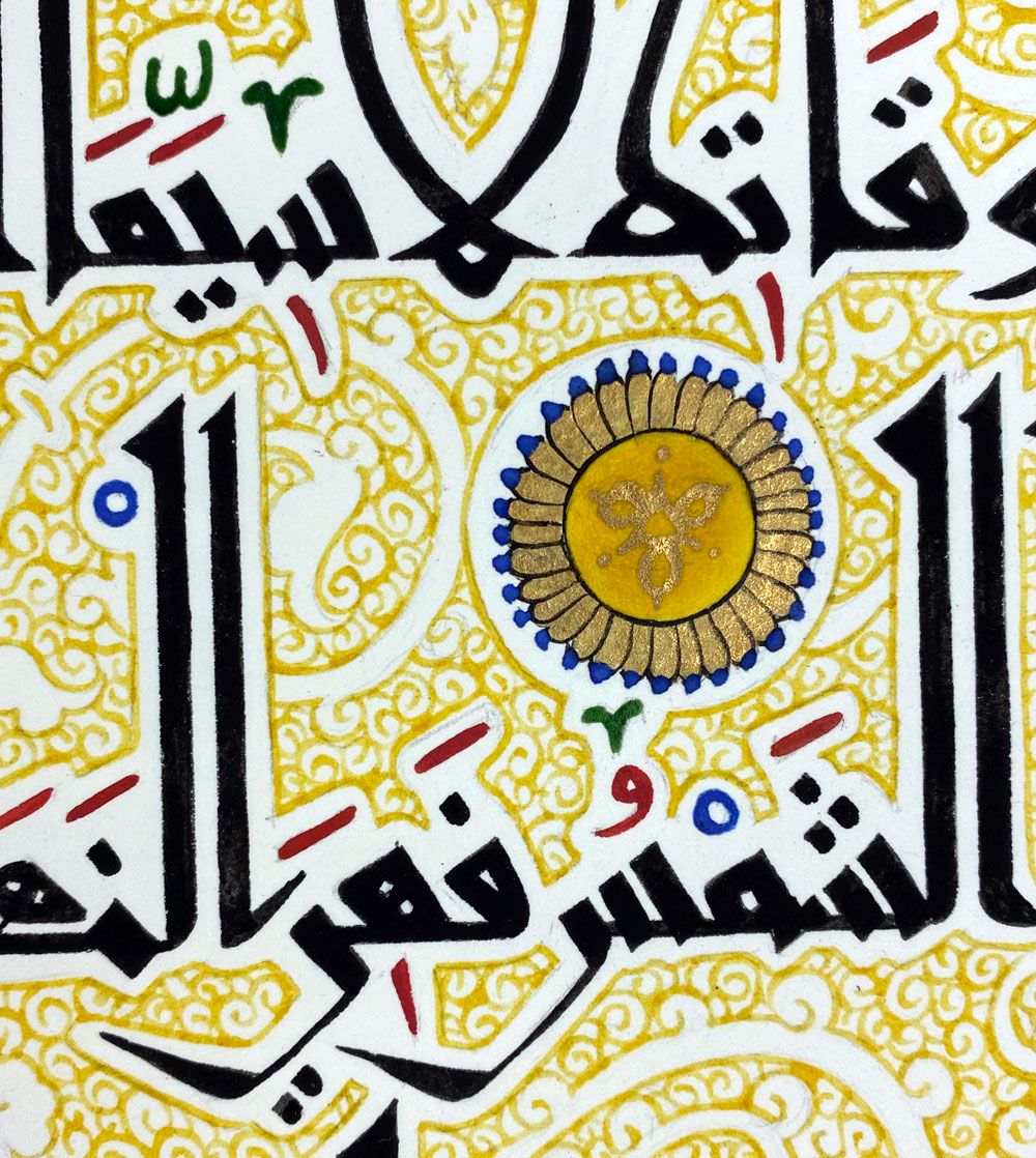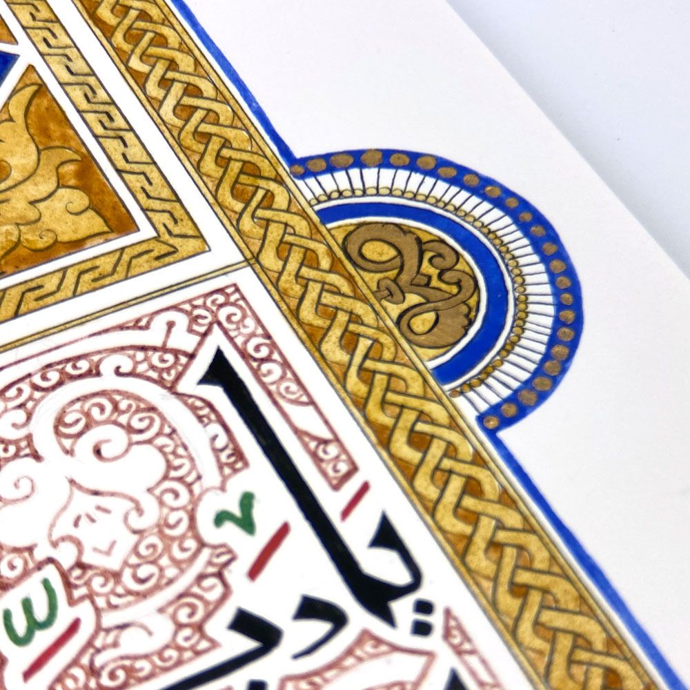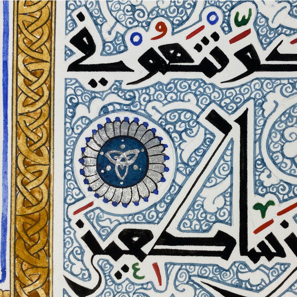 I reconstructed the script, which I believe was a one-off variant of mainstream Eastern Kufic, by studying a number of pages. I must specify I’ve never seen a page in the flesh, only in photos, which is far from the ideal way to deduce the materials used, but as the calligraphic tradition was quite consistent and this was a luxury production, I’m fairly sure of the core pigments I can see: carbon ink for the rasm (the core text), vermillion for harakāt, lapis lazuli for sukūn, and verdigris for shadda, hamza and ihmāl (no green is visible in any photo but all these are brown or burned through, which betrays the use of this unstable pigment. It’s also consistent with tradition.) The borders and verse markers are clearly illuminated with shell gold. The elaborate scrolling vines of the background appear to be done in (organic, plant-based) ink rather than (mineral) pigment, but I could be wrong on this point. It’s just that the variety of colours used (some pages still show a red, yellow or blue background pattern), the way some have faded, and the motif itself, which is more practical to do with a pen and a fluid colour, all suggest this medium. In any case that’s what I decided to go with.