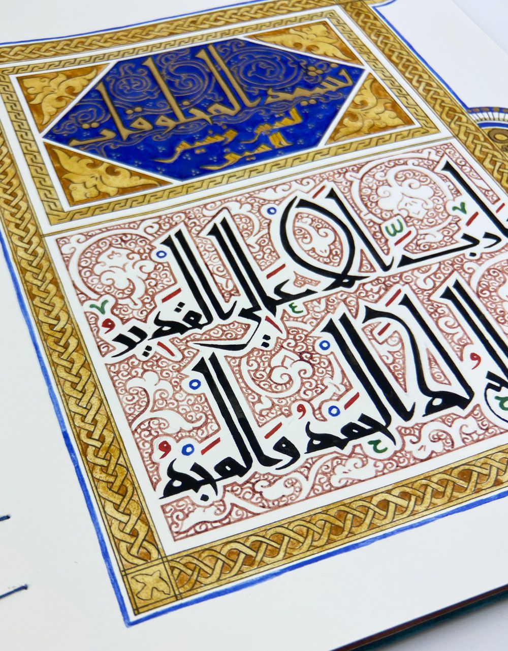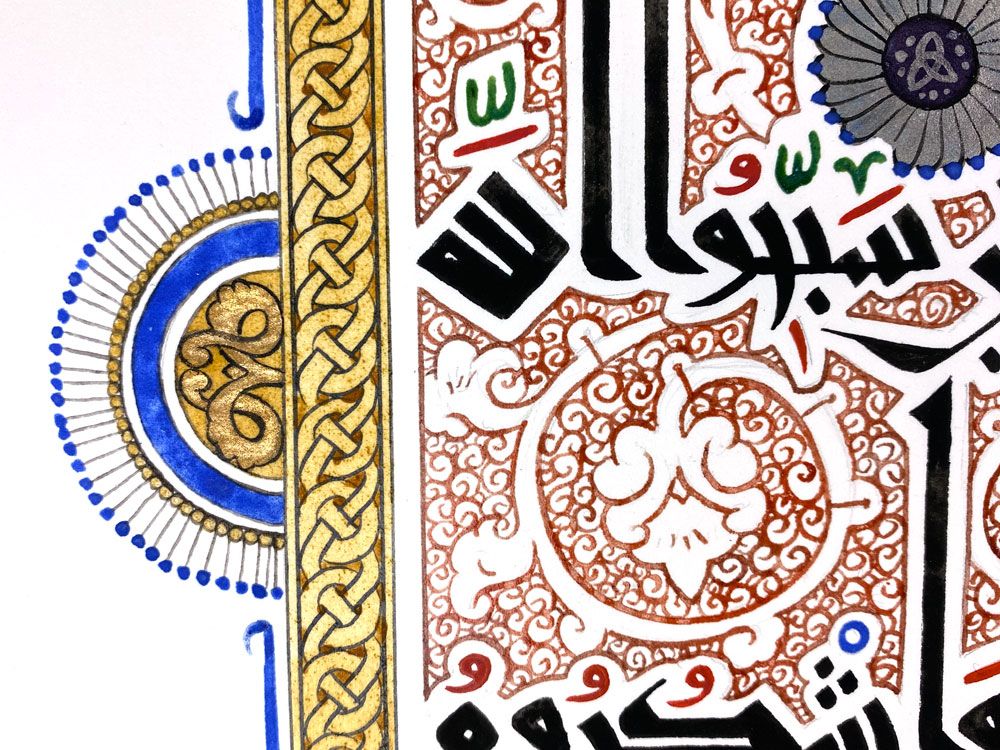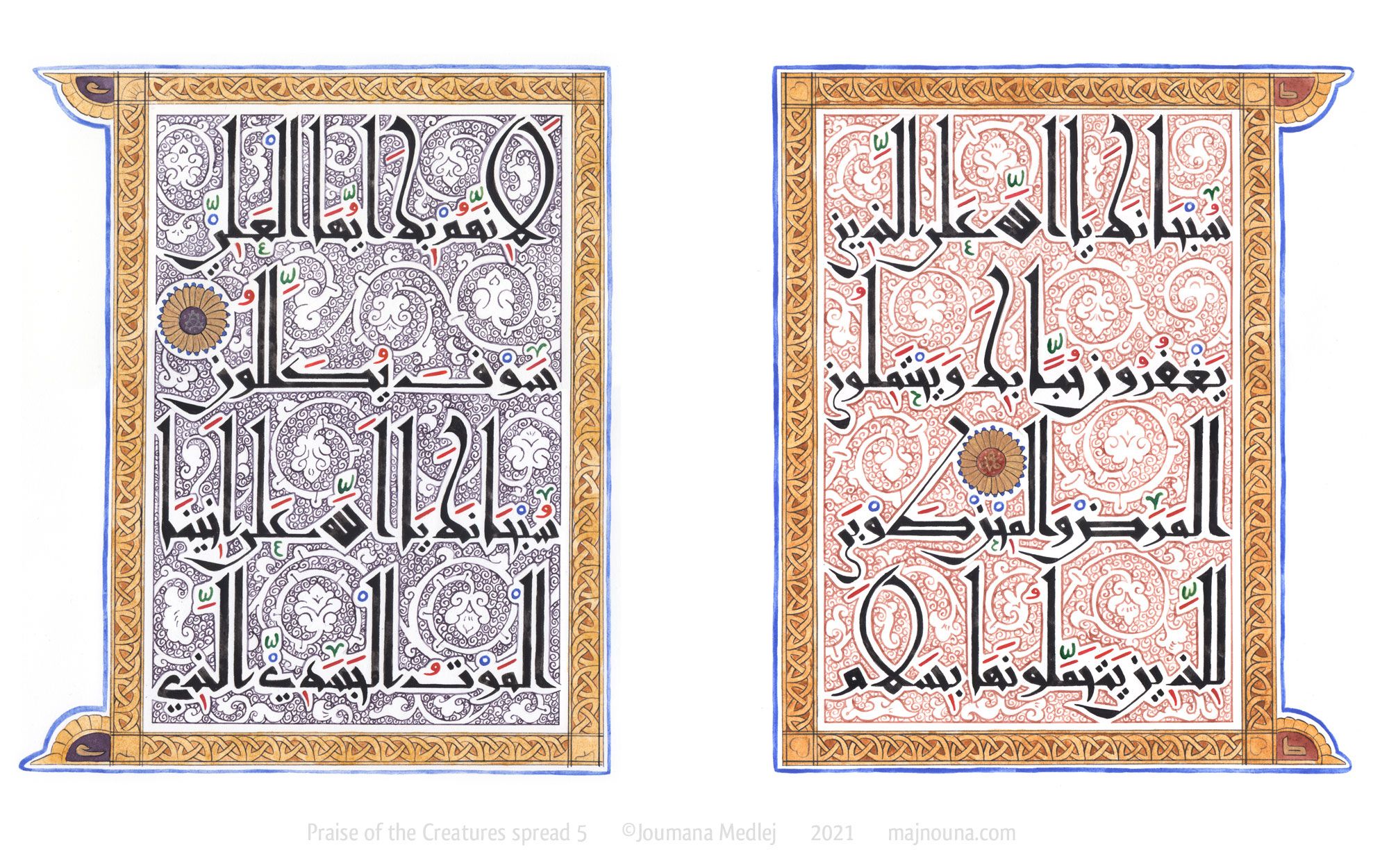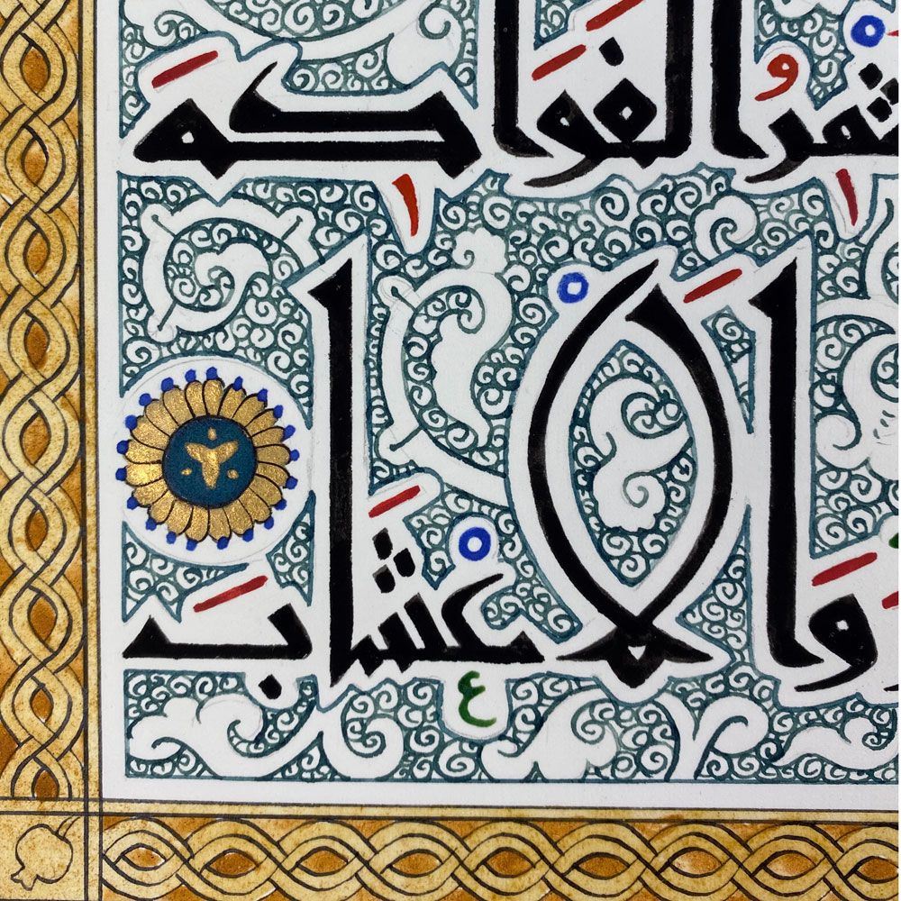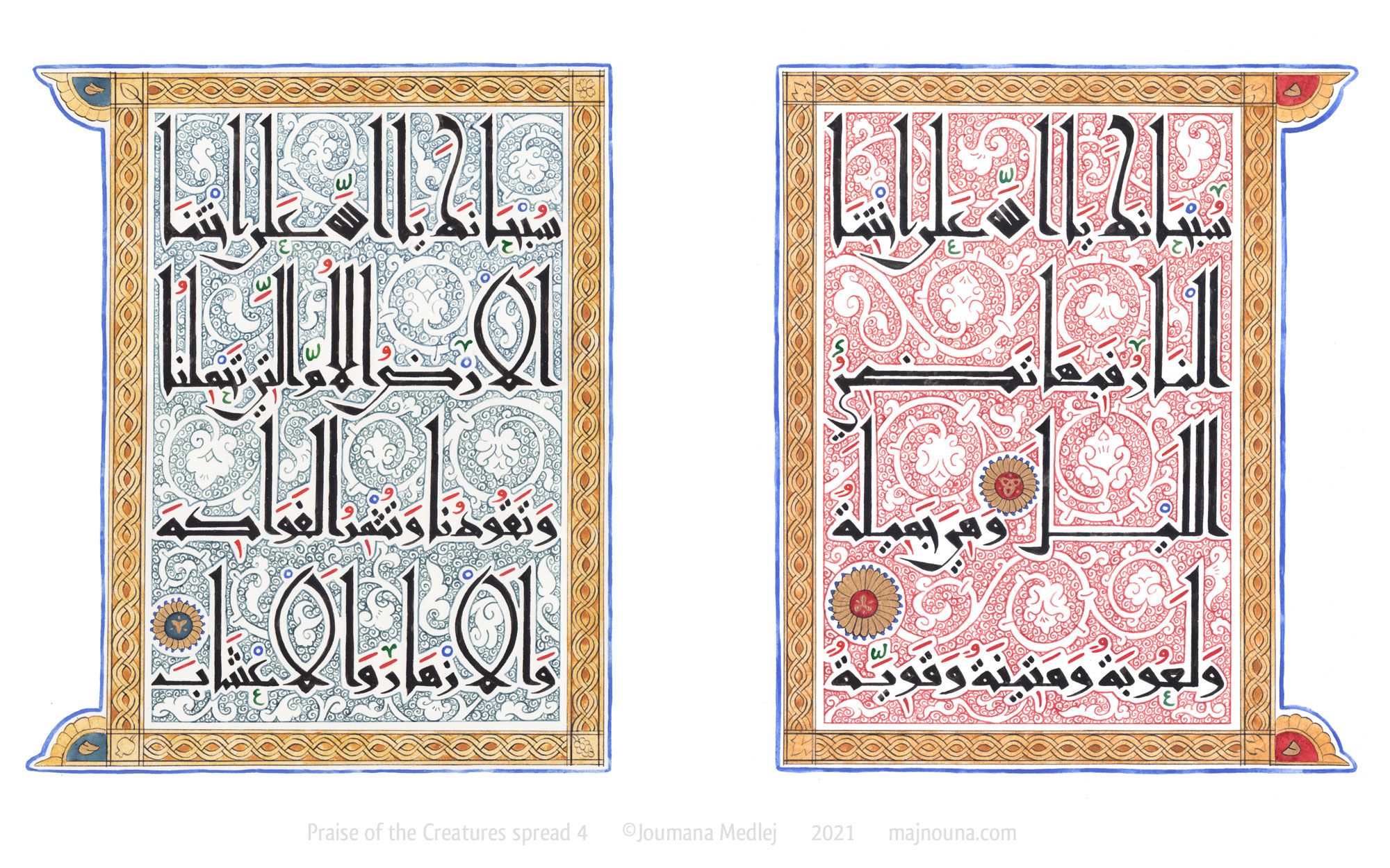 I reconstructed the script, which I believe was a one-off variant of mainstream Eastern Kufic, by studying a number of pages. I must specify I’ve never seen a page in the flesh, only in photos, which is far from the ideal way to deduce the materials used, but as the calligraphic tradition was quite consistent and this was a luxury production, I’m fairly sure of the core pigments I can see: carbon ink for the rasm (the core text), vermillion for harakāt, lapis lazuli for sukūn, and verdigris for shadda, hamza and ihmāl (no green is visible in any photo but all these are brown or burned through, which betrays the use of this unstable pigment. It’s also consistent with tradition.) The borders and verse markers are clearly illuminated with shell gold. The elaborate scrolling vines of the background appear to be done in (organic, plant-based) ink rather than (mineral) pigment, but I could be wrong on this point. It’s just that the variety of colours used (some pages still show a red, yellow or blue background pattern), the way some have faded, and the motif itself, which is more practical to do with a pen and a fluid colour, all suggest this medium. In any case that’s what I decided to go with.