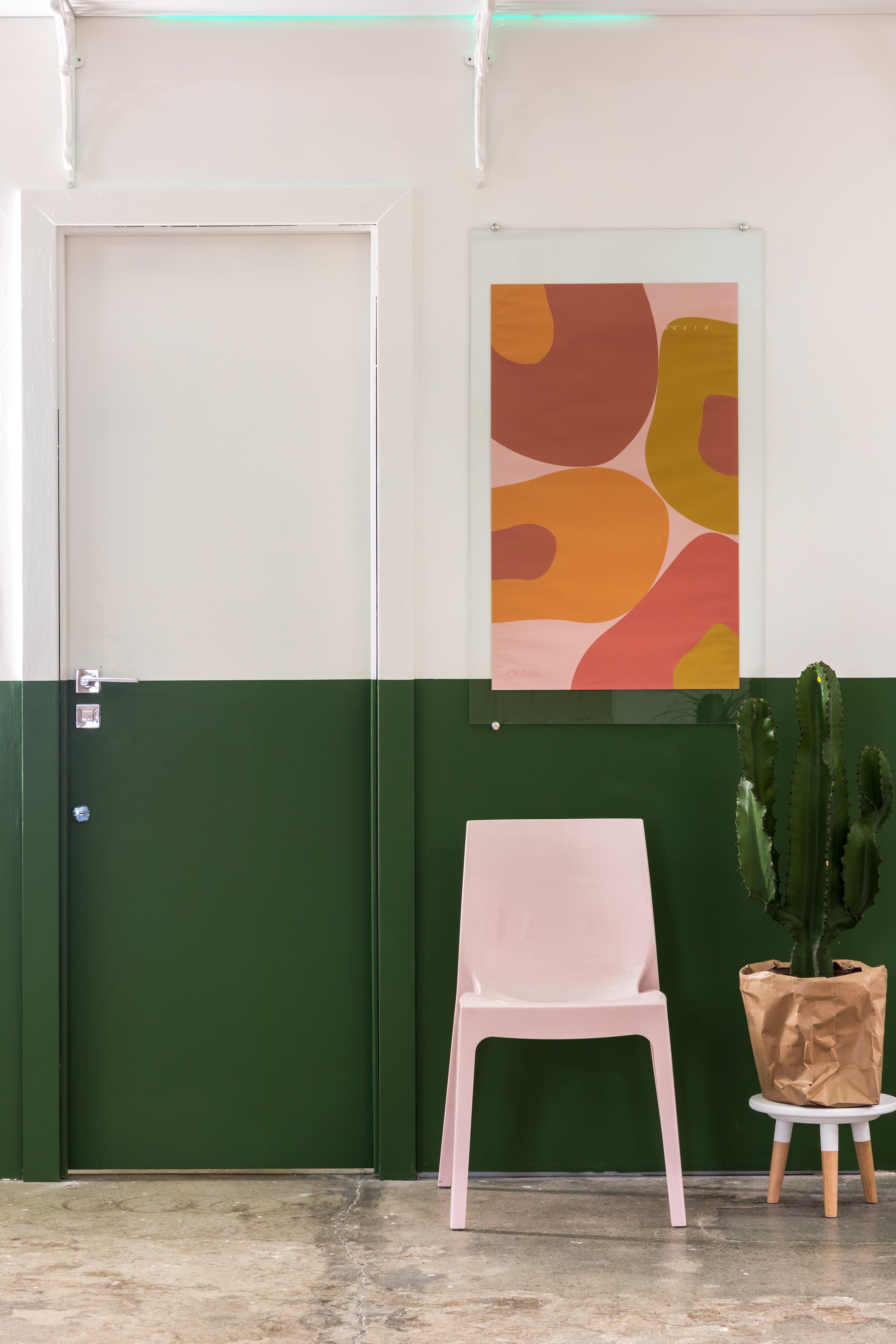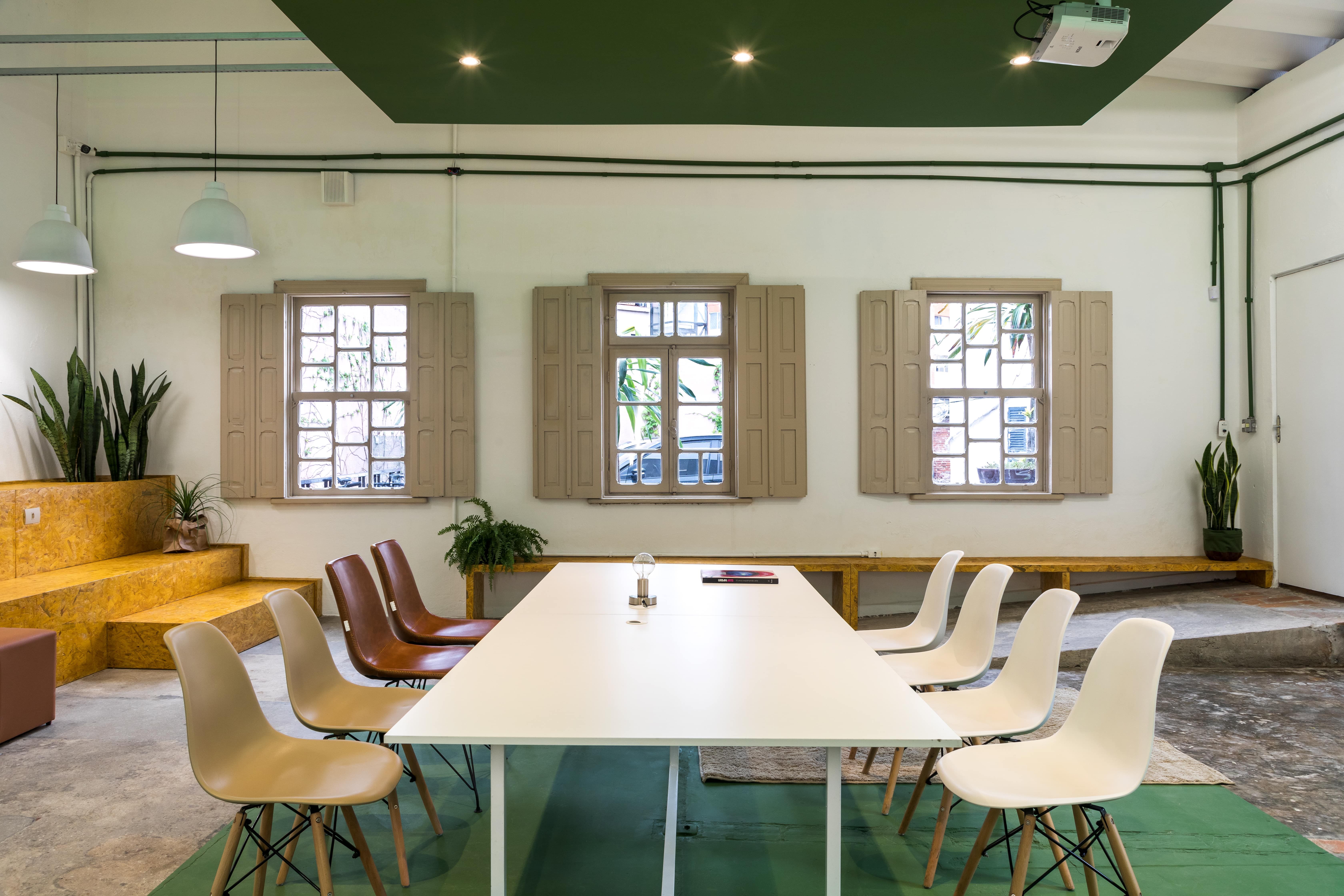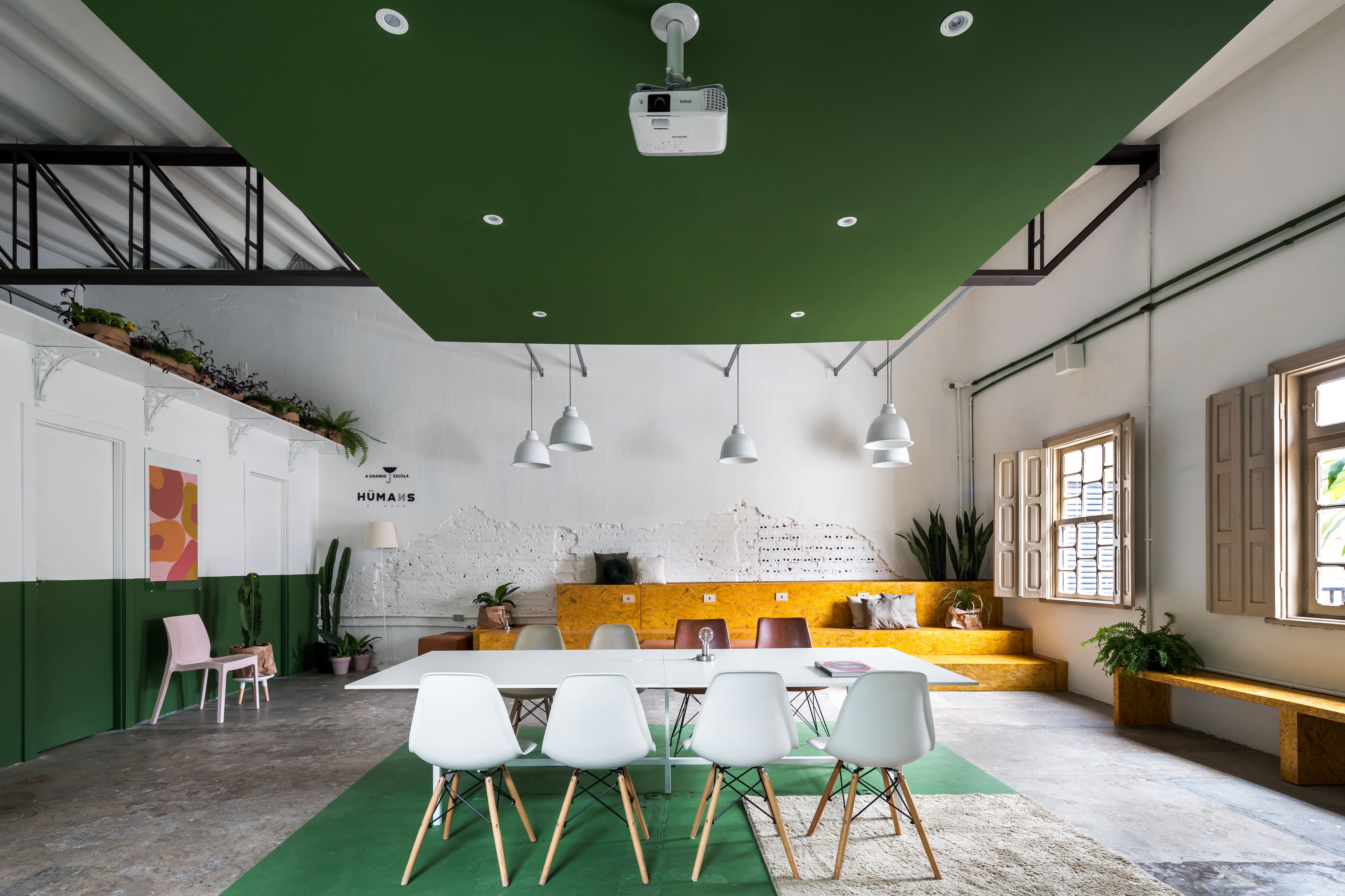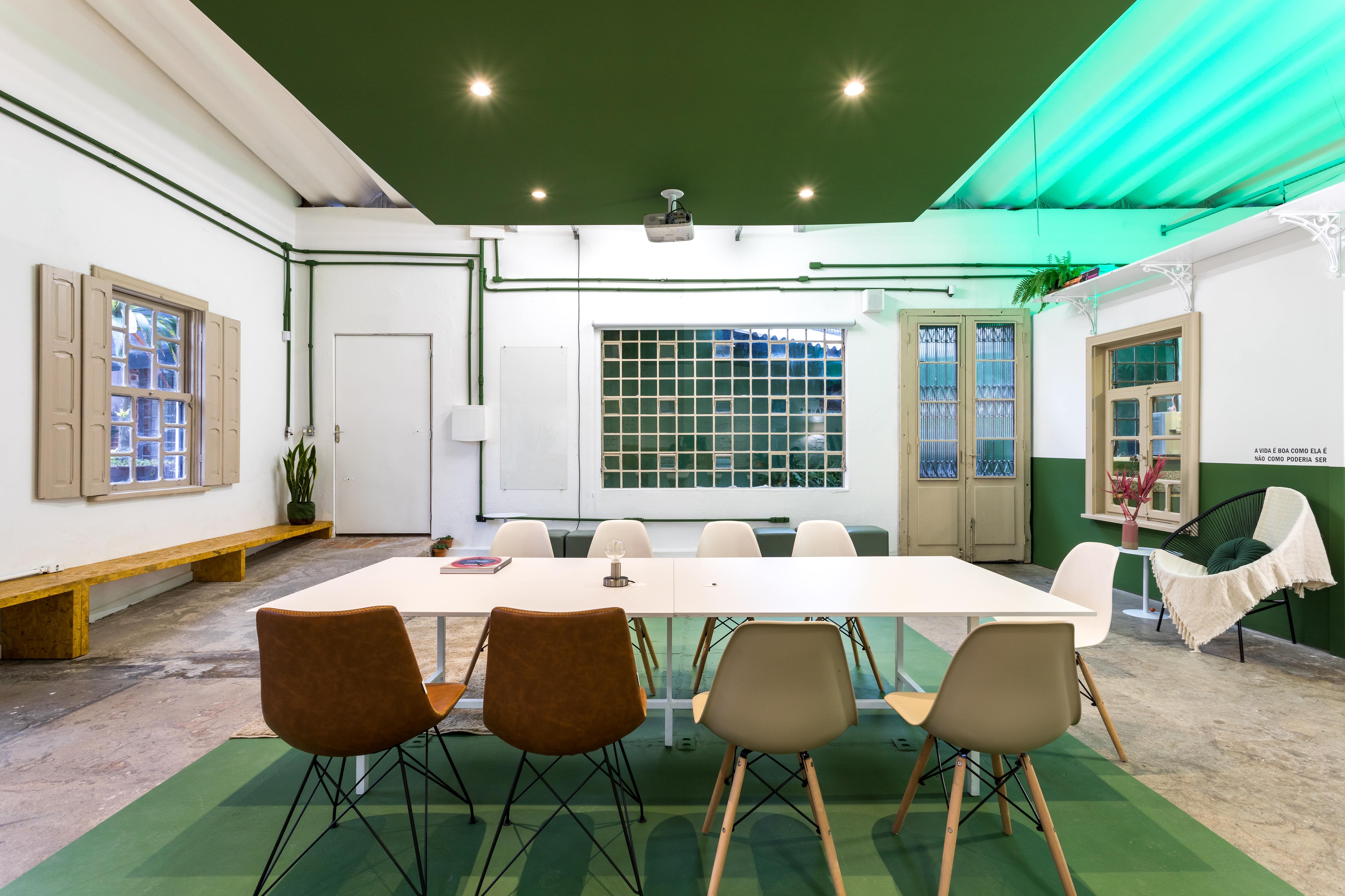 No projeto da Grande Escola o objetivo principal foi criar um ambiente flexível e adaptável, com cores que refletissem a essência da marca e do espaço colaborativo, que funciona como escritório e também recebe eventos.