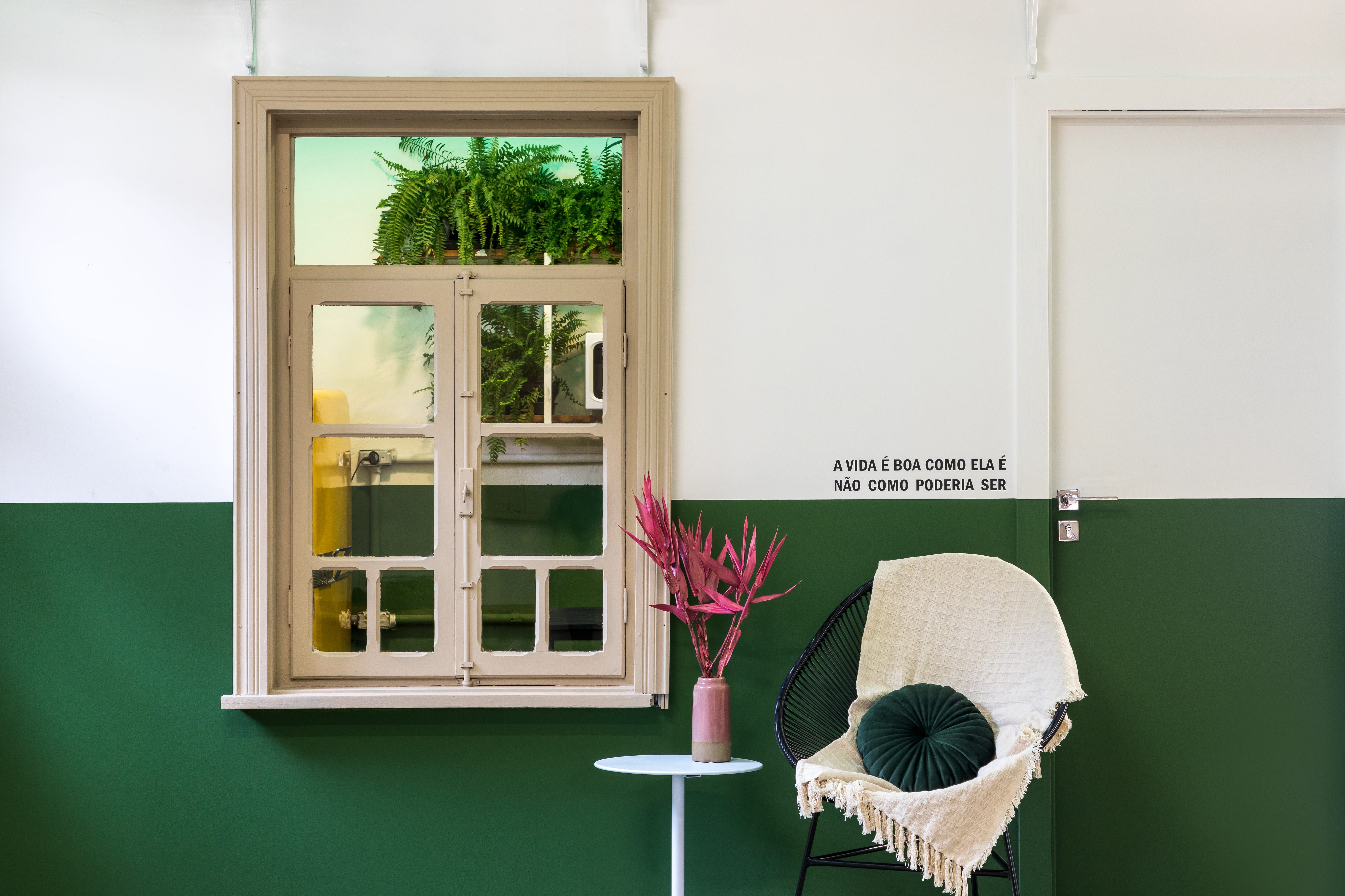 Buscamos criar um lugar aconchegante, utilizando materiais de baixo custo. A arquibancada de OSB, por exemplo, é um espaço para que as pessoas se sentem, mas também acolhe as plantas da Borealis.