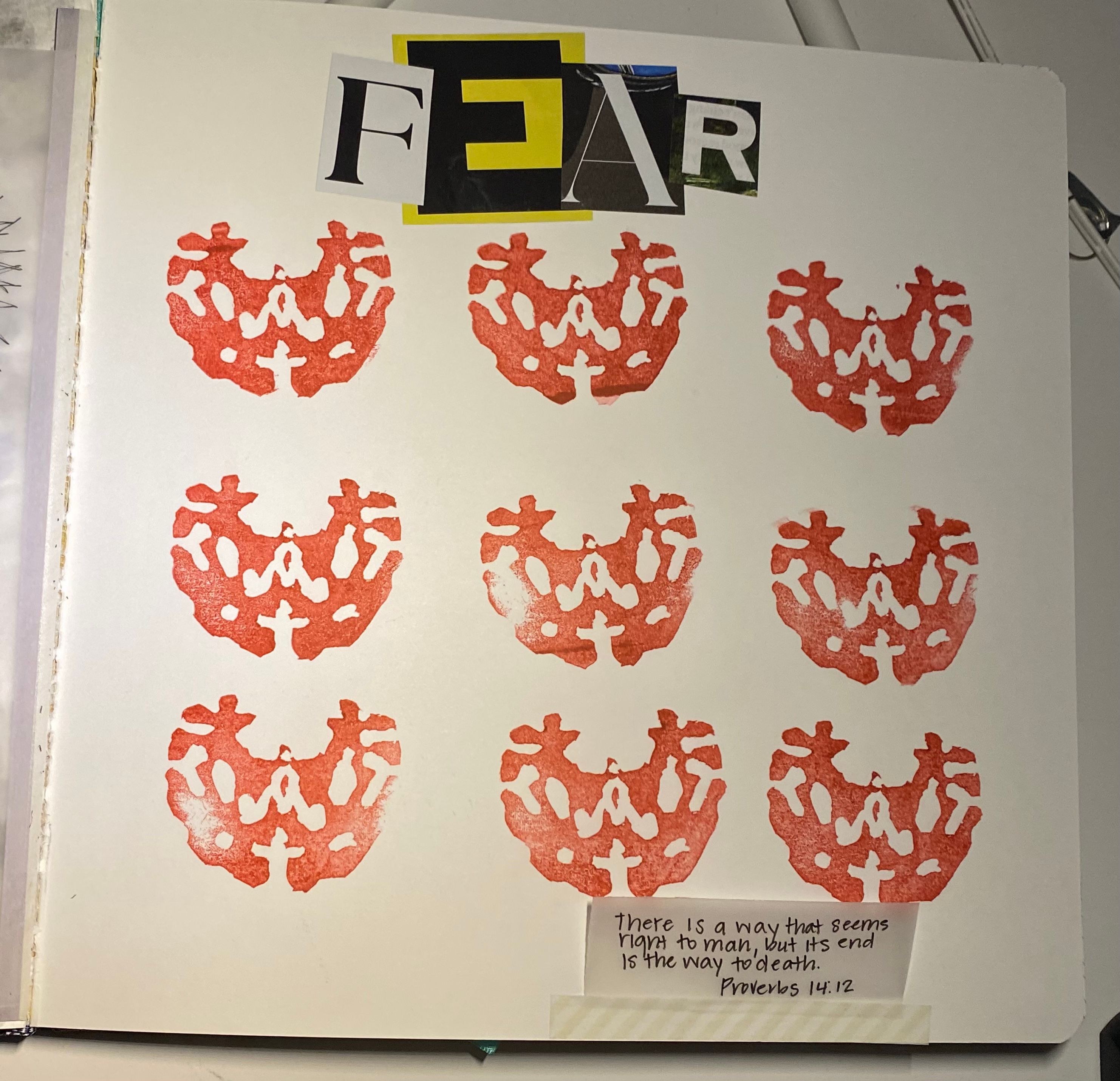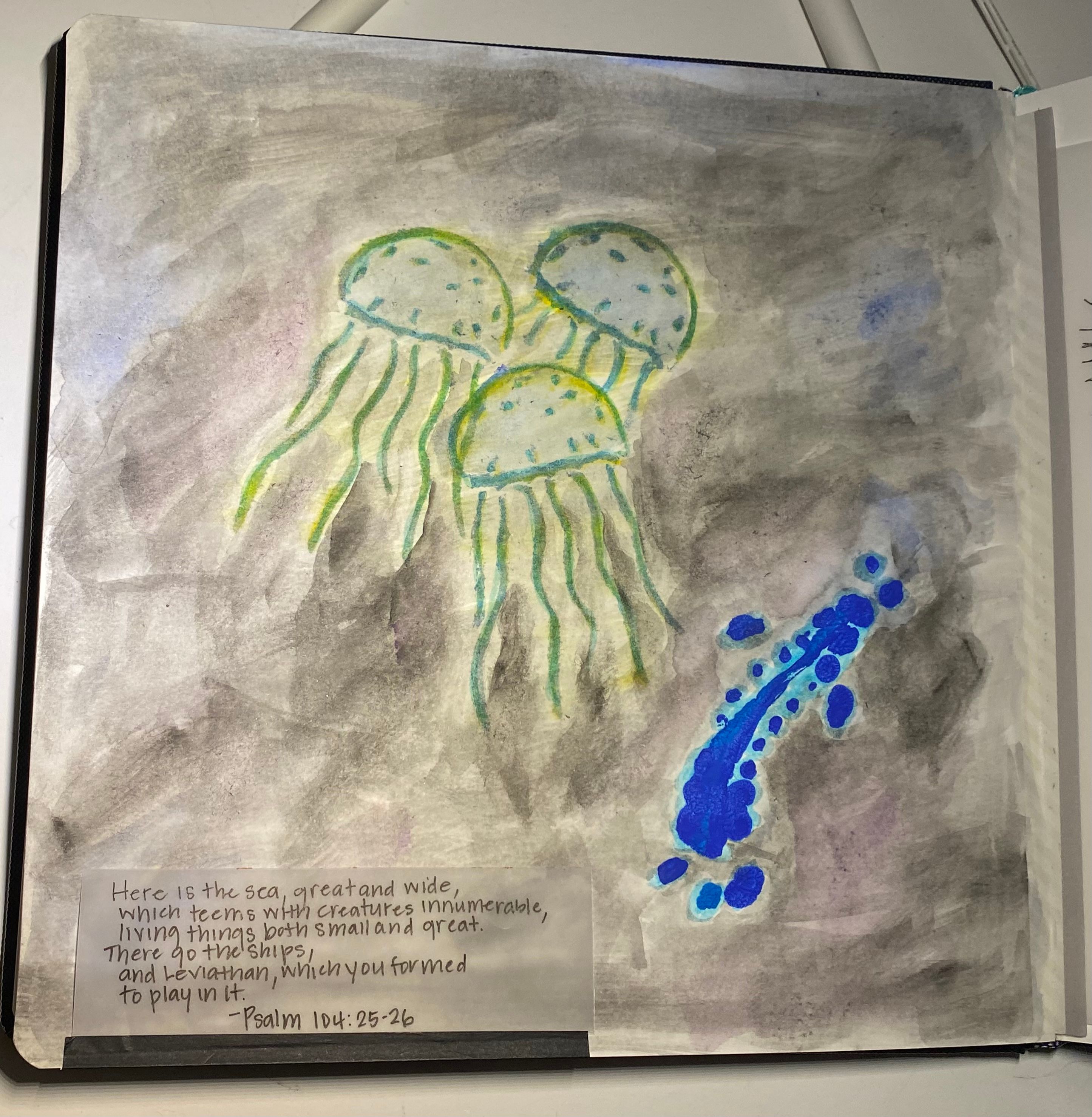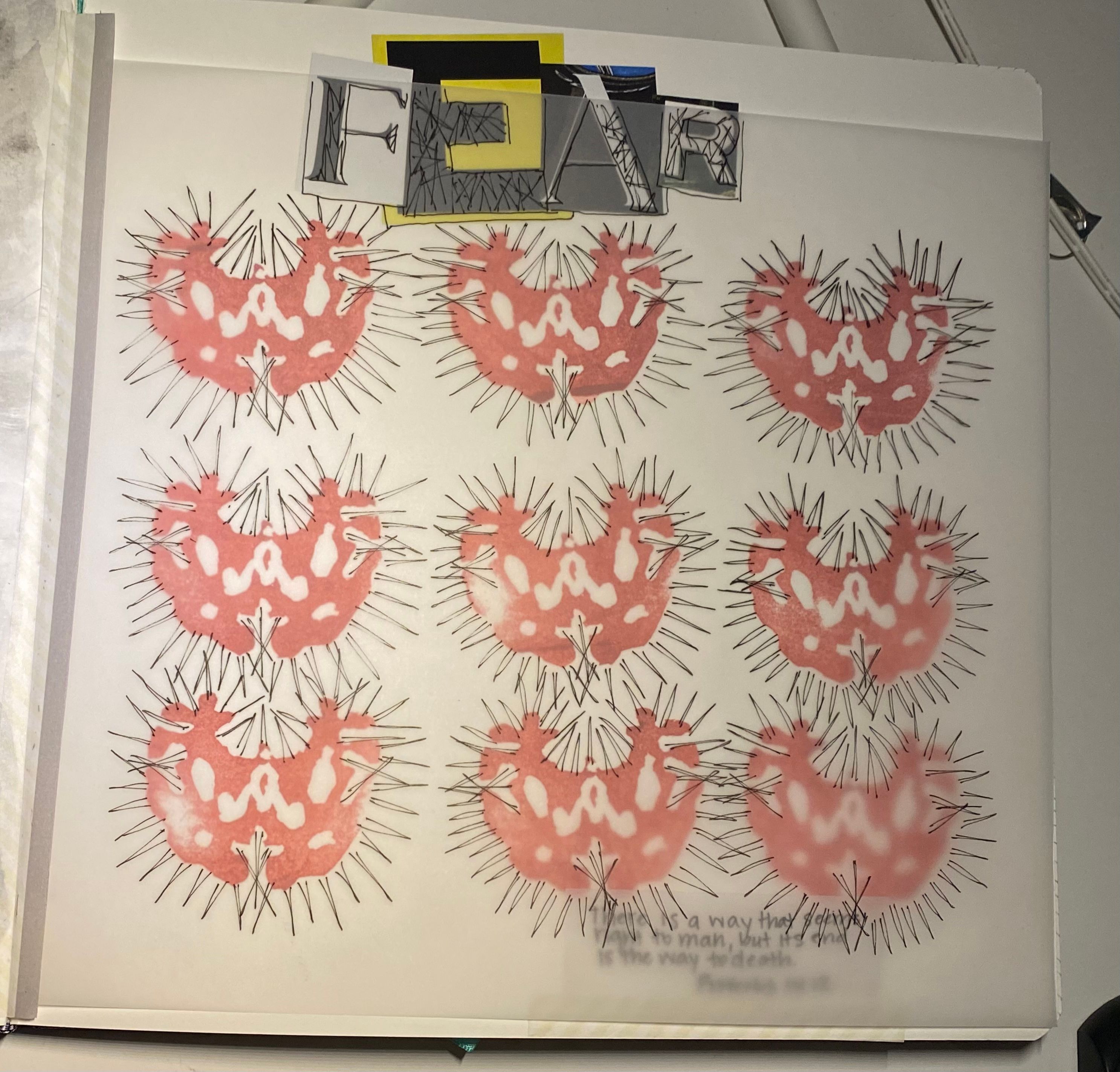 Inspirations old and newMy inspirations also include art as booksState of play with my inspirationsEach theme of light & dark includes a companion bible verse. Theme 1: Good vs evilScience between happy and sad in the brainSpaceBioluminescence in the deepFound this beautiful pattern researching the brain…only too late see that it’s an animal specimen in fearLight is the hope of science and the dark is animal testingWhich wolf do you feed?My demons: the heavy weight of responsibilities and the whisperer of seeds of doubt