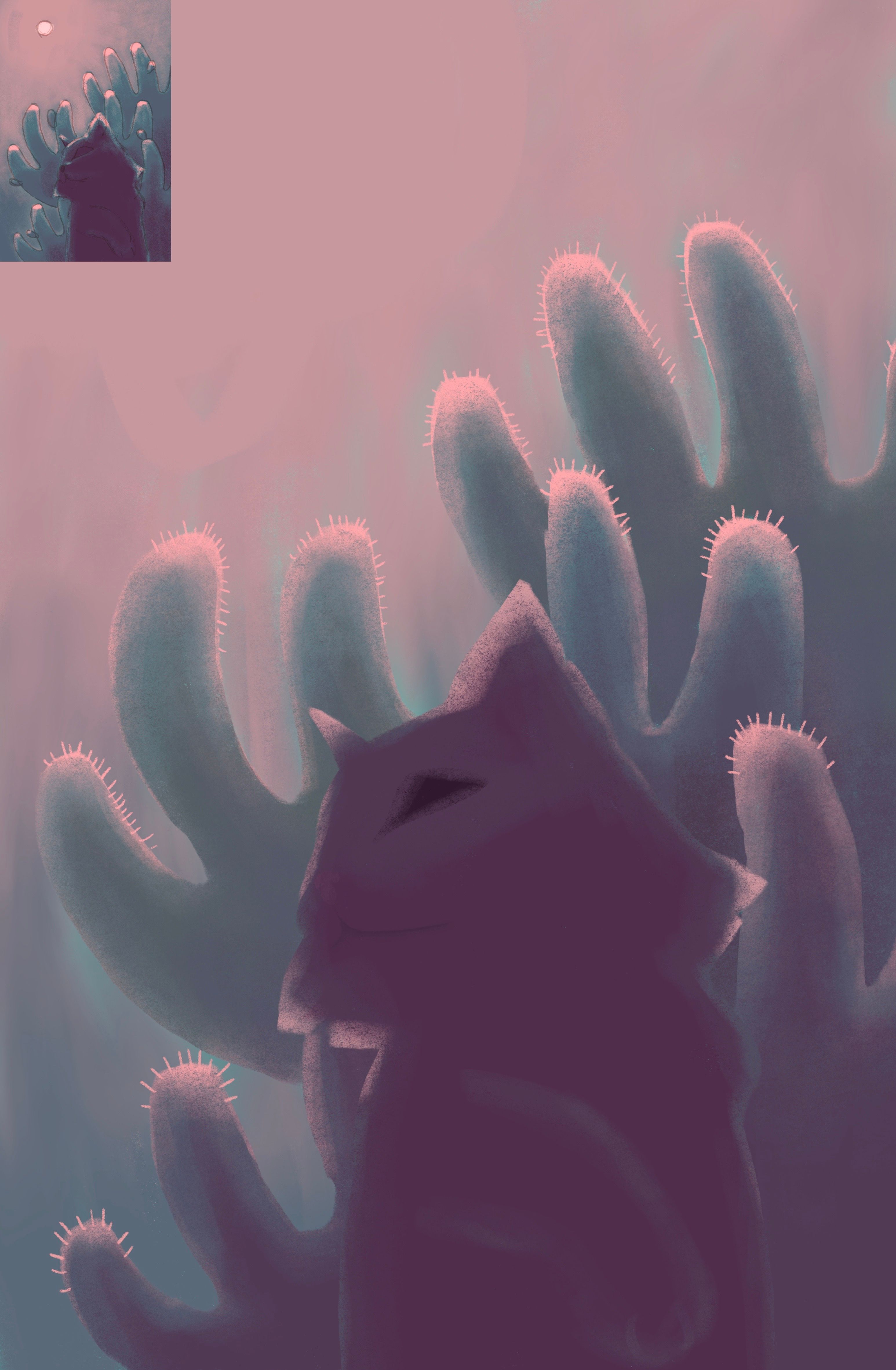 I knew that what I wanted to paint was going to have vibrant colors and a mysterious nighttime atmosphere (which later changed to a cozy and warm atmosphere, I'll explain). Next, keeping Ramona's lotus plant illustration in mind, I picked a plant that also behaves dynamically in interesting lighting scenarios. So, I picked a cactus in the desert with a cat (cats are very aesthetically pleasing to me) as my subject.