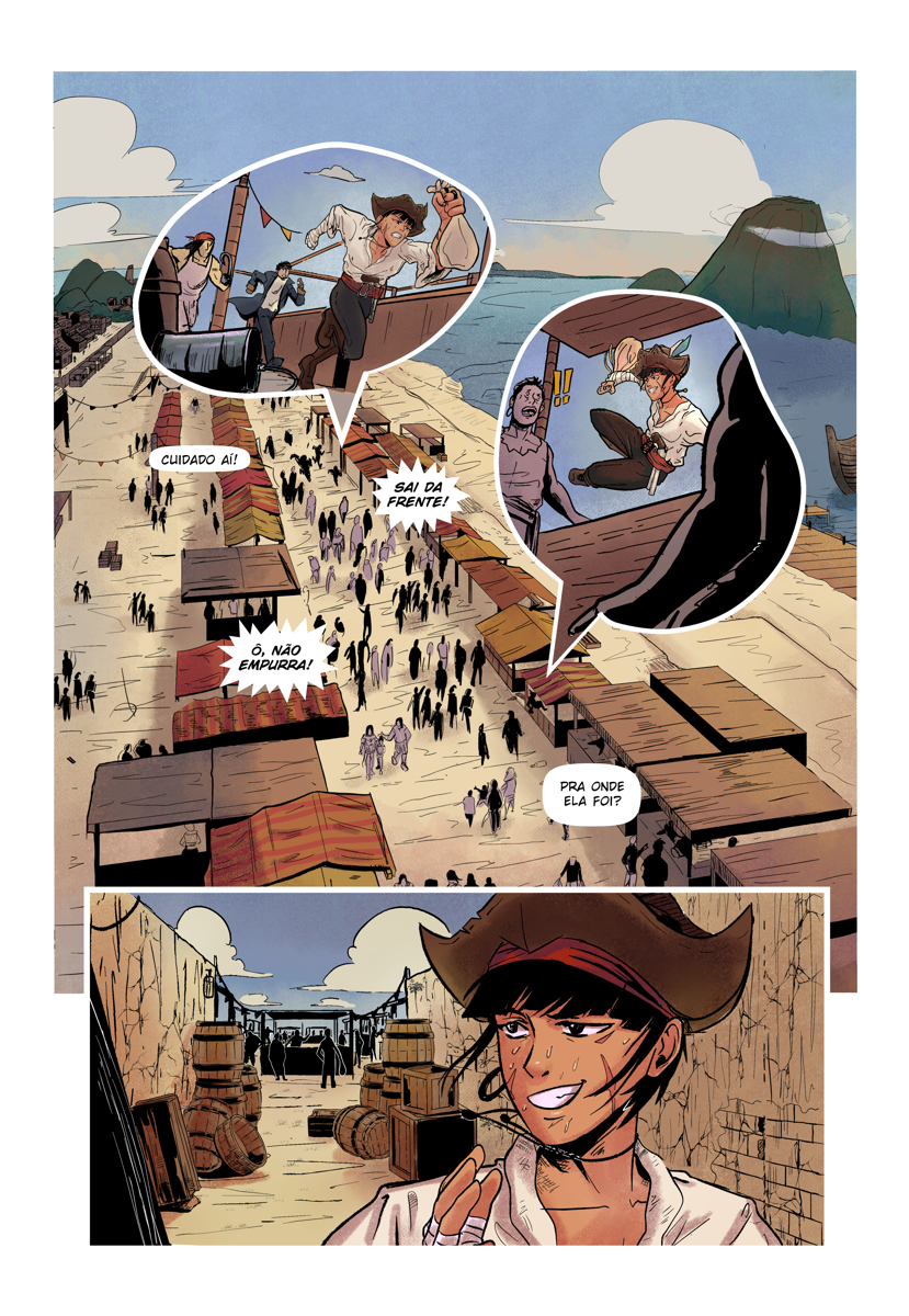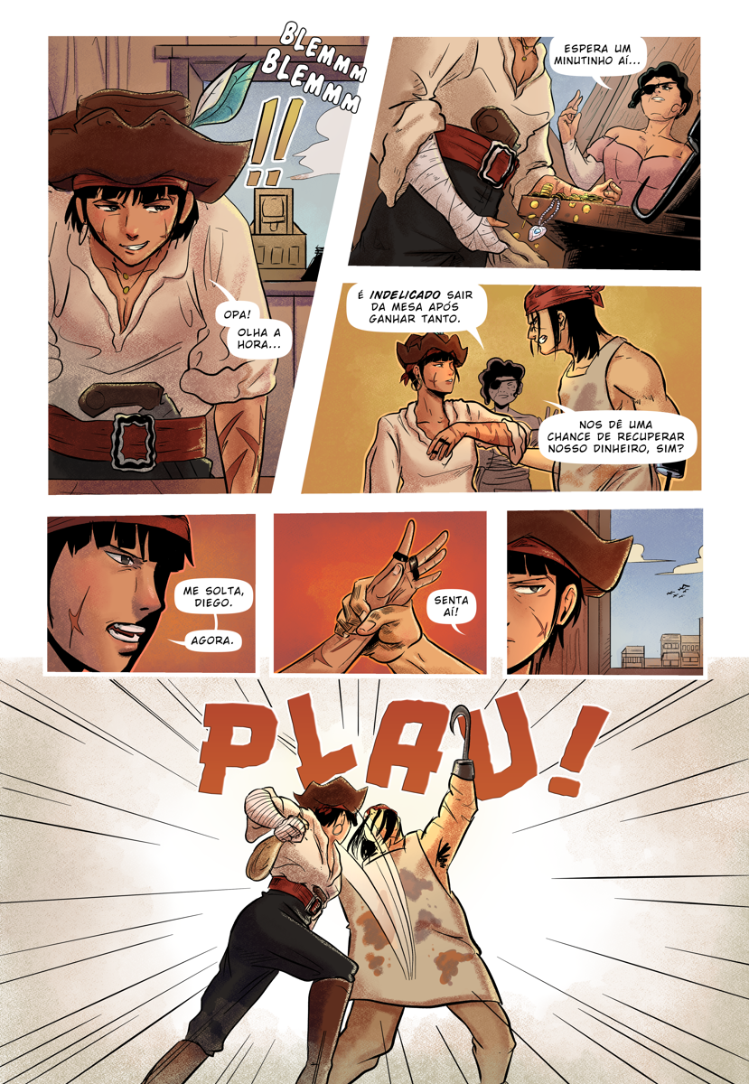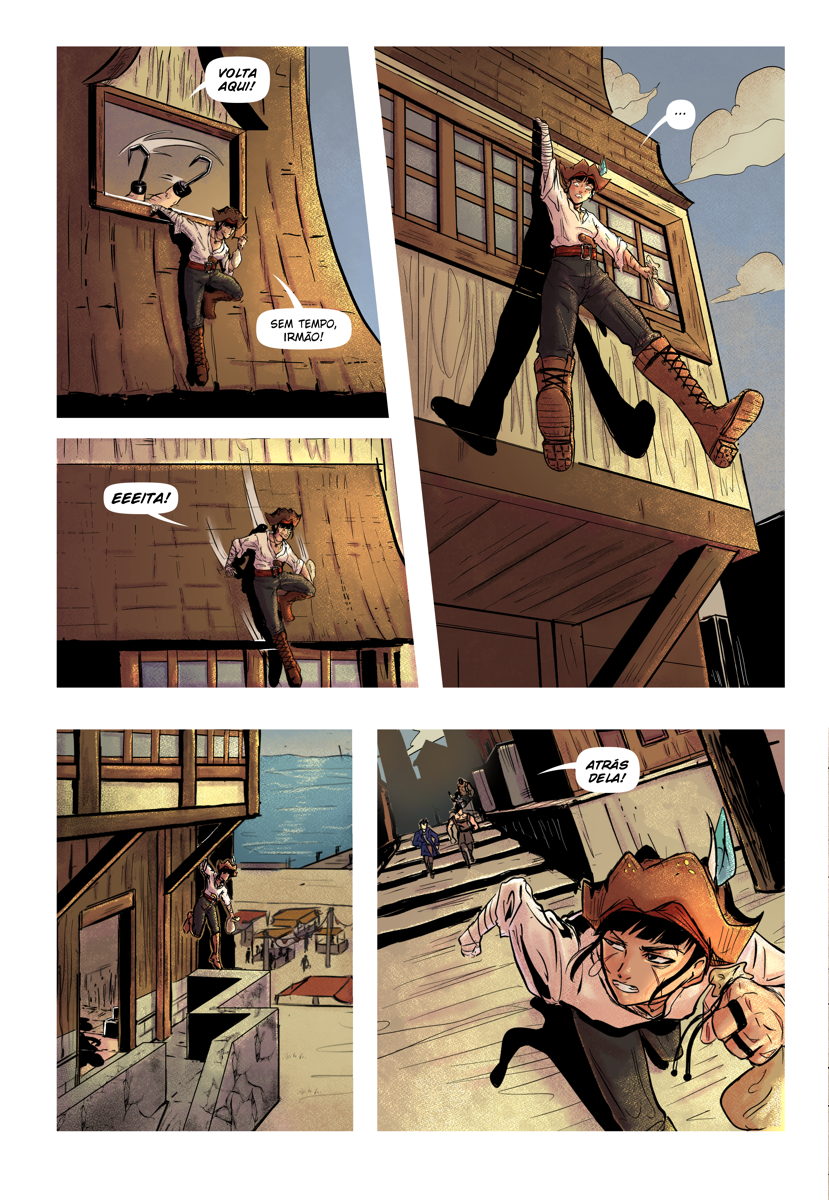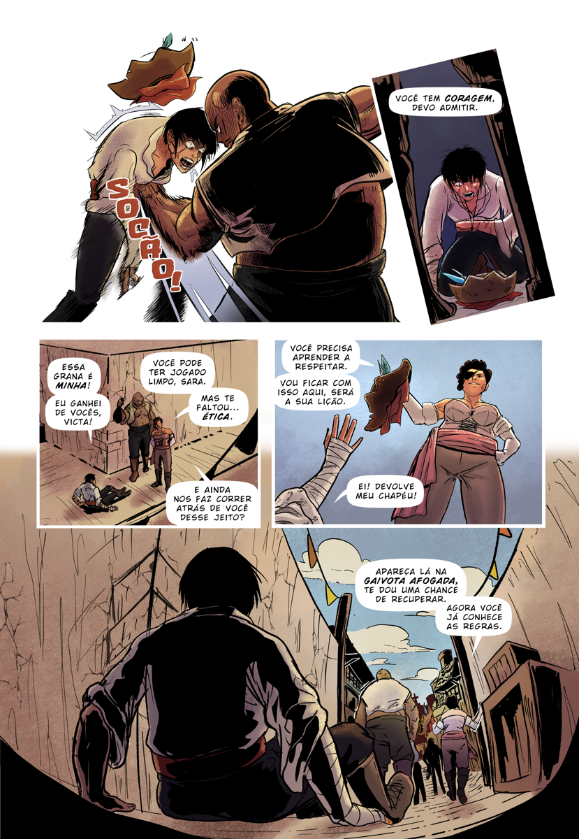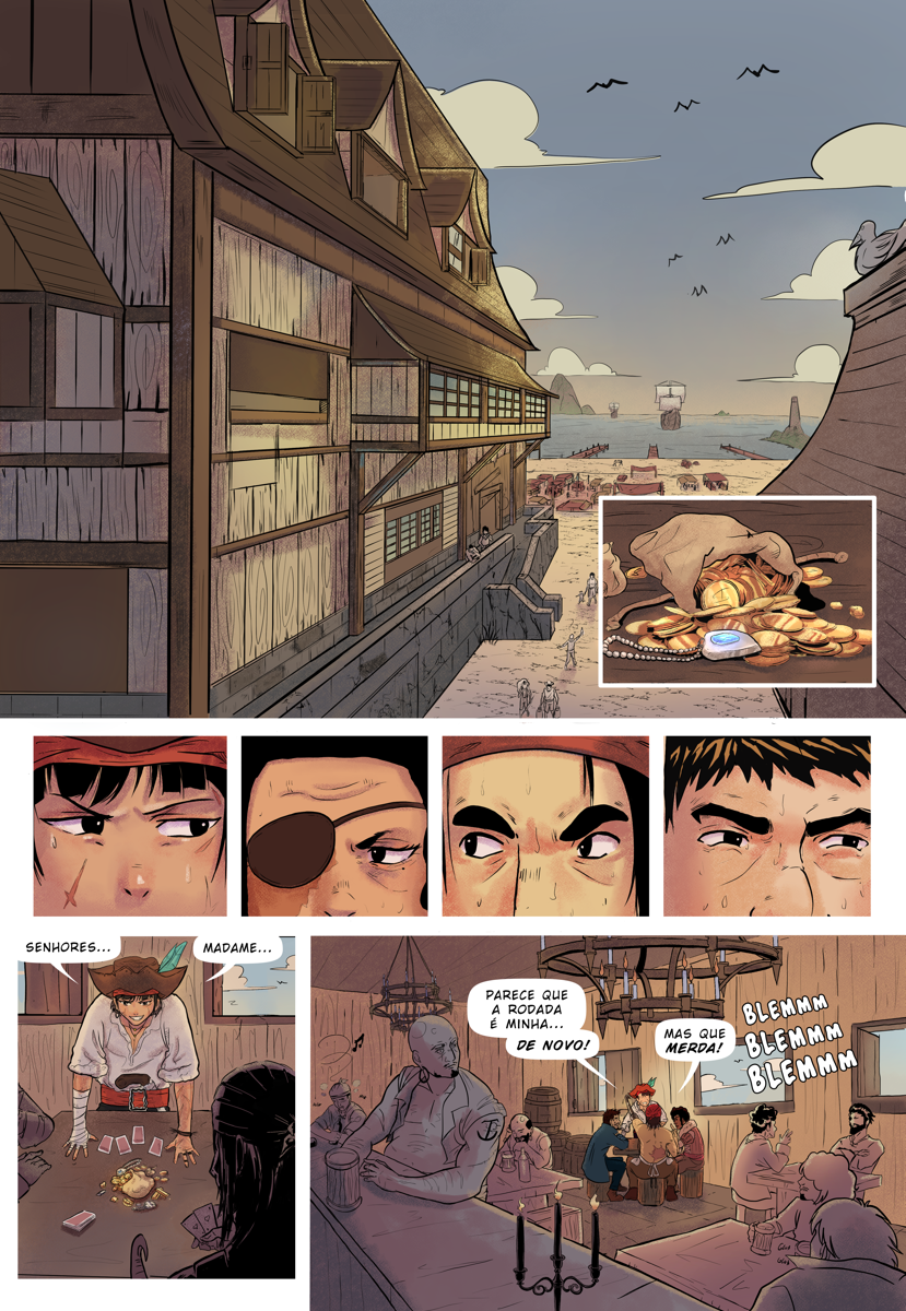 O projeto tudo ou nada é um quadrinho de 06 páginas, que conta uma aventura sobre a pirata Sara. Desenvolvido em trio (Roteiro, arte e cores), fiquei responsável pelo Lápis, arte final e Logo do projeto. A HQ selecionada na convocatória pra quadrinhos independentes da editora Universo Guará.