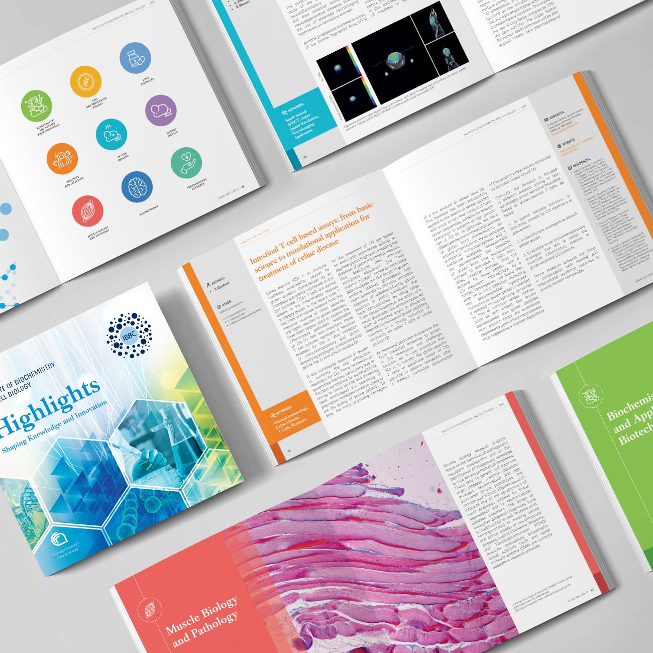 Art direction, layout design and vector illustrations of the 150 page brochure "Highlights – Shaping Knowledge and Innovation", a corporate brochure and collection of research articles for IBBC – Institute of Biochemistry and Cell Biology, part of CNR (National Research Council of Italy).