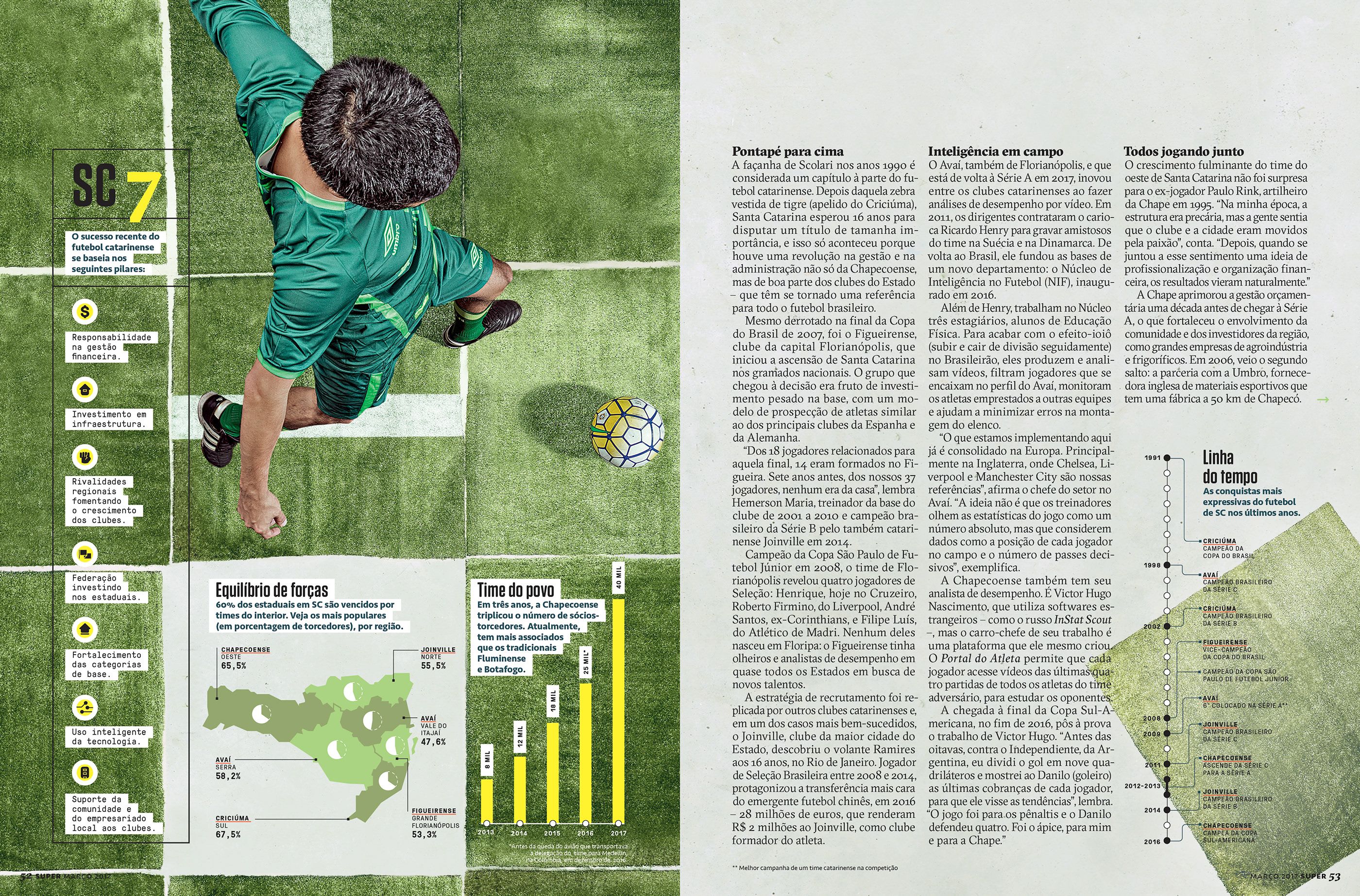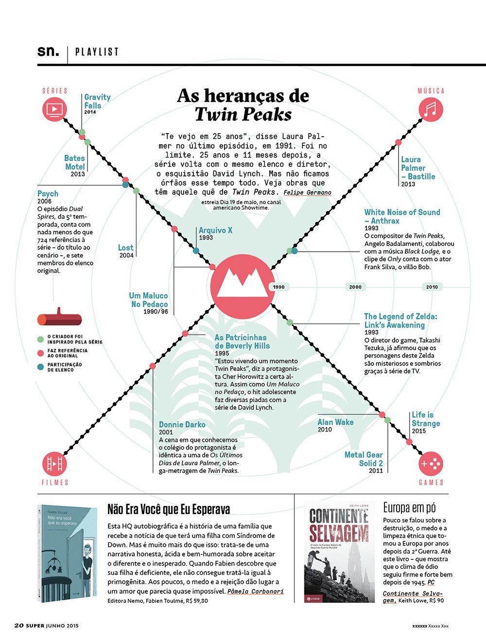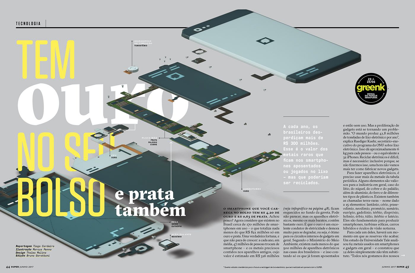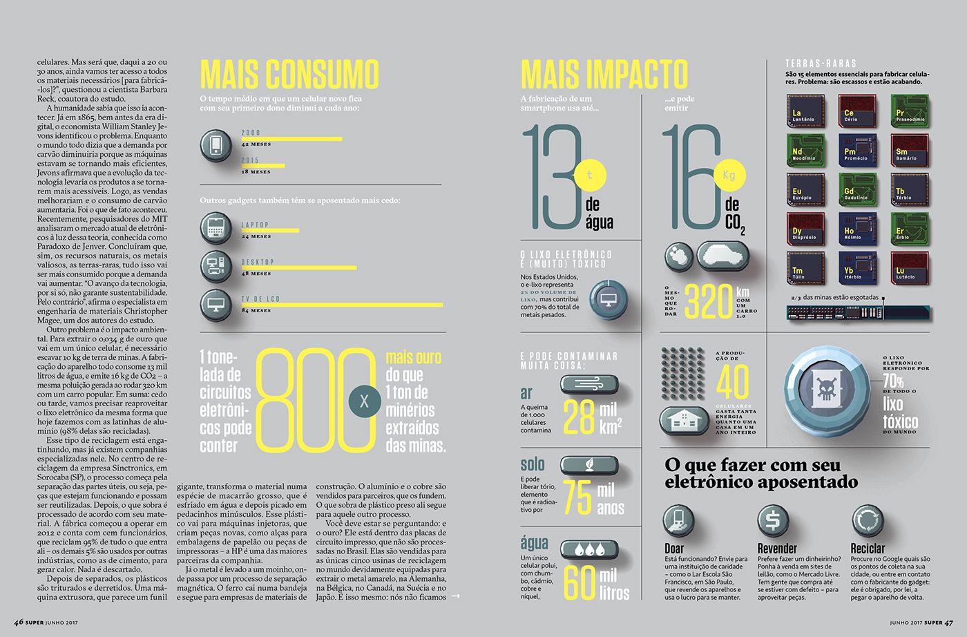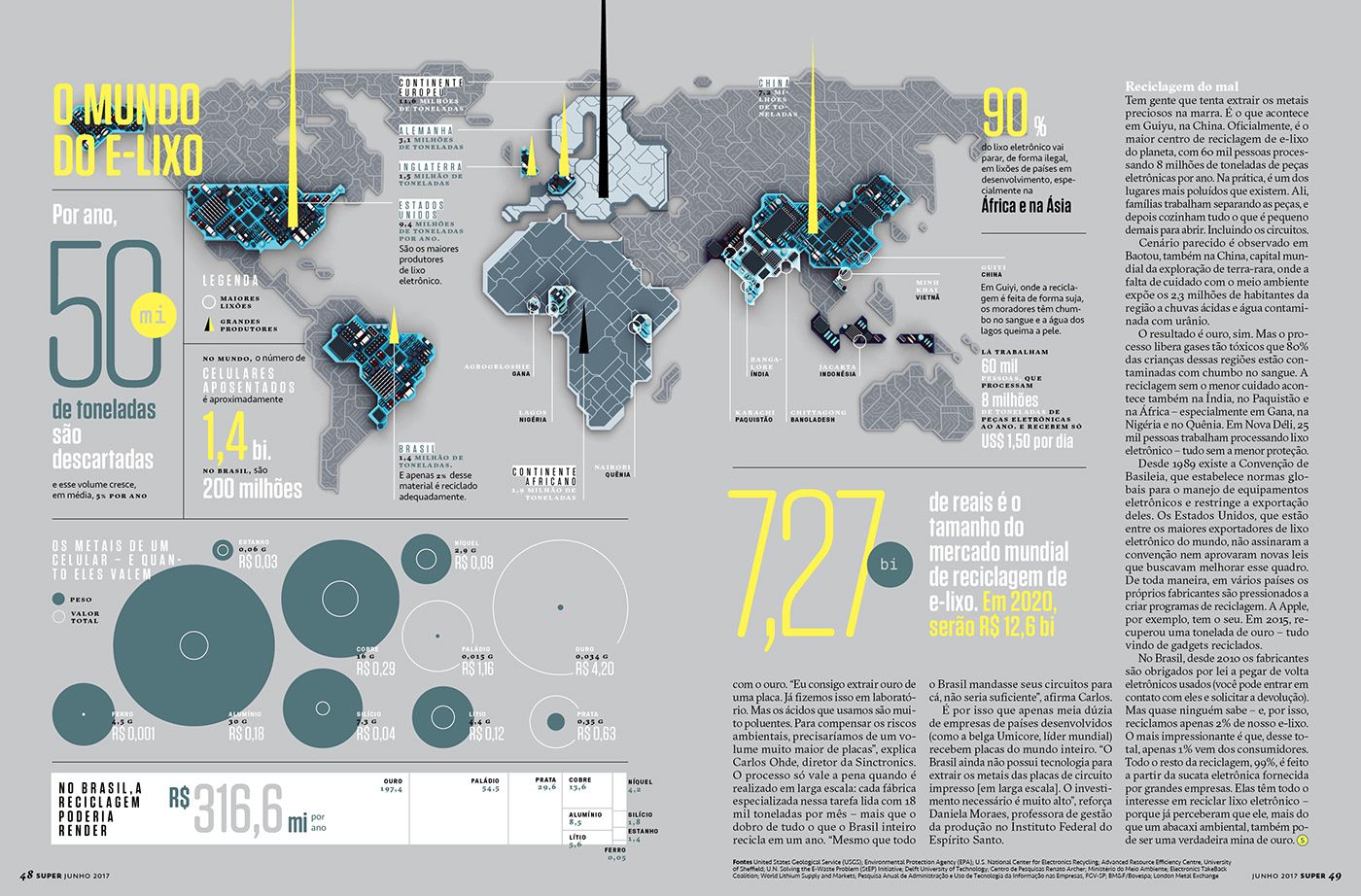 A vista explodida de um celular mostra seus principais componentes.E esta página-dupla mostra seu consumo e impacto relativo no meio-ambiente.As peças do celular formam um mapa e onde suas peças usadas vão parar, além do valor dos componentes.Série de páginas comparando a organização do futebol do estado brasileiro de Santa Catarina.A base do jogador se monta a cada página.Sempre com o auxílio de números e gráficos para reforçar a narrativa.Conexões entre livros e filmes de Stephen King.Títulos conectados a seus gêneros em uma linha do tempo de produções da Netflix.Obras influenciadas por Twin Peaks.Relação entre ovos de aves e seus pesos quando adultos.