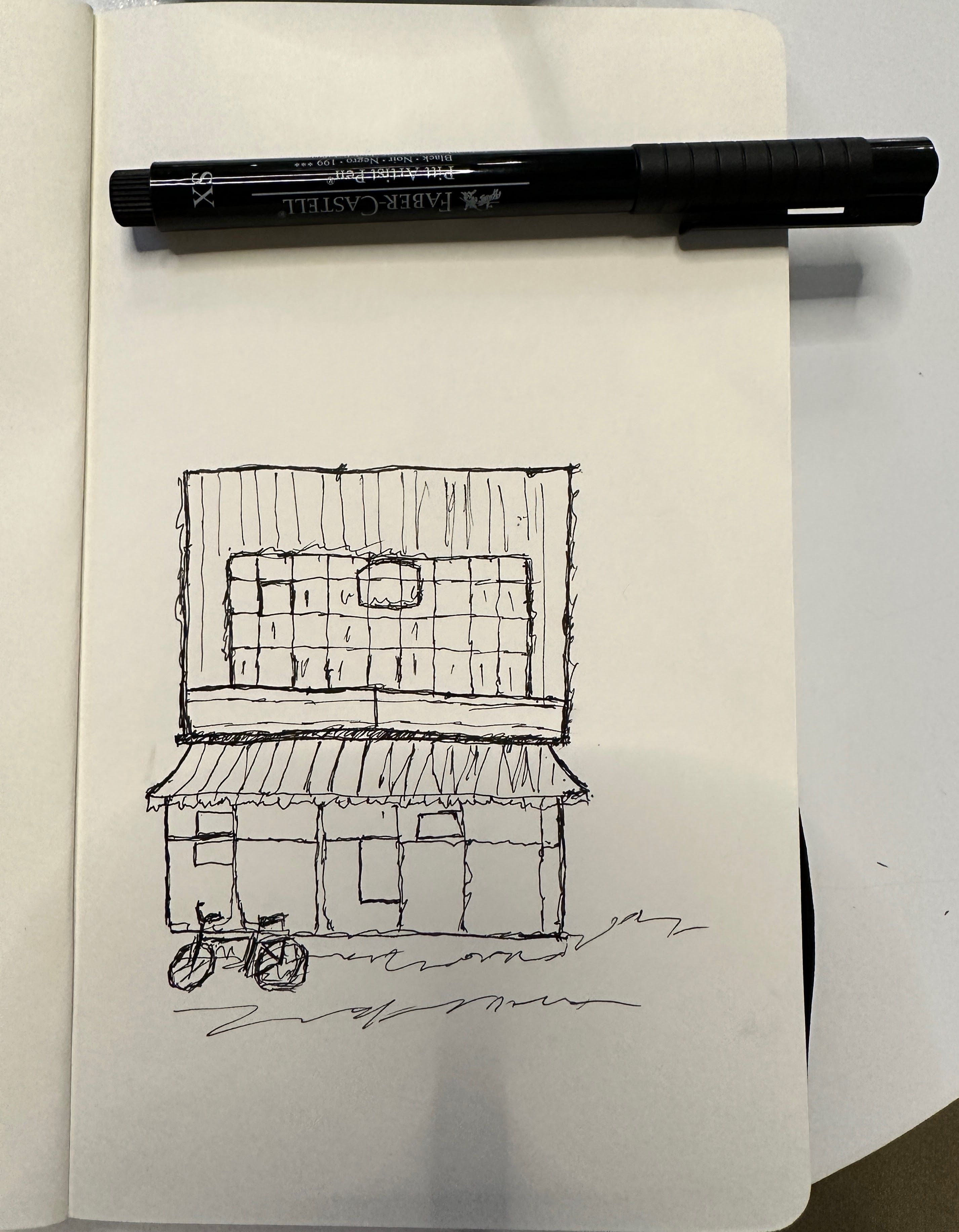 Bello schizzo del mio tipo di edificio preferito!! Bella quella piccola bicicletta! Potresti aggiungere un po' più di profondità aggiungendo una sezione leggermente più scura all'area sotto la protezione solare. Prova anche tu e vedi che riesci a dare più indicazione tra il colore della terra e del cielo. Ciò consentirà all'edificio (e alla bicicletta!) di essere più a terra. Grazie mille per aver condiviso il tuo lavoro!!