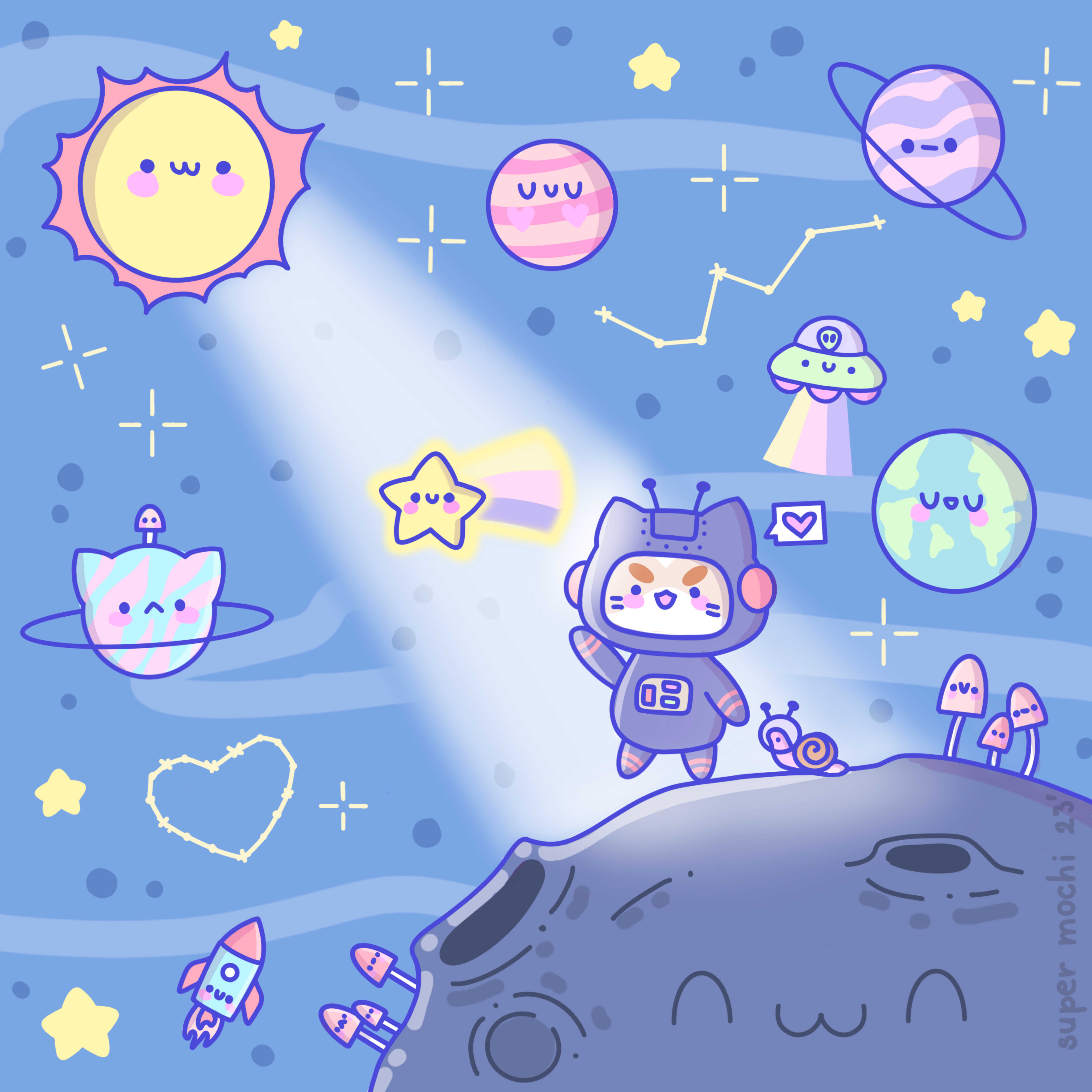 Travelling into space with Harold the grumpy kitty and Ernest his pet snail. Harold is trying to reach a shooting wishing star. Even he looks always grumpy , he is a very feeling and emotional cat. Things aren't always what they seem. Also in the background you can see a solar system with different life forms.
