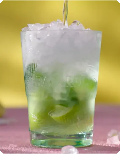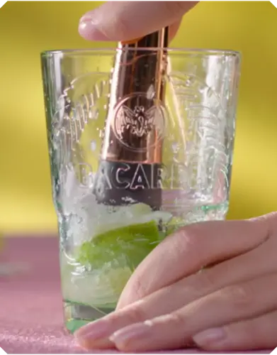 poi versò nel bicchiere il ghiaccio, poi il rum ed infine l'acqua minerale con la menta.