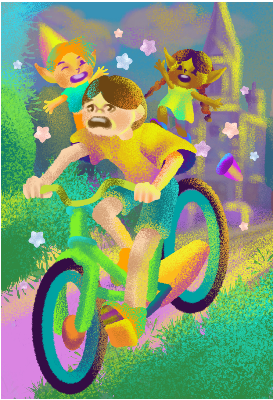 Este proyecto lo realice para la publicación de historias plurilingües. El cuento que ilustre se llama "Che ¿No sabes andar en bici?" escrito por Magdalena Guevara que cuenta la historia de Alberto un niño muy sumergido en los relatos de sus libros. Un día mira por la ventana y se encuentra con estos dos personajes. Beto y Anita, unos duendes muy simpáticos que jugueteaban con una bicicleta. Anita lo descubre y asi continua esta bonita historia.