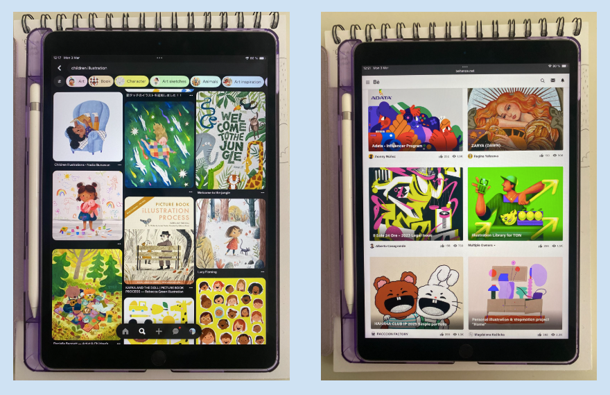 Inizio prendendo ispirazione da siti di illustrazione, come Behance o Pinterest, giusto per dare sfogo alla mia immaginazione e alla mia creatività. Cerco di trovare un'idea che susciti qualcosa, o anche solo pochi elementi che possano entrare in sintonia con me.