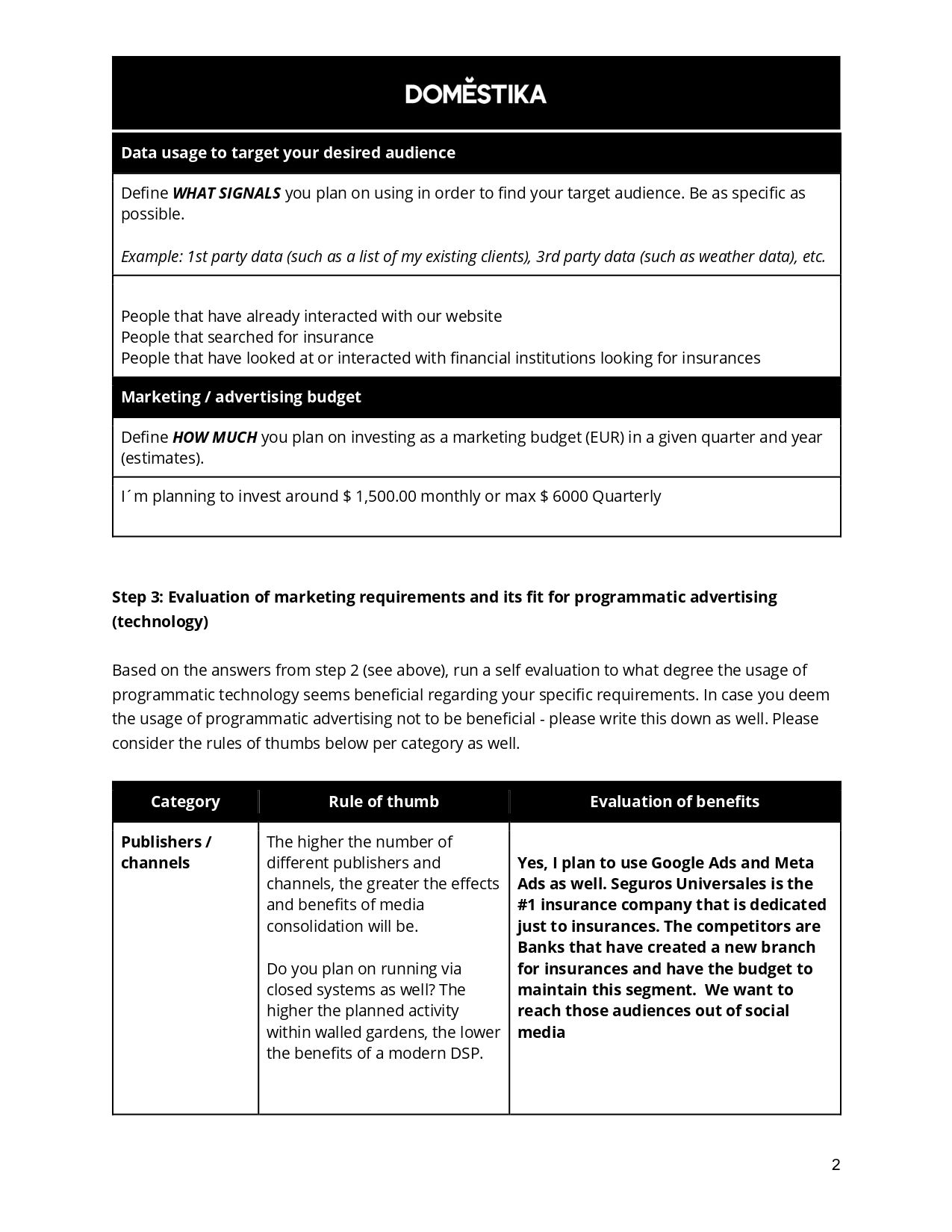 Ciao Daniel, mi piace questo progetto finale. In termini di formati, direi che GIF può essere un tipo di display o video. Anche Pop-Up è una funzione specifica. Hai ragione in termini di utilizzo di un DSP completo rispetto a Google Ads / Meta. Per un budget di 6k al mese, faresti meglio con questi strumenti. Spero che il corso ti abbia fornito un sacco di valore! Cordiali saluti!