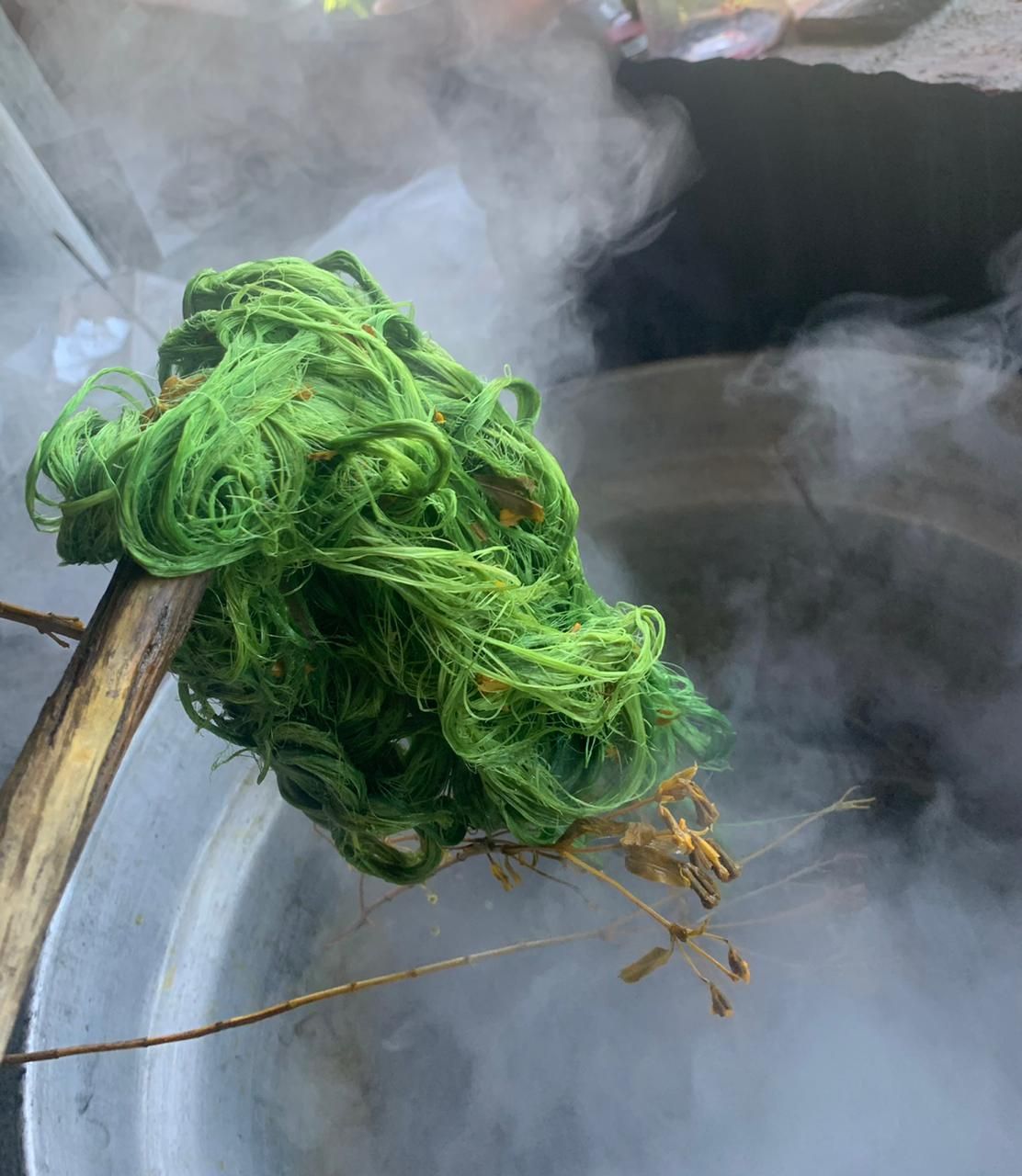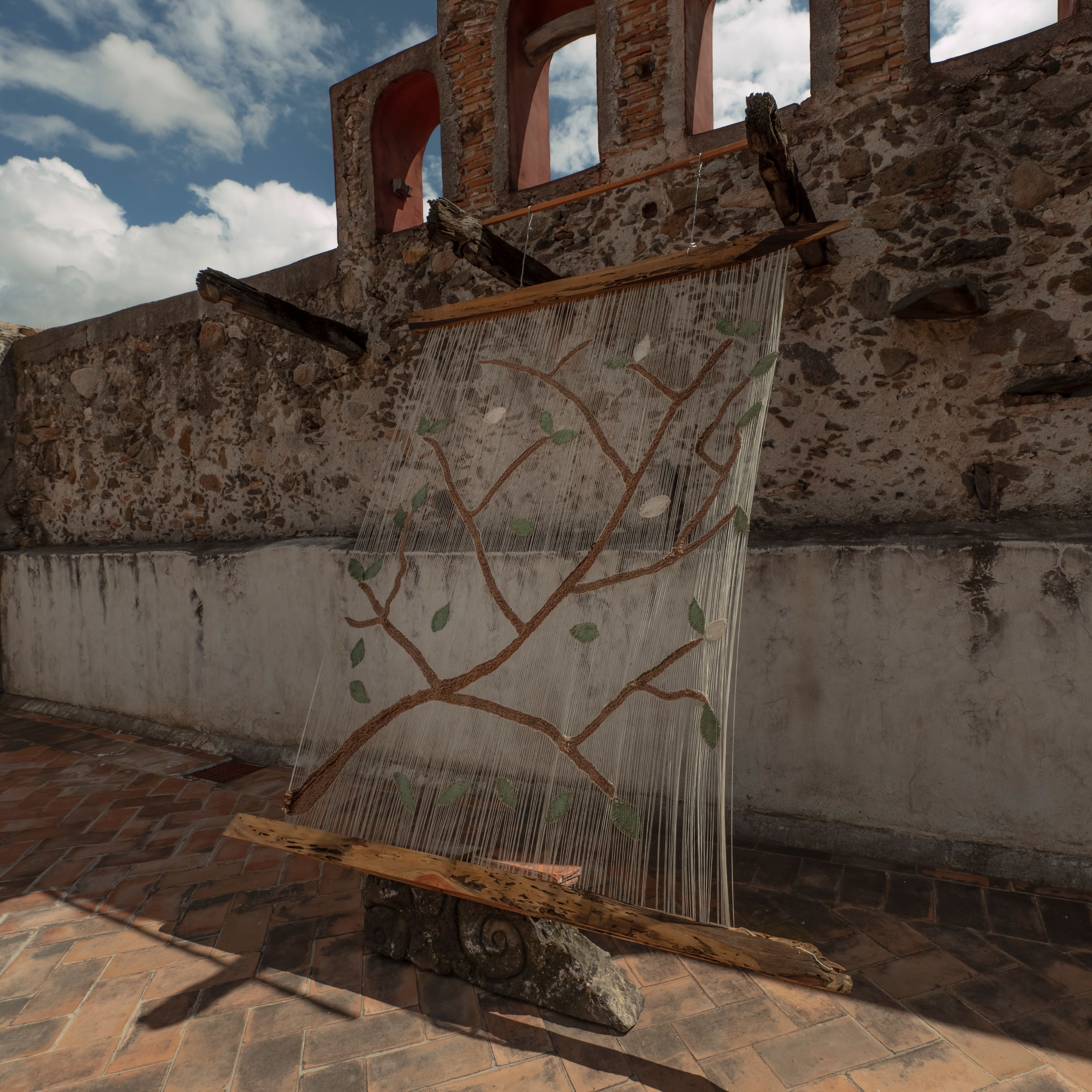 I gathered pita fiber in raw color and naturally dyed, cotton in raw color and naturally dyed, yute and hemp. The cotton was naturally dyed with walnut husk, which was used for the branches, combined with yute and hemp. Part of the pita fiber (Aechmea Magdalanae), was naturally dyed by master artisans from Oaxaca, with marigold and indigo, to obtain this greenish tone. Once I had my fibers ready and shipped, I started setting up the warp on my "custom simple frame loom" of 2 meters by 1.5 Mts., and began with the development of the branches and in the end, the development of the leaf. I made a security thread on every leaf and branch, to secure more our weaving.