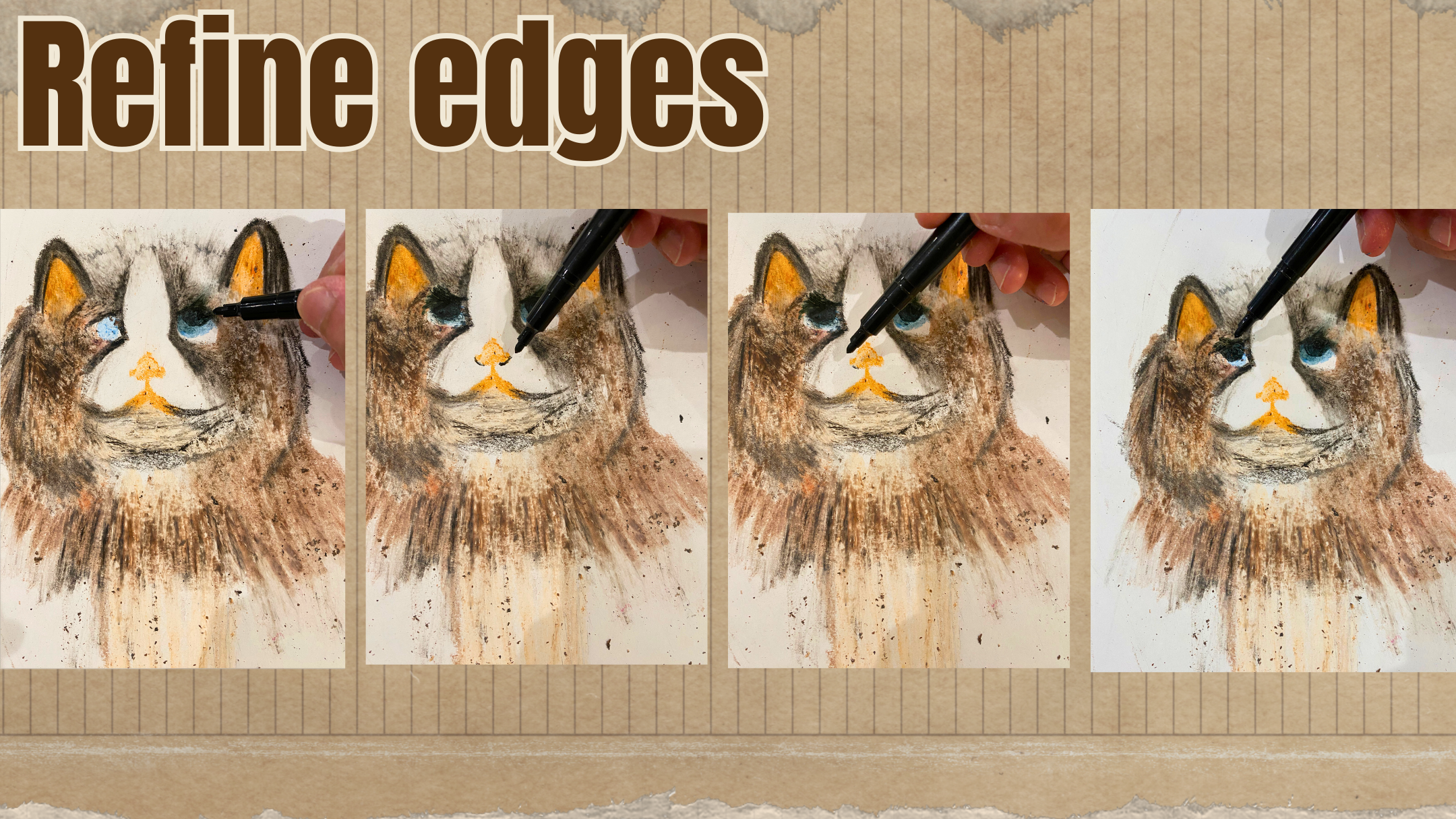 Now it's time to refine the portrait. Use colored pencils to define fur strands, eyelashes, or tiny whiskers. You can also use ink for crisp edges, or white gel pen for bright glints in the eyes.