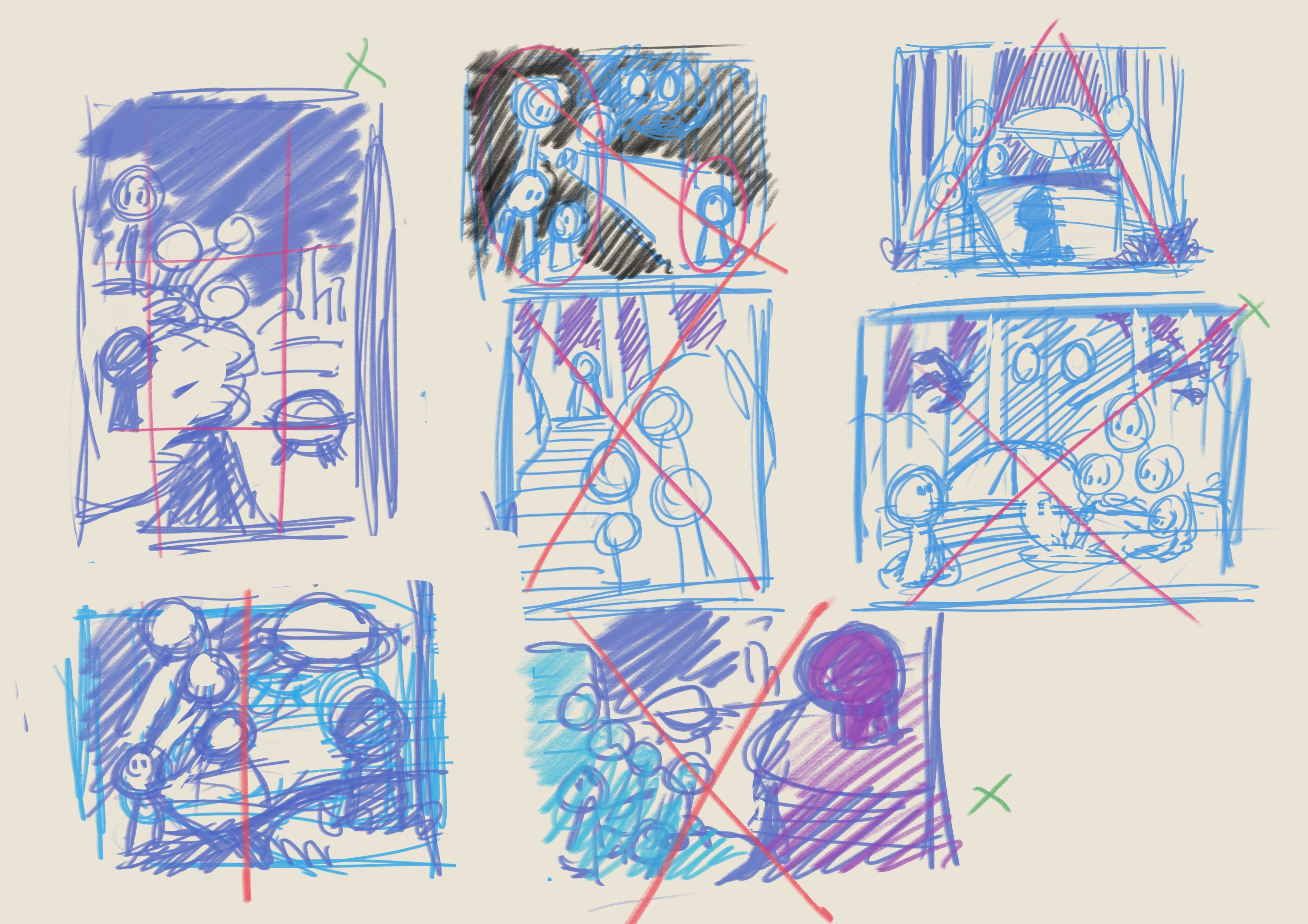 Una volta che ho avuto un'idea chiara, ho proceduto a fare diversi schizzi per trovare la composizione migliore. Si tratta di fare schizzi piccoli e veloci che non richiedono molti dettagli.