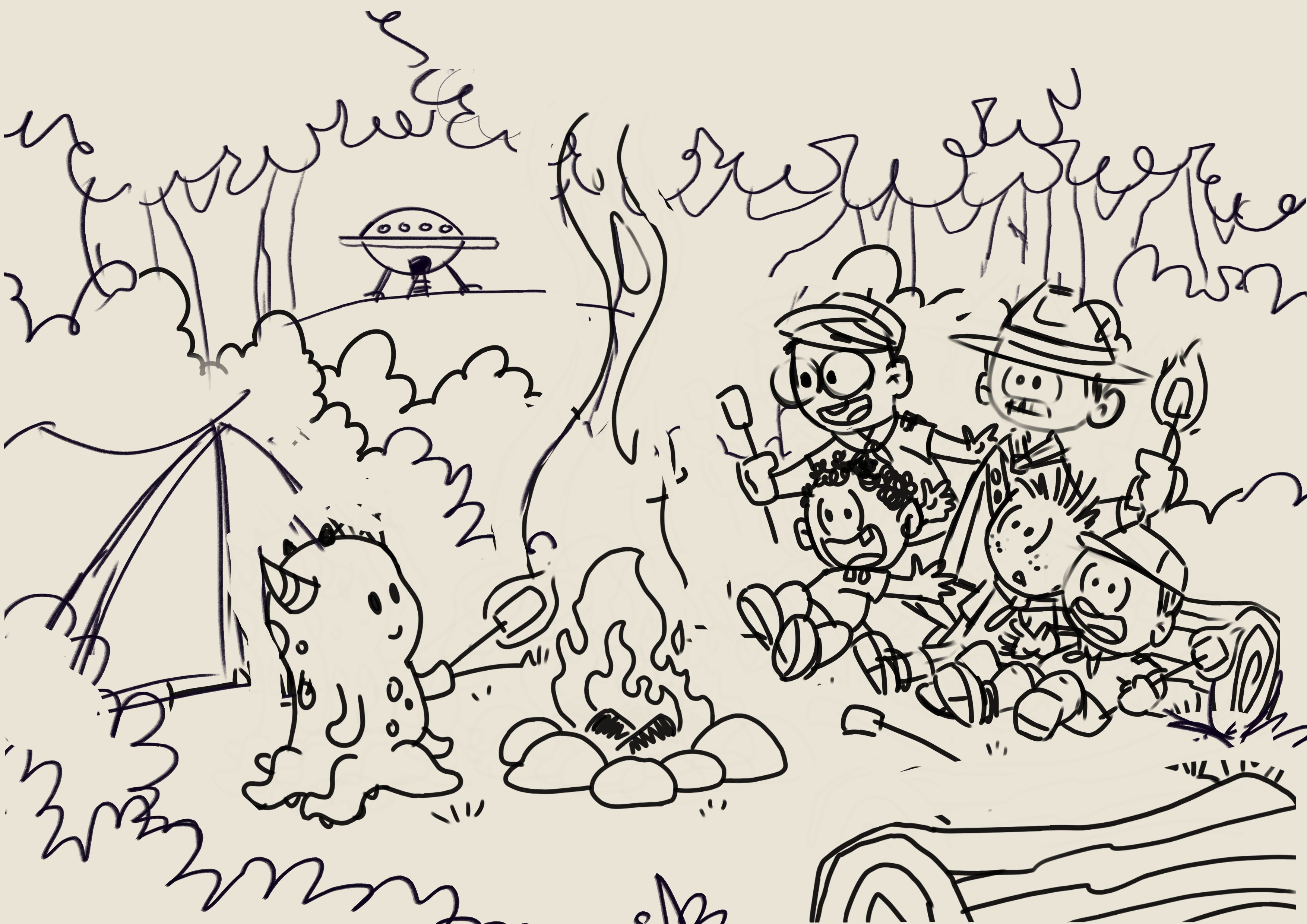 Il primo passo è stato dare corpo all'idea. Ero determinato che la mia illustrazione avrebbe raffigurato bambini e un alieno. Il brainstorming mi ha permesso di esplorare diverse opzioni e di restringere il campo di ciò che volevo mostrare. Questo è uno dei passaggi più importanti per rendere l'illustrazione coerente e avere le idee chiare prima di iniziare a disegnare.
