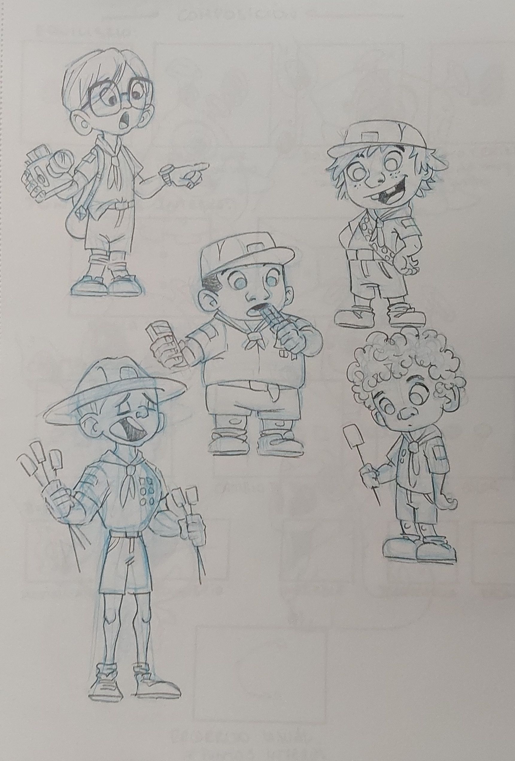 Una vez que tuve claro los personajes que aparecerían en la ilustración procedí a diseñarlos, buscando su personalidad única, que contribuyera a la narración de la historia que queria contar con mi ilustración. Este paso lo realicé analizando papel y lápiz.